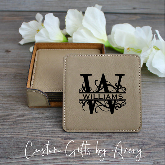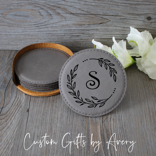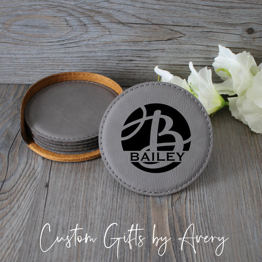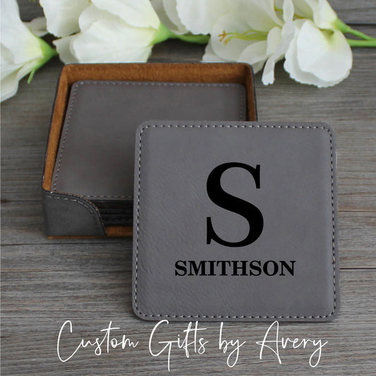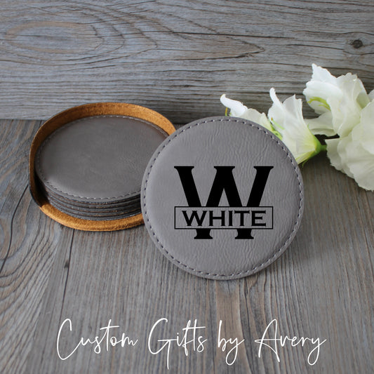 Personalized Leatherette Coasters ~ Set of 6 with Holder