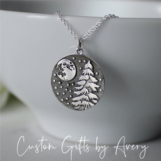 Round Sterling Silver Winter Tree & Full Moon Necklace