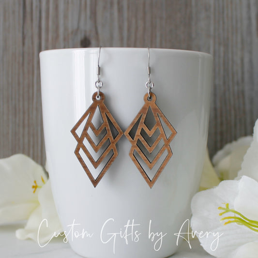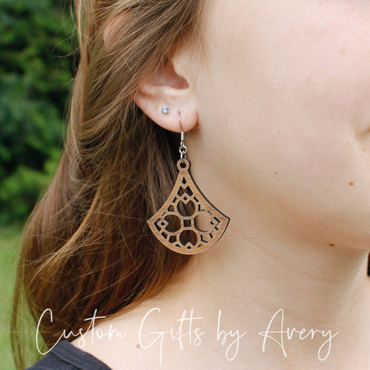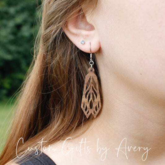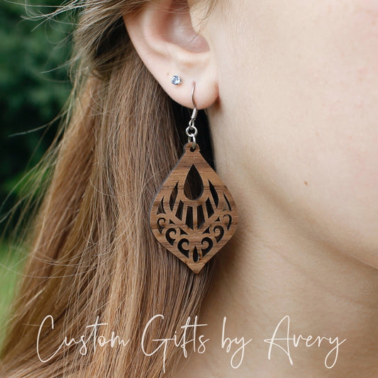 Ornate Teardrop Cutout Earrings in Walnut Wood