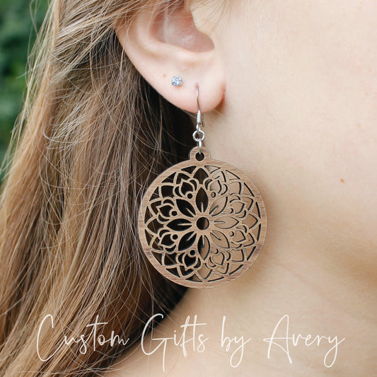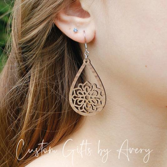 Teardrop Flower Mandala Earrings in Walnut Wood