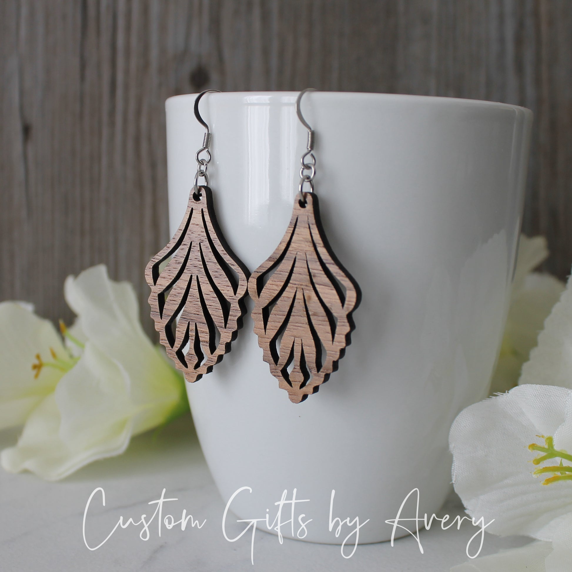 These delicate and intricate earrings have been laser cut from walnut wood. Despite their size, they are incredibly lightweight and very comfortable to wear. They hang from 316L grade stainless steel earring hooks. Stainless steel hooks are the same grade used in industrial and food-processing applications- they are moisture resistant moisture and will not oxidize.