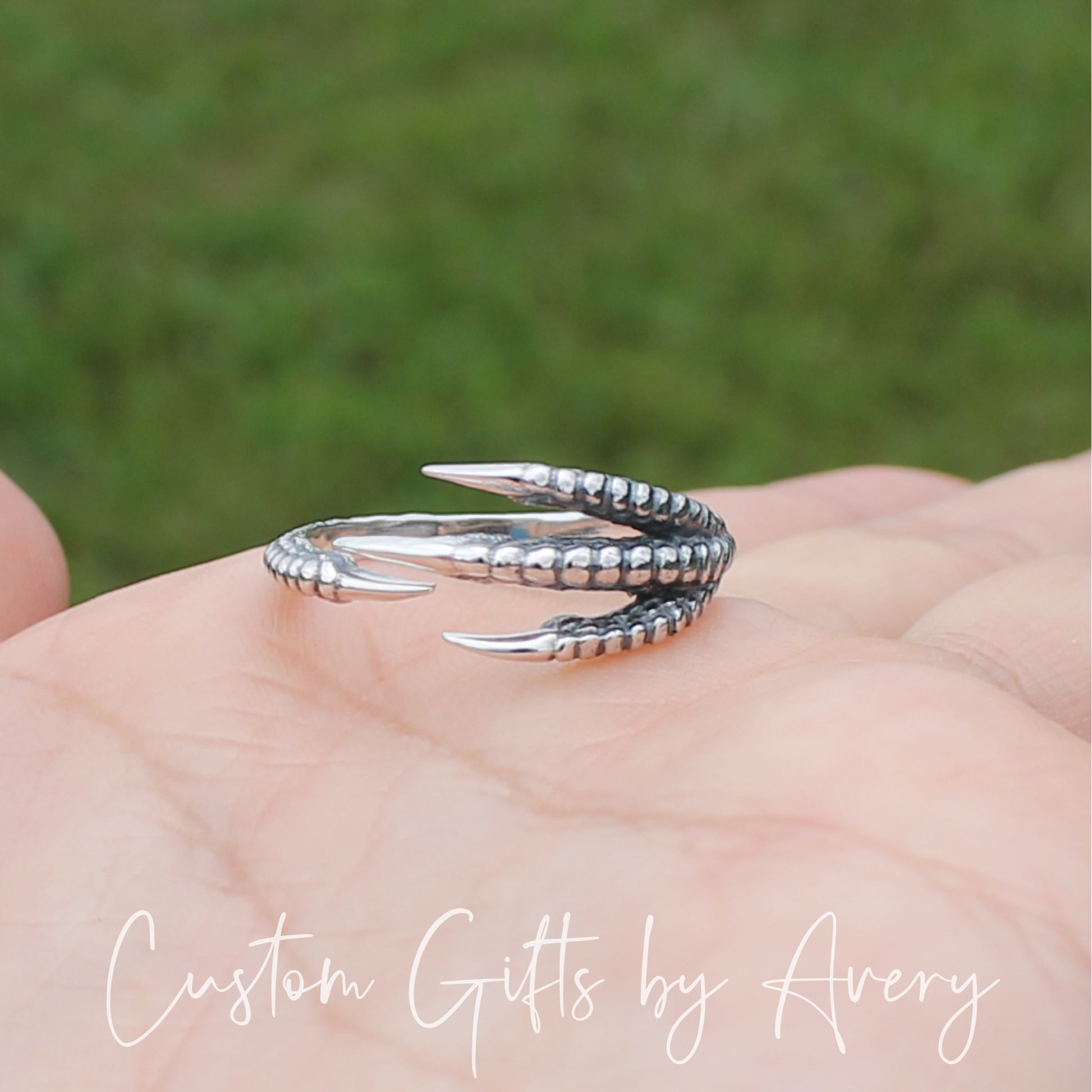 This incredibly detailed claw ring is created from solid .925 sterling silver. With 3 sharp claws on one side and one on the other, which animal it belongs to is up you! The detailing goes all the way around the band.