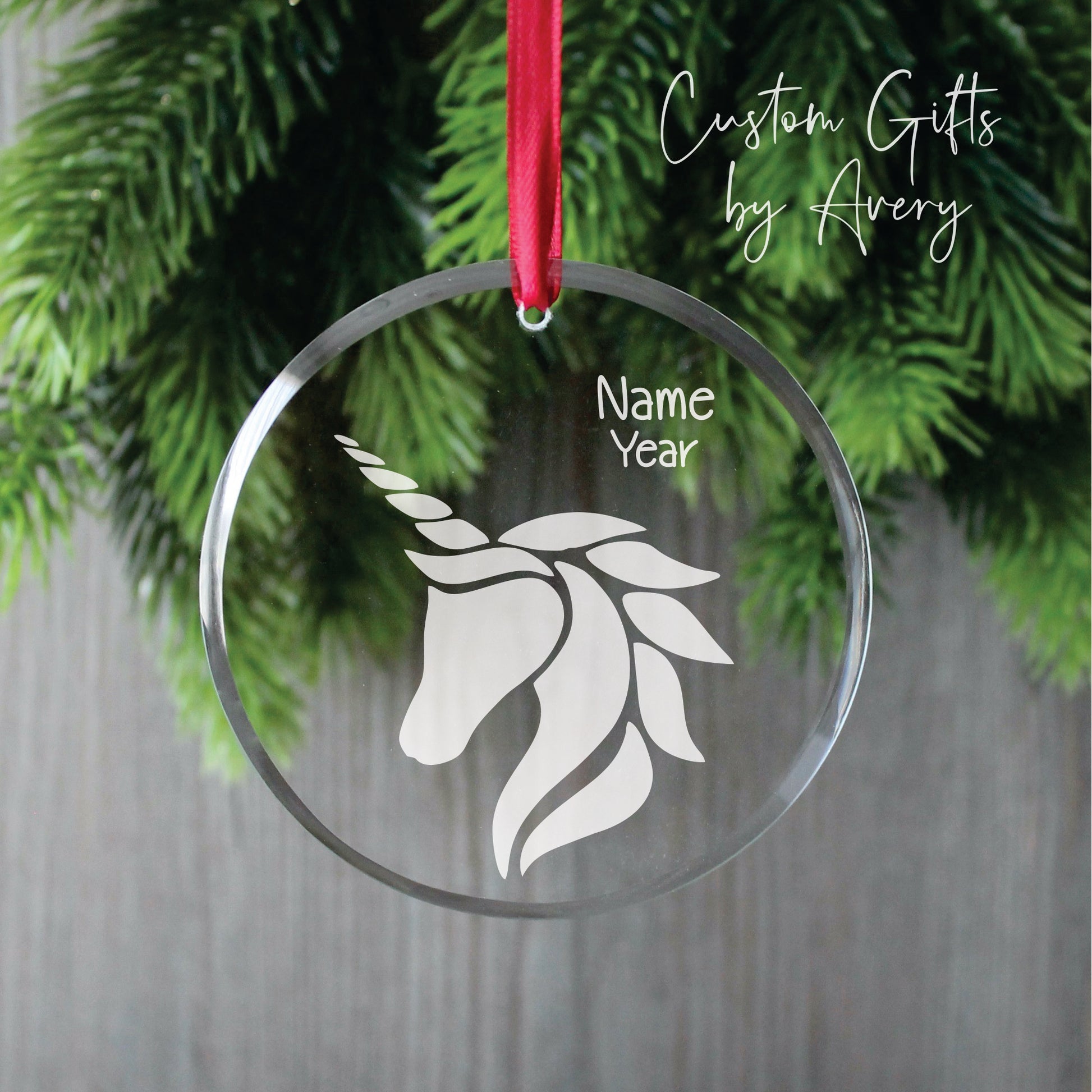 This laser etched glass ornament is an elegant addition to your tree or can be appreciated year round as a sun catcher. Laser engraving is permanent and will not scratch or rub off with time. They have elegant beveled edges and are 3.5 inches in diameter.