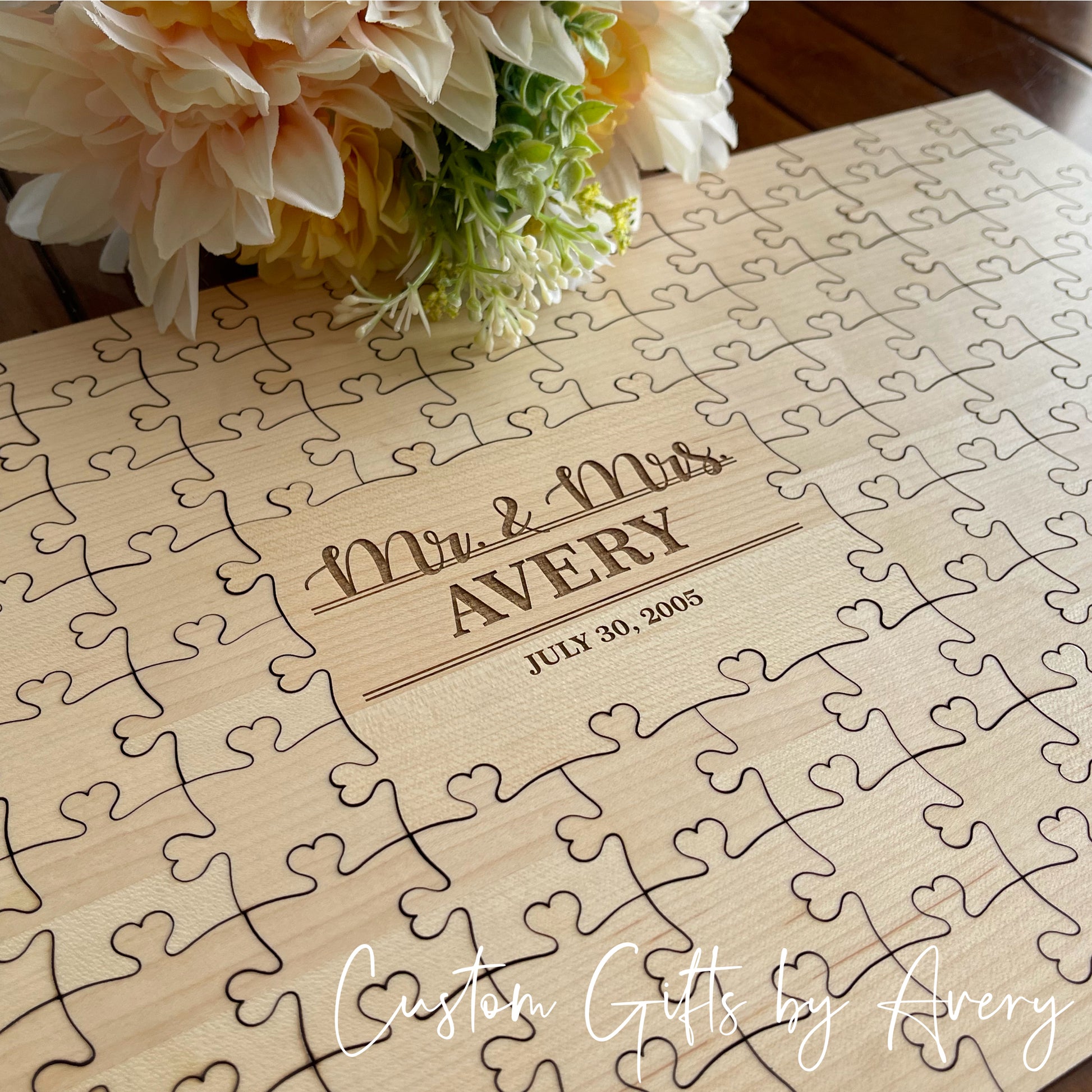 This beautiful guest book alternative is laser engraved on maple wood. Your personalized center piece fits anywhere in your puzzle, allowing you greater freedom in layout. Specialty pen, puzzle sign & stand, and extra pieces included. Puzzle pieces are marked on the back to ensure your guests leave their message on the correct side and are designed to fit anywhere within the puzzle (edges & corners excluded of course).