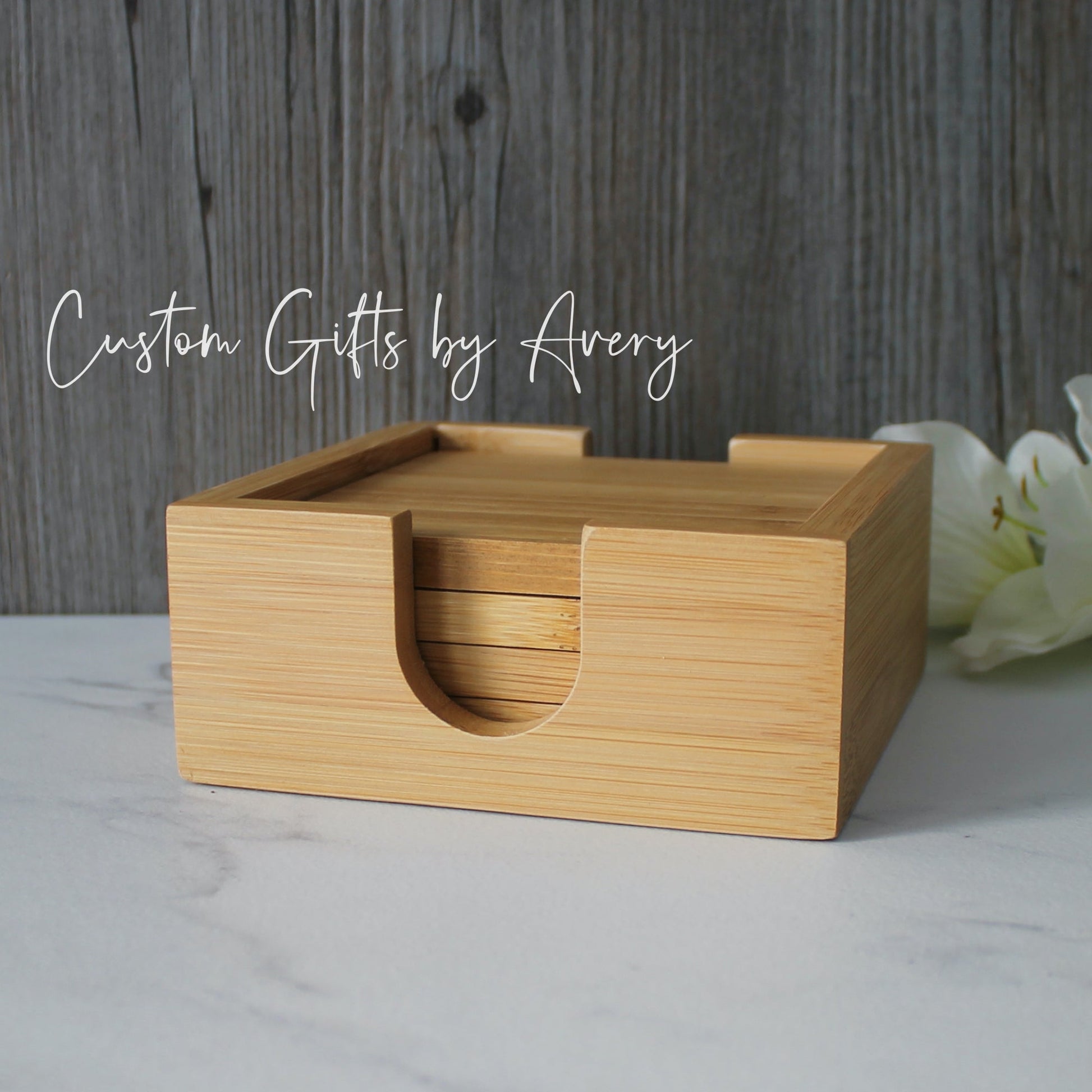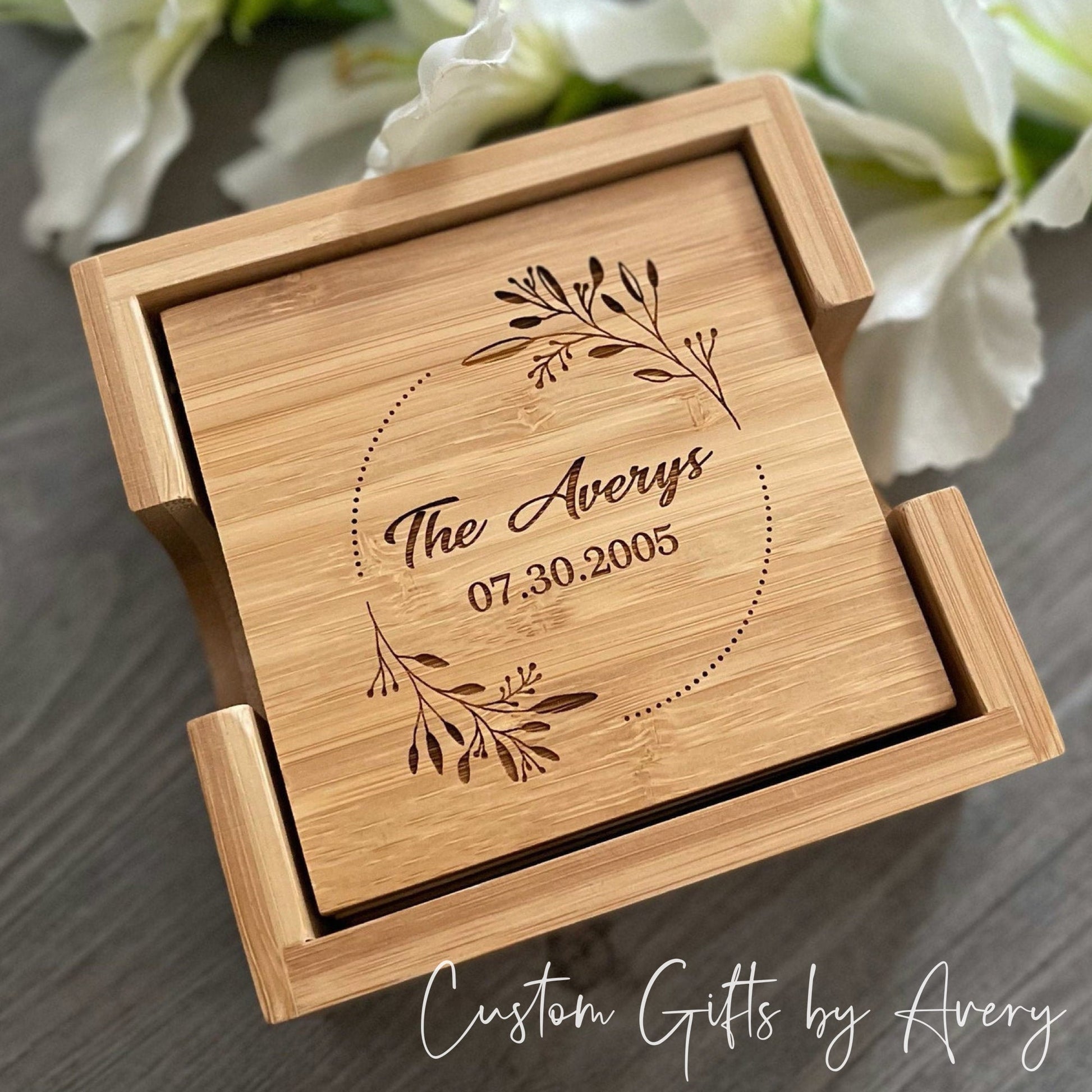These personalized laser engraved bamboo coasters come as a set of 4 with the holder shown. These make a great housewarming, engagement, wedding, or anniversary gift.