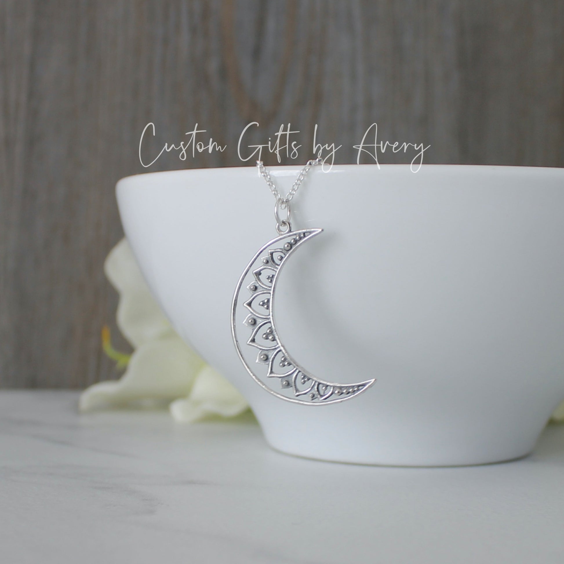 Crafted in solid .925 sterling silver, decorative Cresent moon mandala is truly a beautiful piece. The open work design of this pendant is a mixture of polished and oxidized silver to bring out the finer details in this piece.