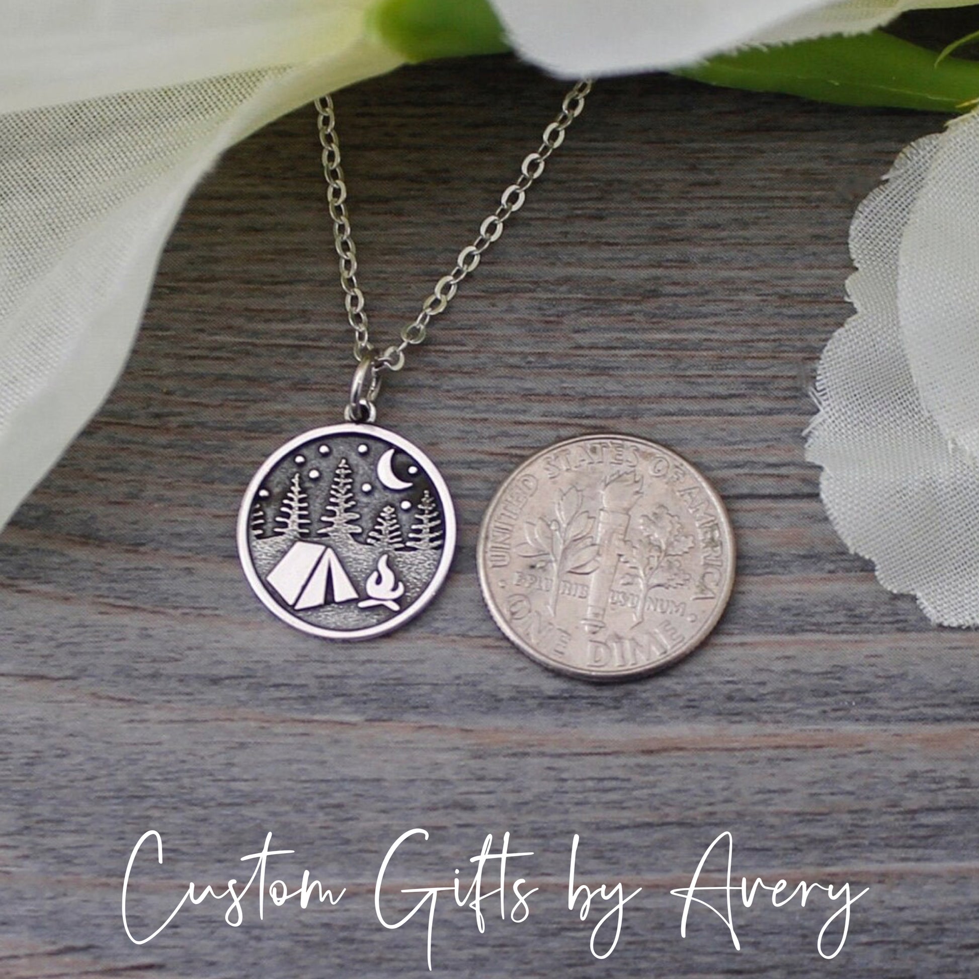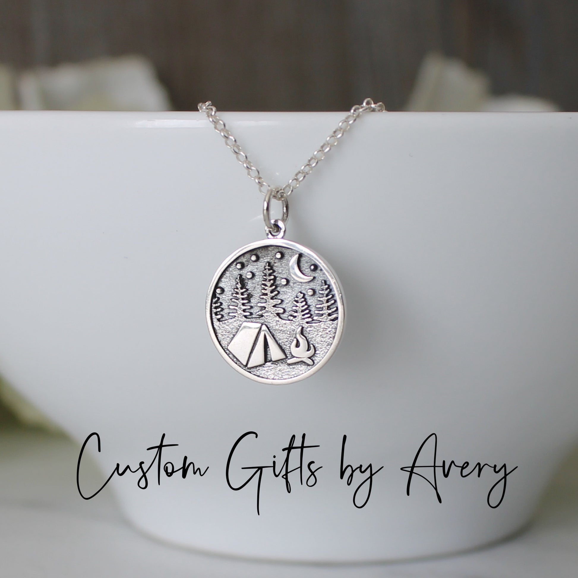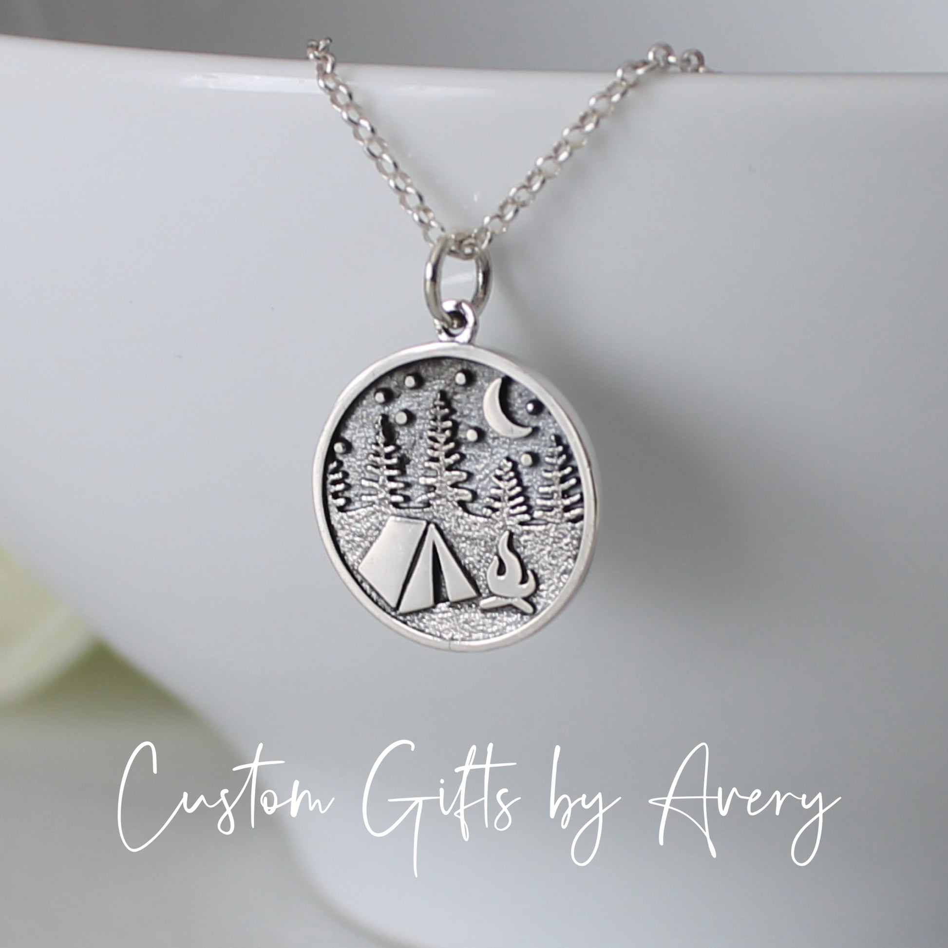 Crafted in solid sterling silver this camping charm that features a moonlight night complete with twinkling stars and comforting campfire.