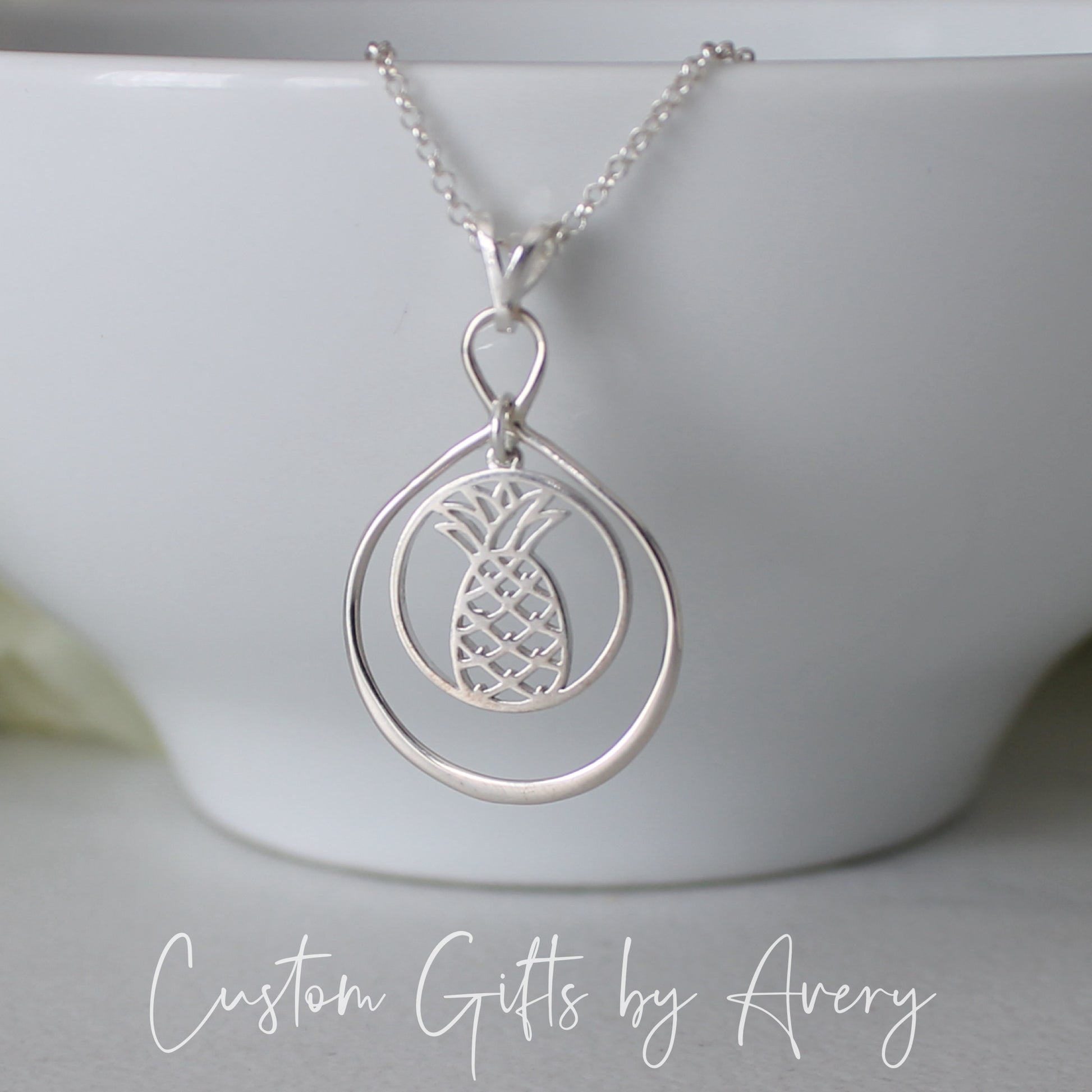 Pineapples are known as a symbol of warm welcome, hospitality, and celebration. The centre pineapple swings freely within the infinity loop. It is crafted in sterling silver.