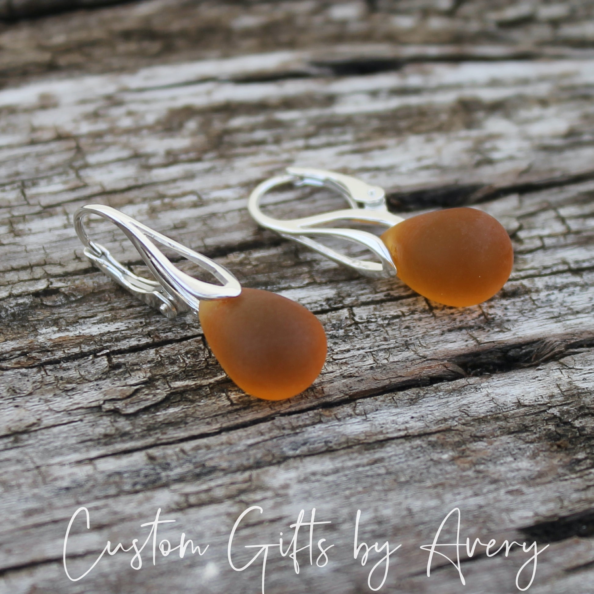 Dark Amber Cultured Sea Glass & Sterling Silver Teardrop Earrings