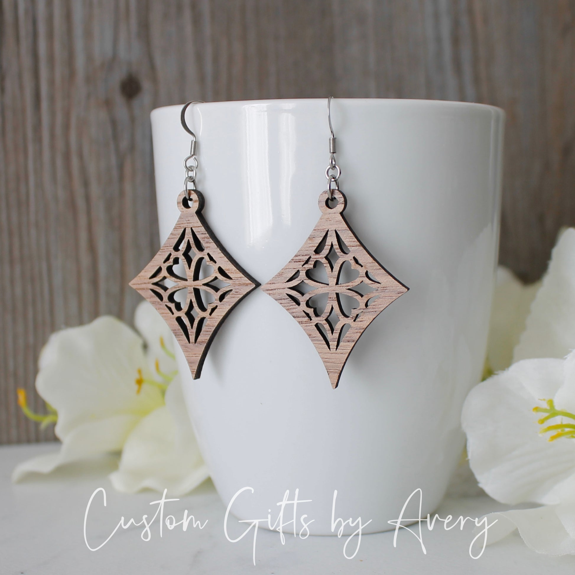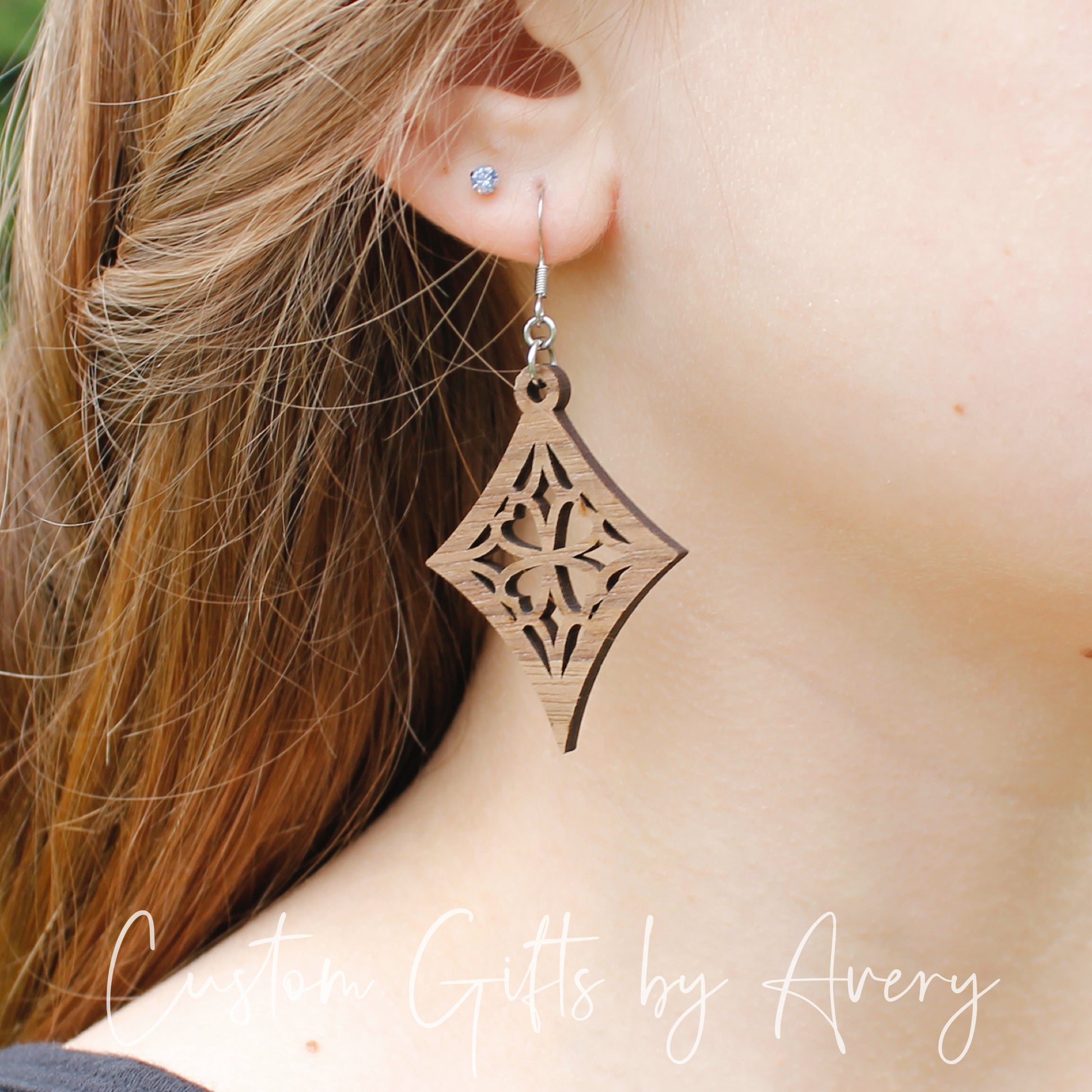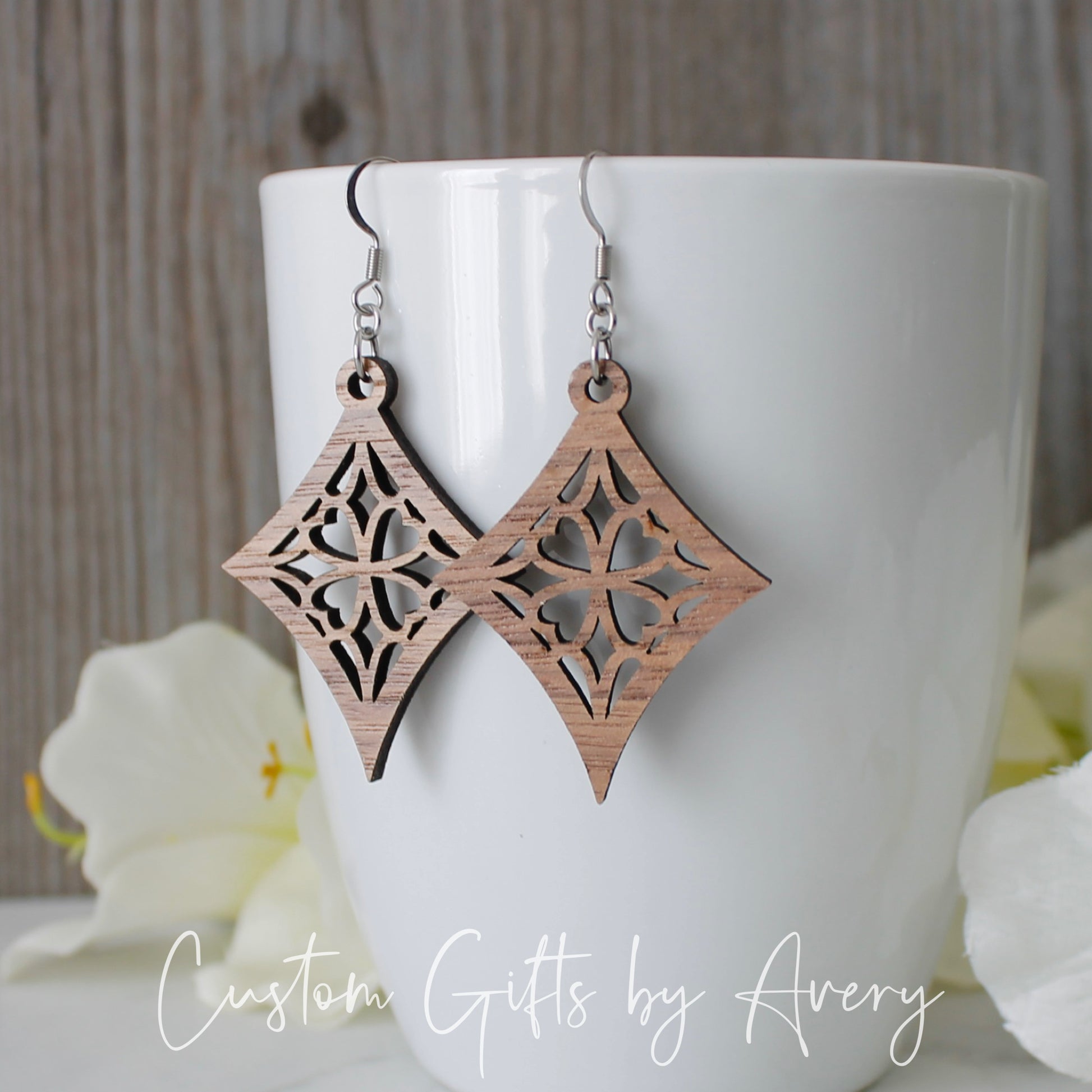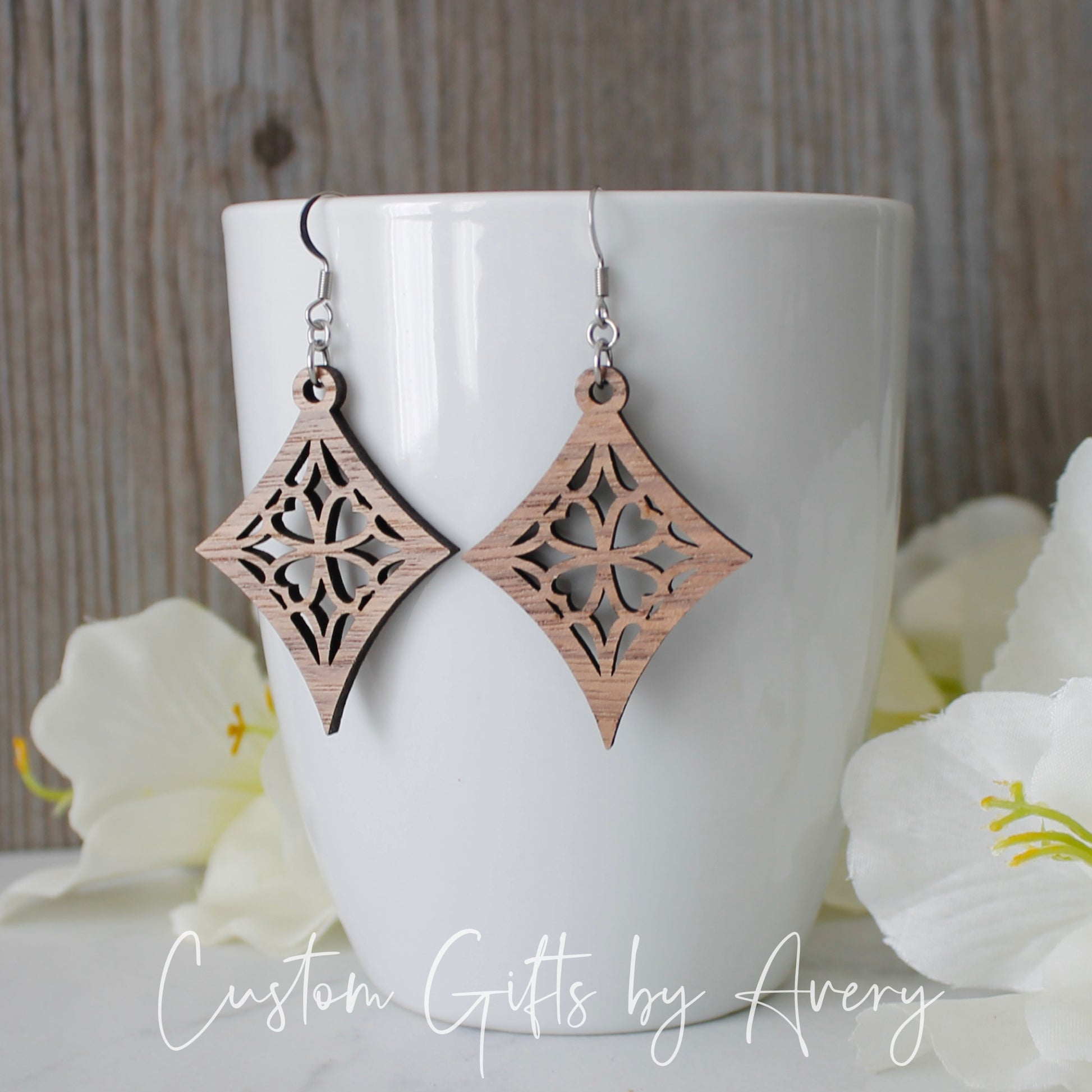 These delicate and intricate earrings have been laser cut from walnut wood. Despite their size, they are incredibly lightweight and very comfortable to wear. They hang from 316L grade stainless steel earring hooks. Stainless steel hooks are the same grade used in industrial and food-processing applications- they are moisture resistant moisture and will not oxidize.
