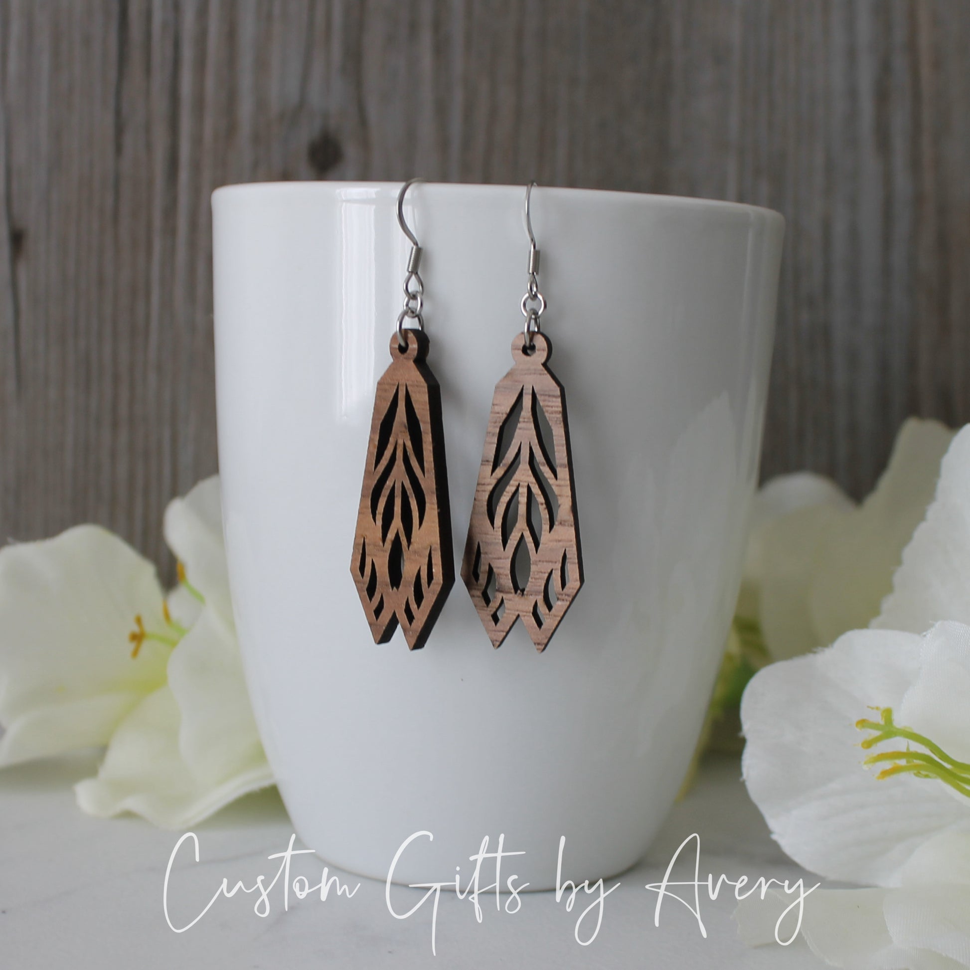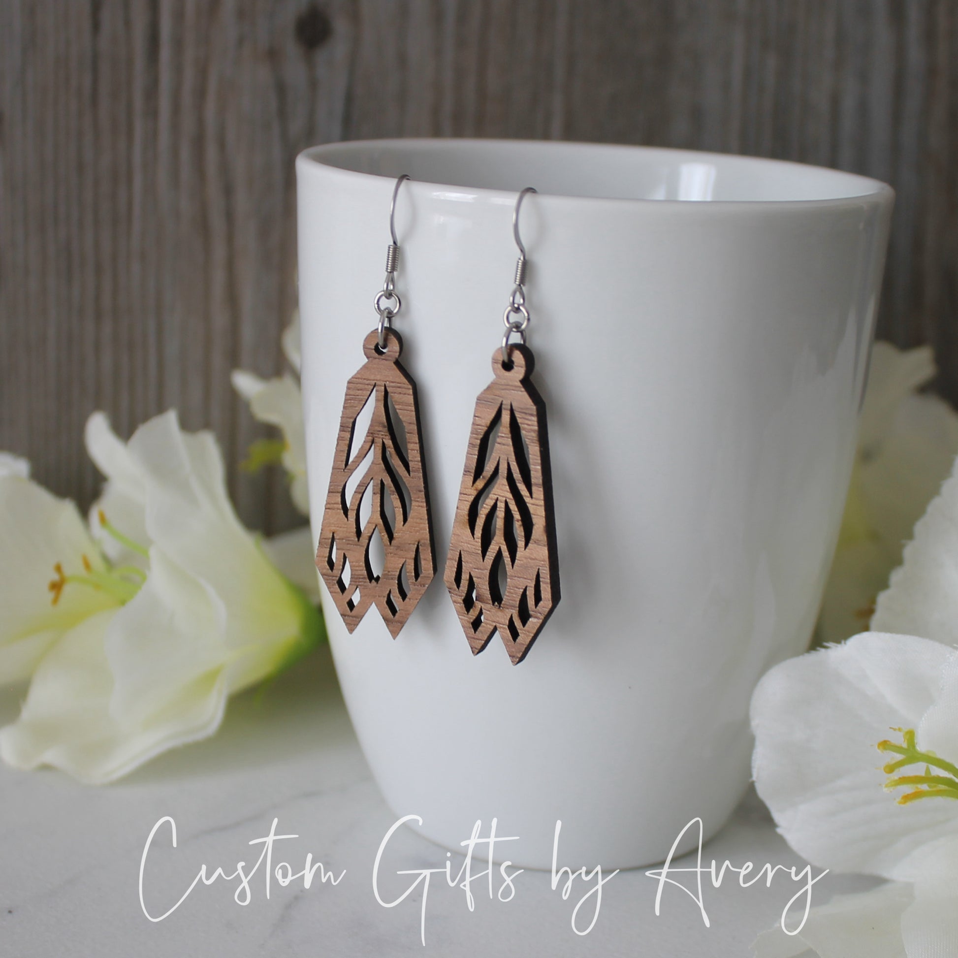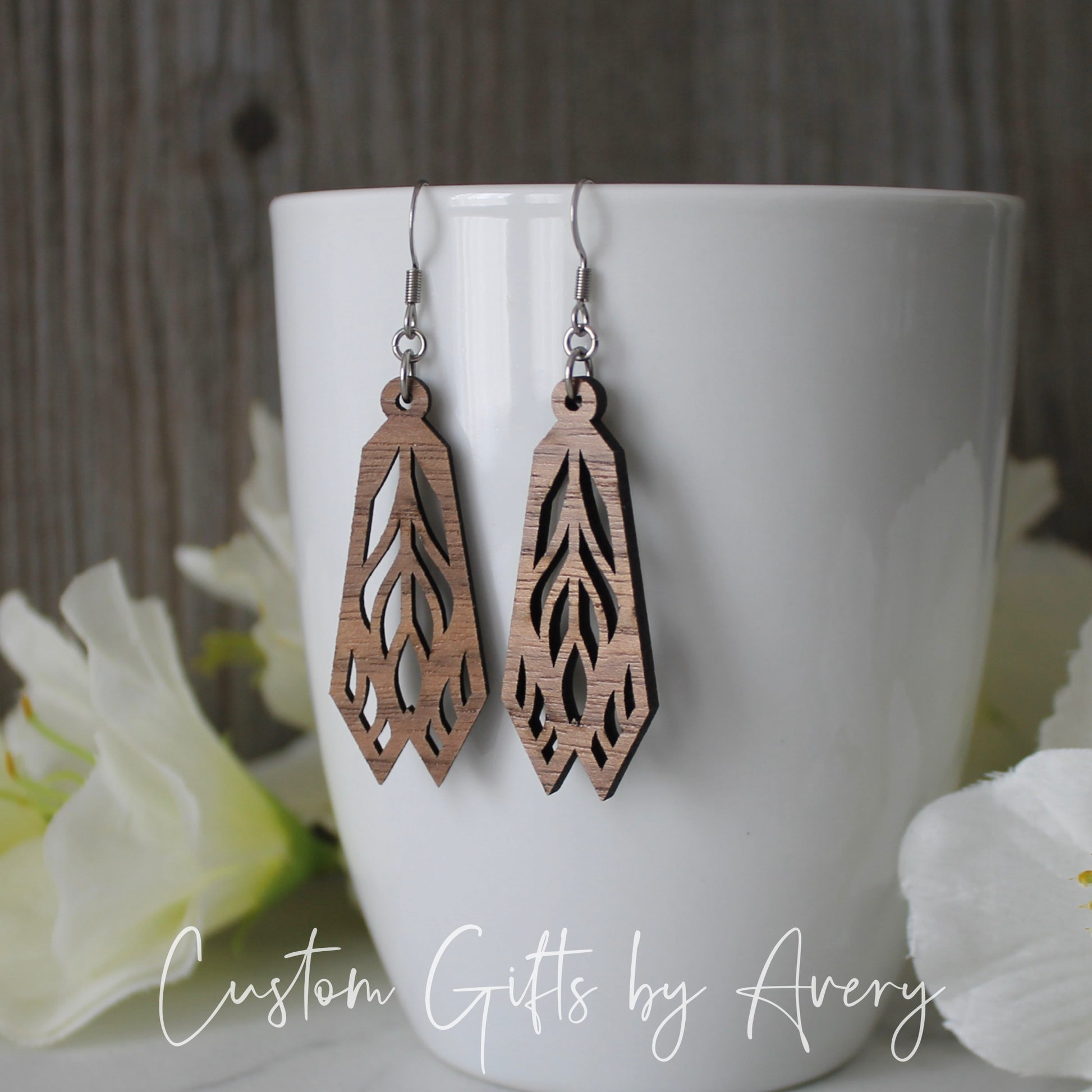 These delicate and intricate earrings have been laser cut from walnut wood. Despite their size, they are incredibly lightweight and very comfortable to wear. They hang from 316L grade stainless steel earring hooks. Stainless steel hooks are the same grade used in industrial and food-processing applications- they are moisture resistant moisture and will not oxidize.