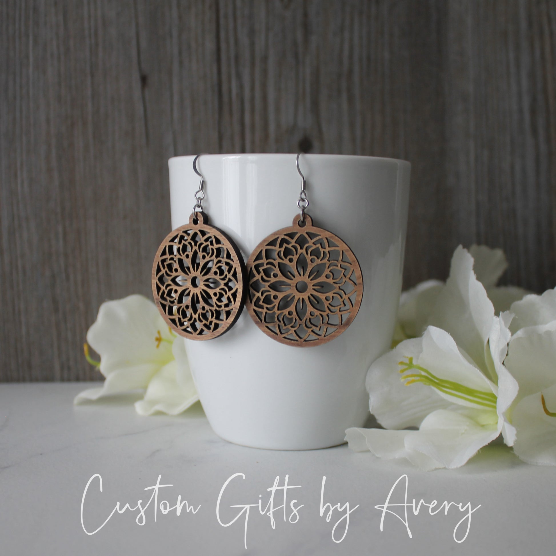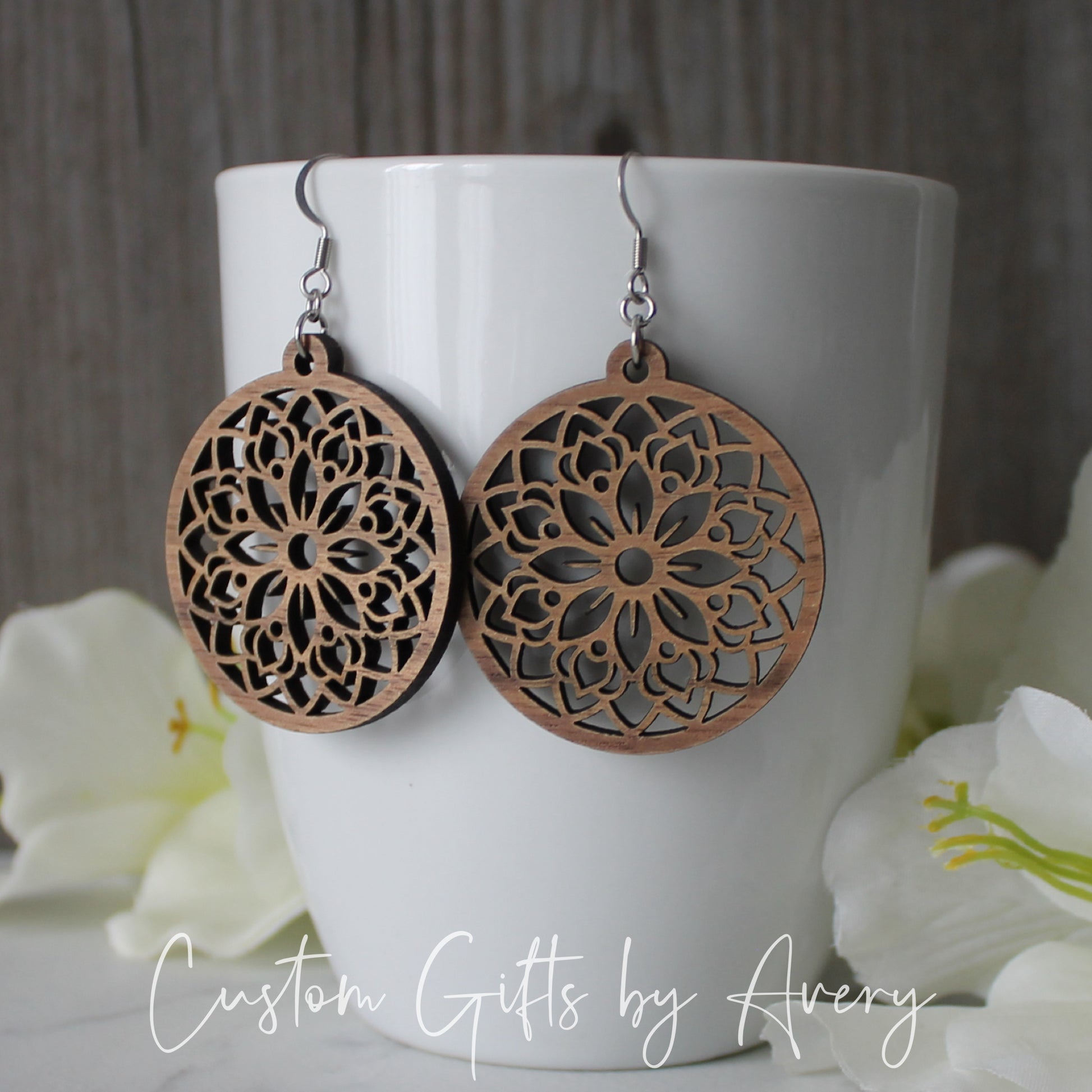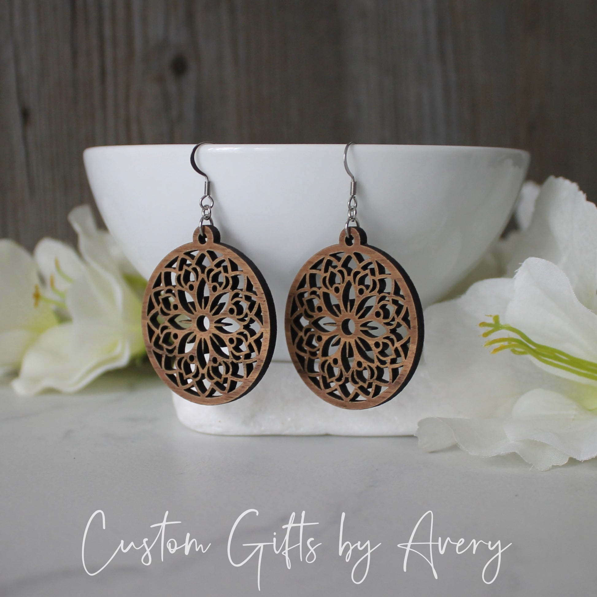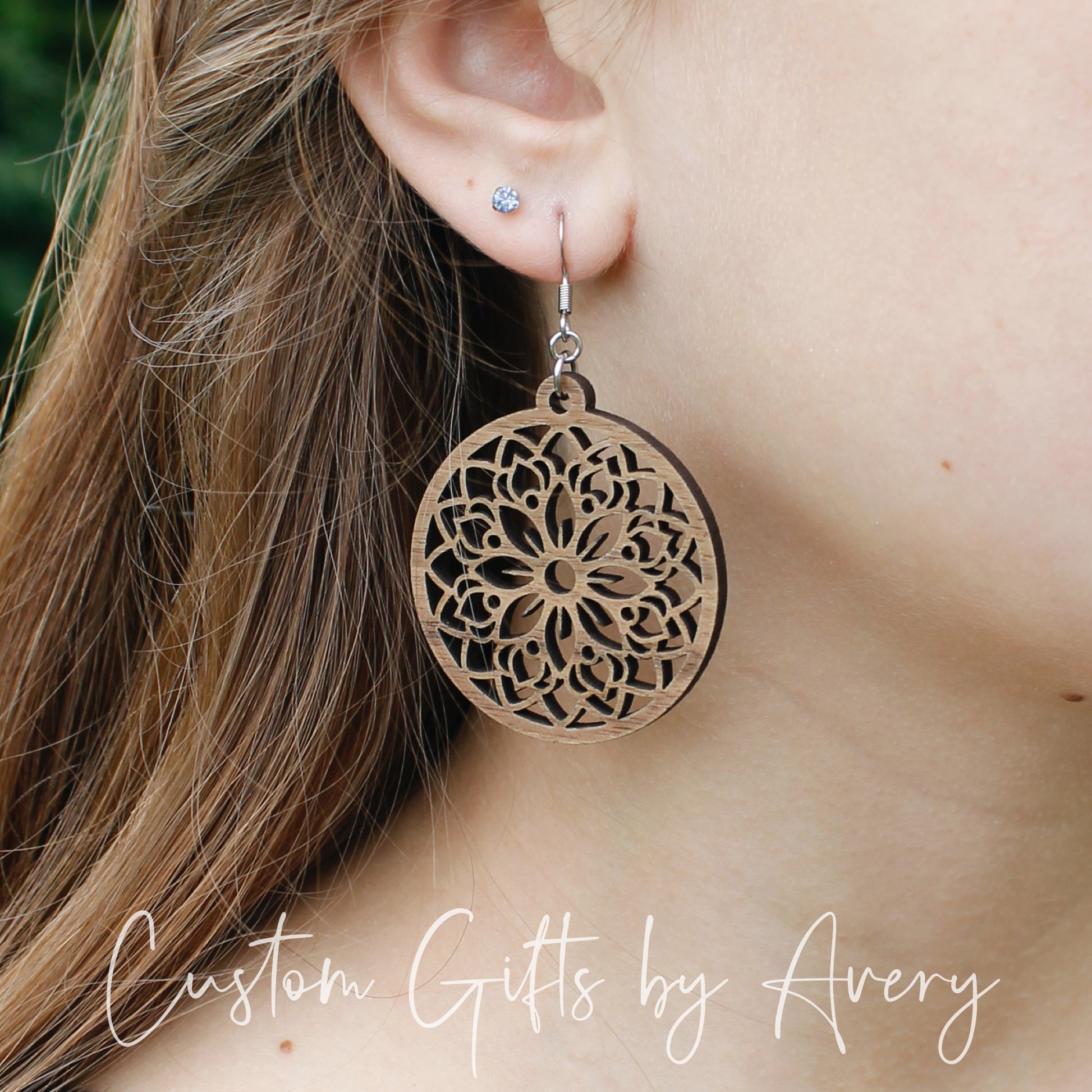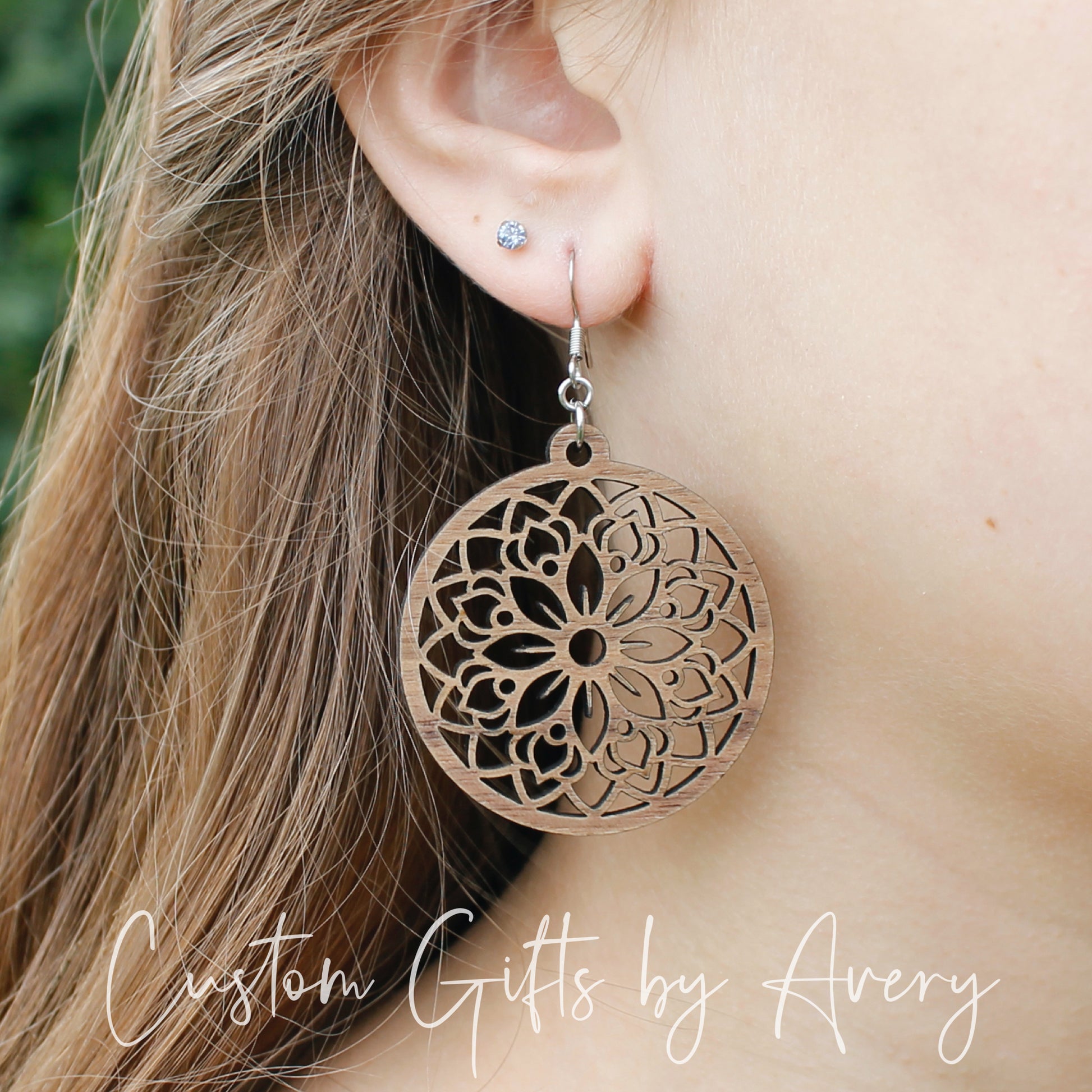 These intricate earrings have been laser cut from walnut wood. Despite their size, they are incredibly lightweight and very comfortable to wear. They hang from 316L grade stainless steel earring hooks. Stainless steel hooks are the same grade used in industrial and food-processing applications- they are moisture resistant moisture and will not oxidize.