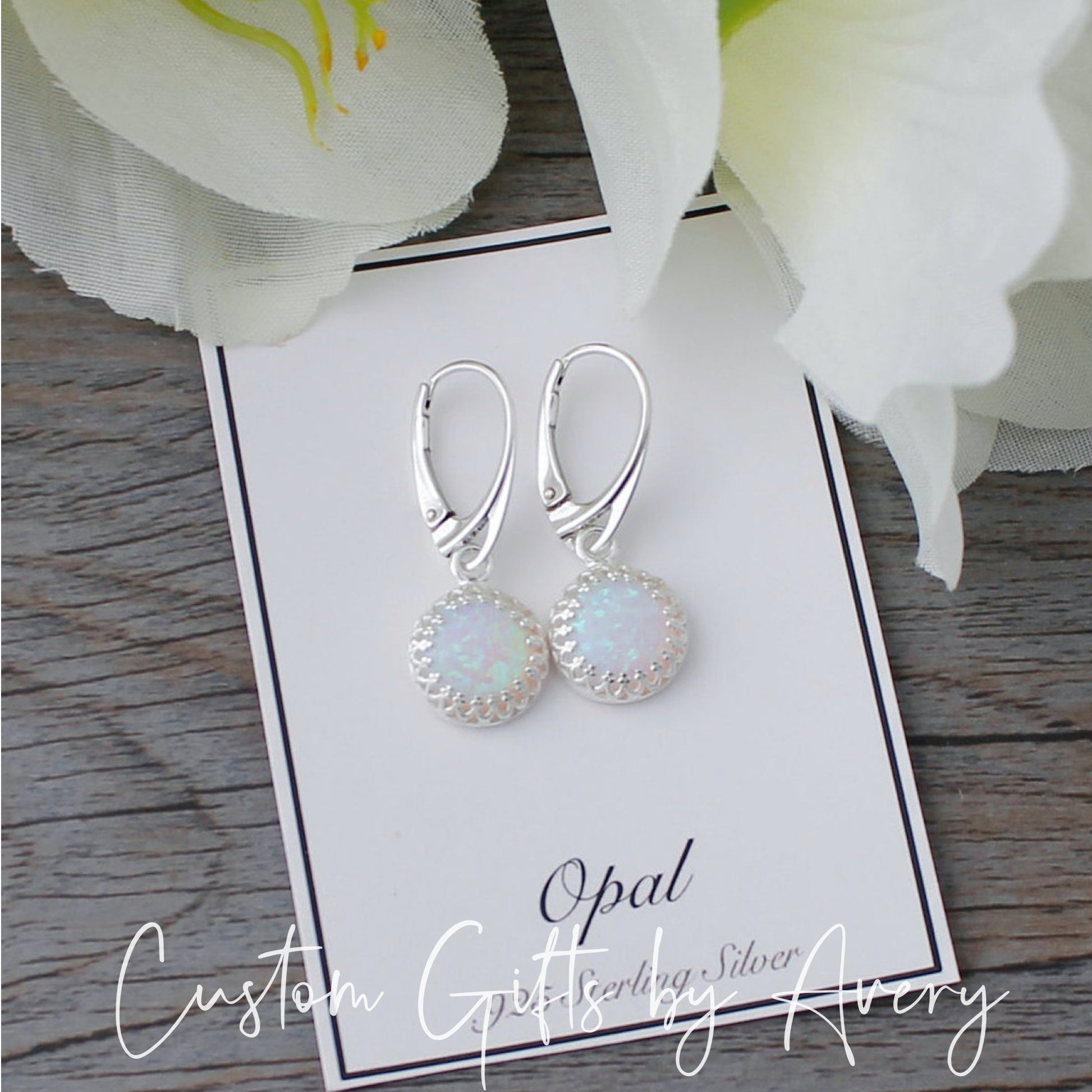 Absolutely gorgeous vintage style opal earrings. The white 10mm lab-created opals are set in sterling silver Victorian crown gallery settings. These opals have a beautiful pinfire. These earrings are a perfect gift for someone whose birthday is in October, or for those looking for a classic and elegant touch.