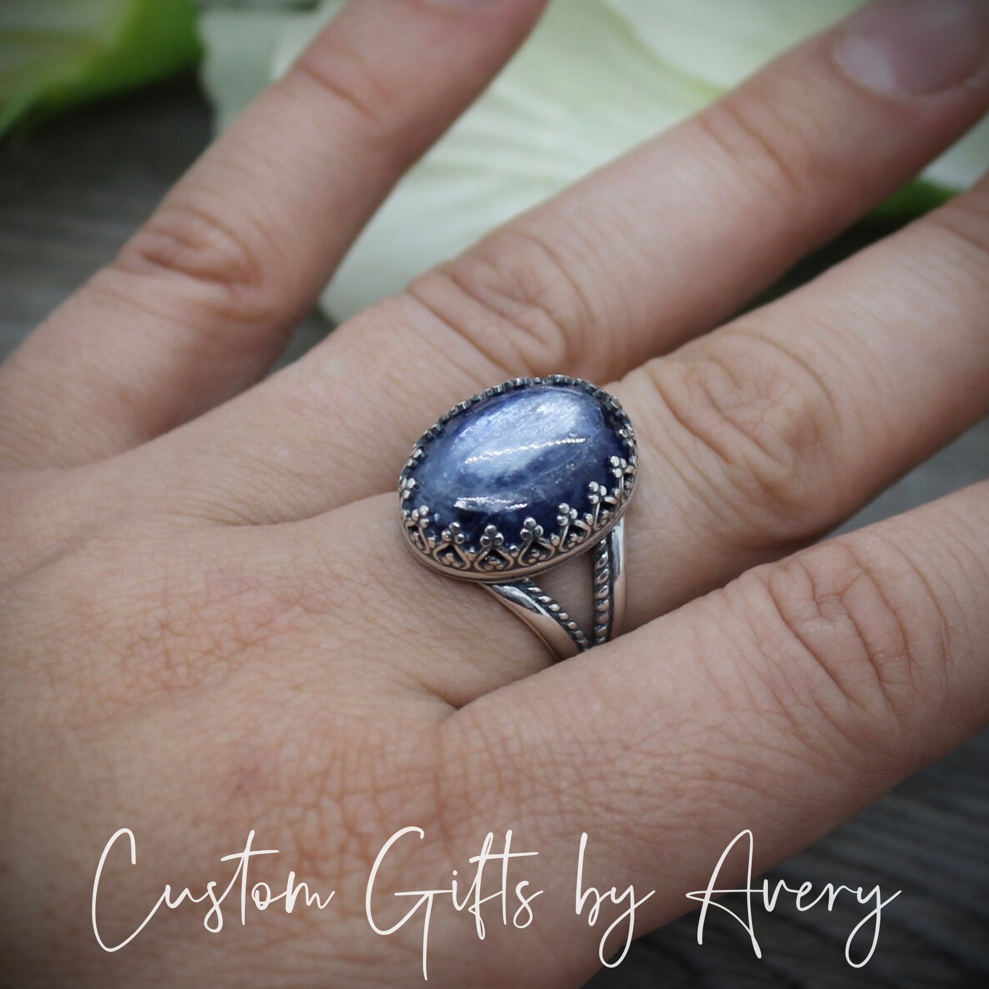 An absolutely gorgeous blue Kyanite ring! This antiqued sterling silver split-shank ring features a large, 18x13 kyanite gemstone. The inner edges of the split shank are lined with a twist rope design. This ring has a nice solid band. This is a heavier ring with 8.351 grams of sterling silver. The darker silver tones and blue in this ring are beautiful.