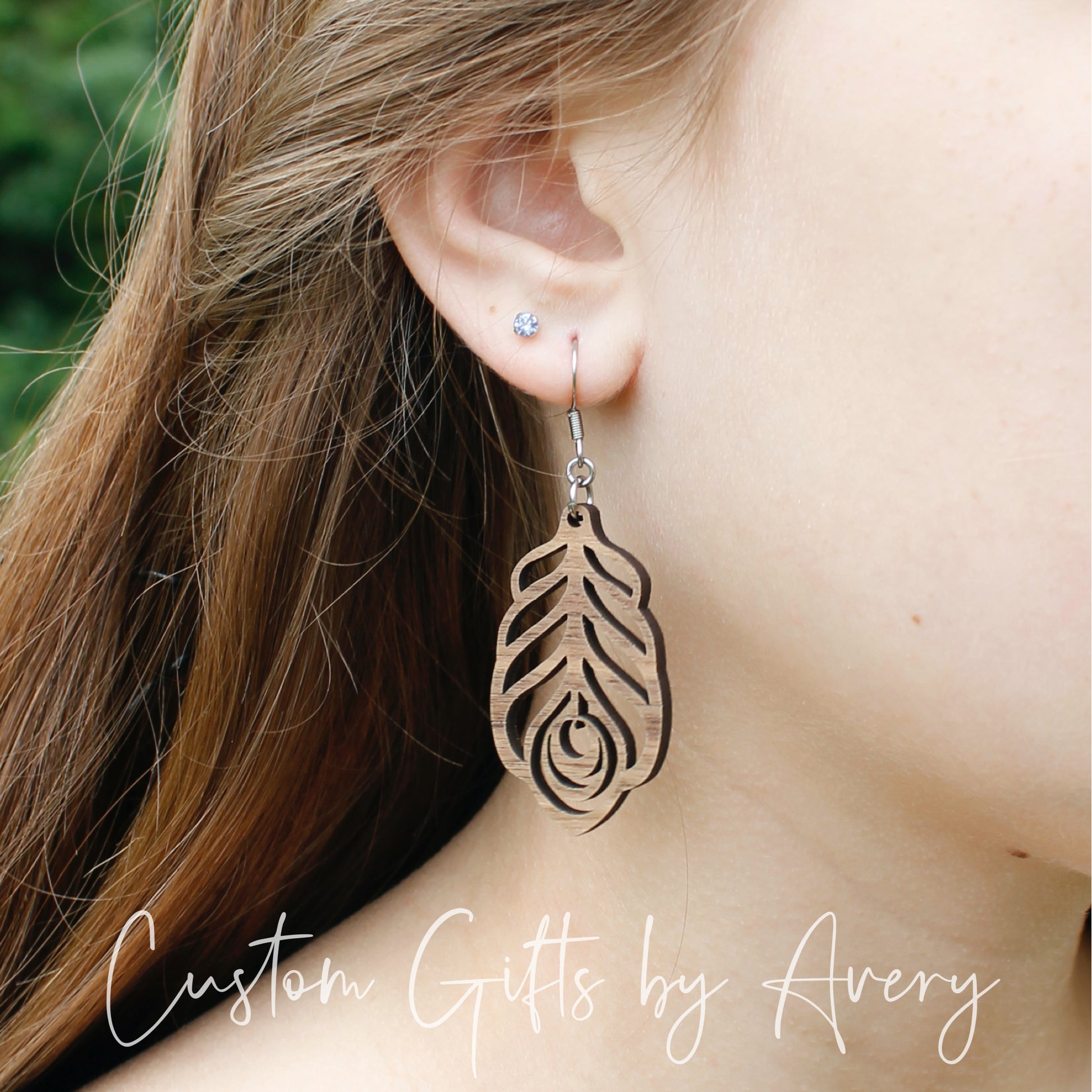 Peacock Feather Earrings in Walnut Wood