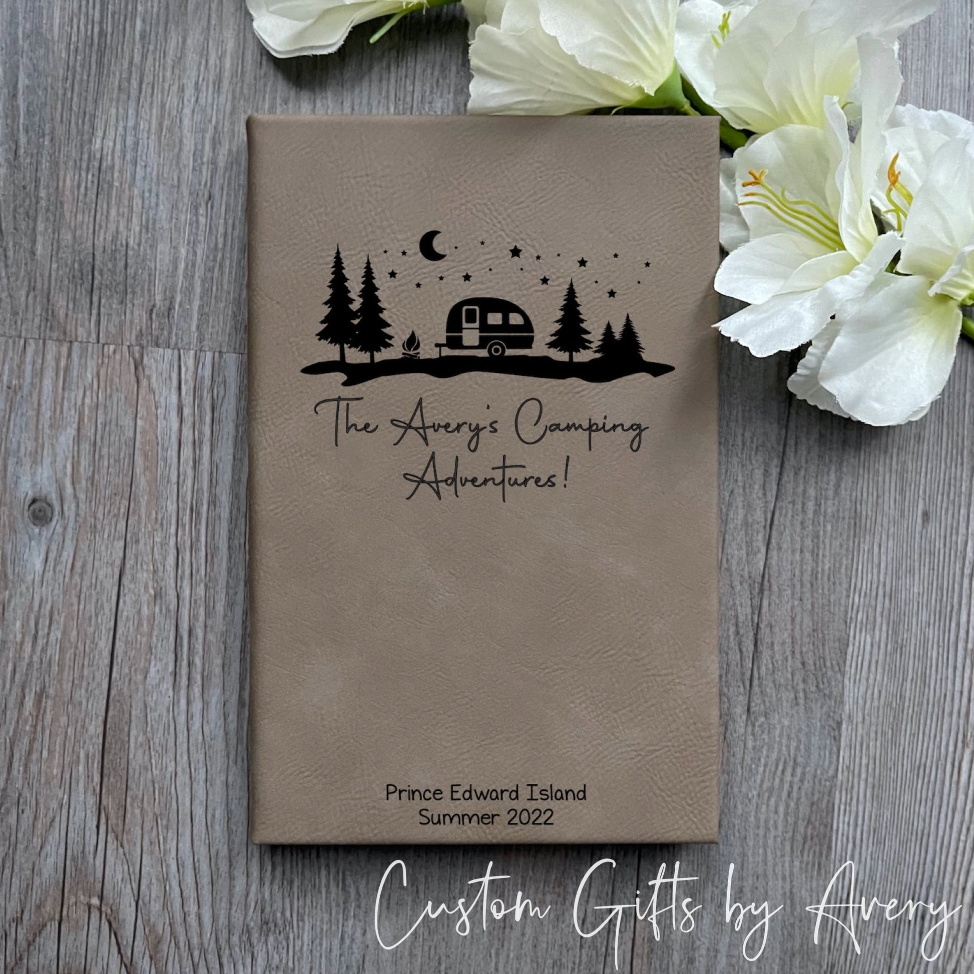 A high quality, beautifully engraved hardcover vegan leatherette notebook. This laser engraved notebook is perfect for recording your favourite camping and travel memories. The richly textured vegan leather material is water-resistant, easy to clean and durable enough for the rigors of daily use. The high-quality workmanship of each journal is sure to impress every recipient with its elegant individuality. Journals are easy to wipe clean (damp cloth with soap and water) and do not leave fingerprints.