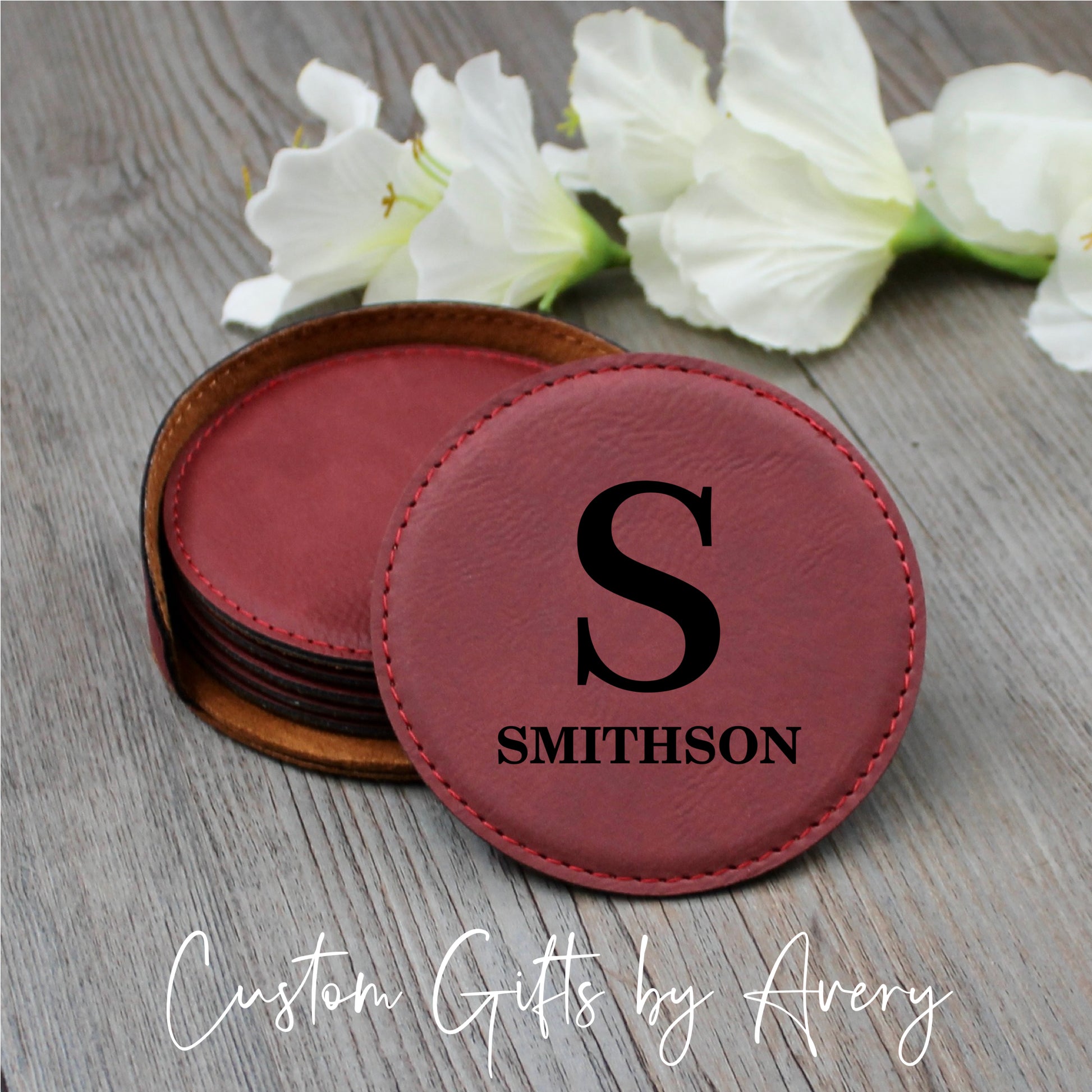 Personalized Leatherette Coasters ~ Set of 6 with Holder