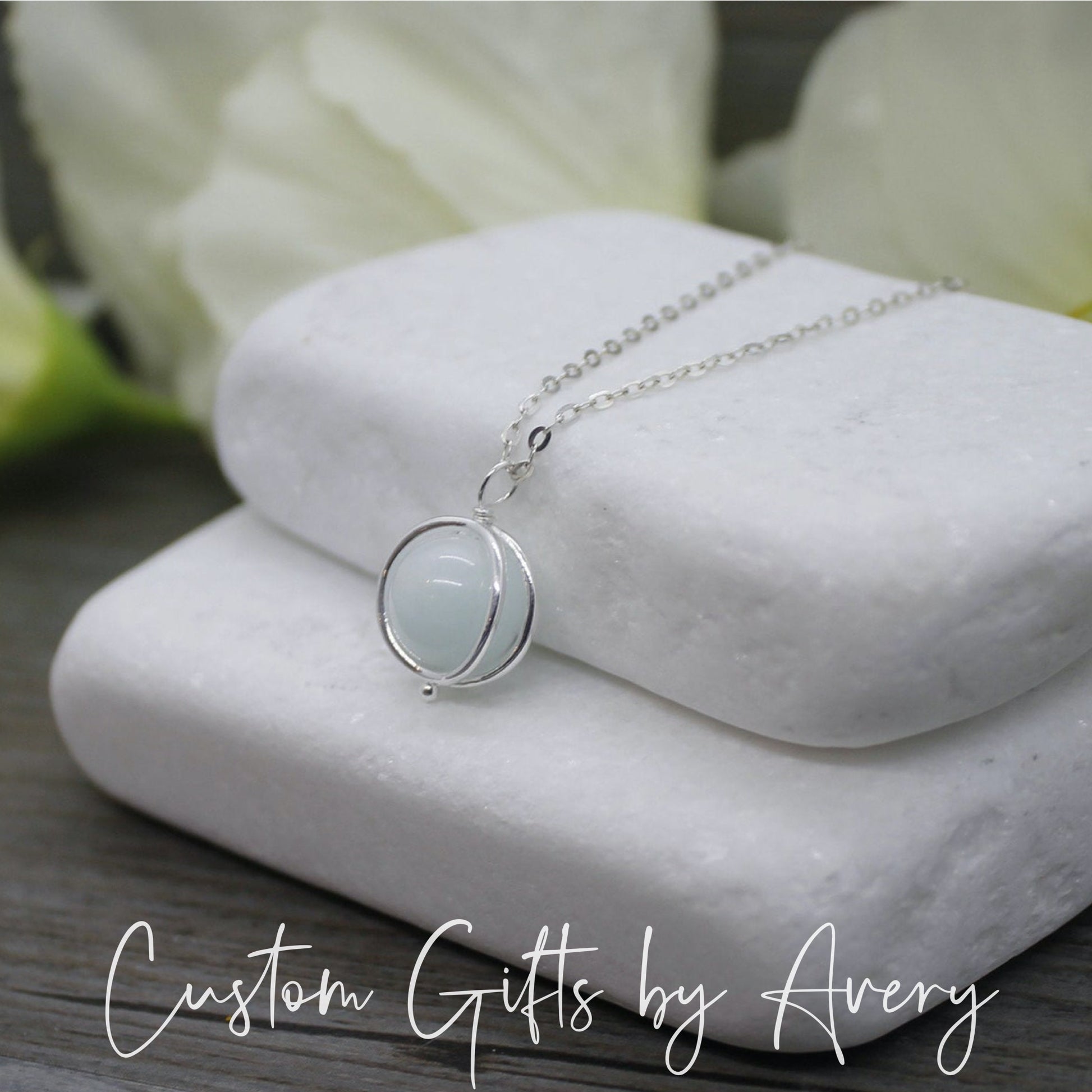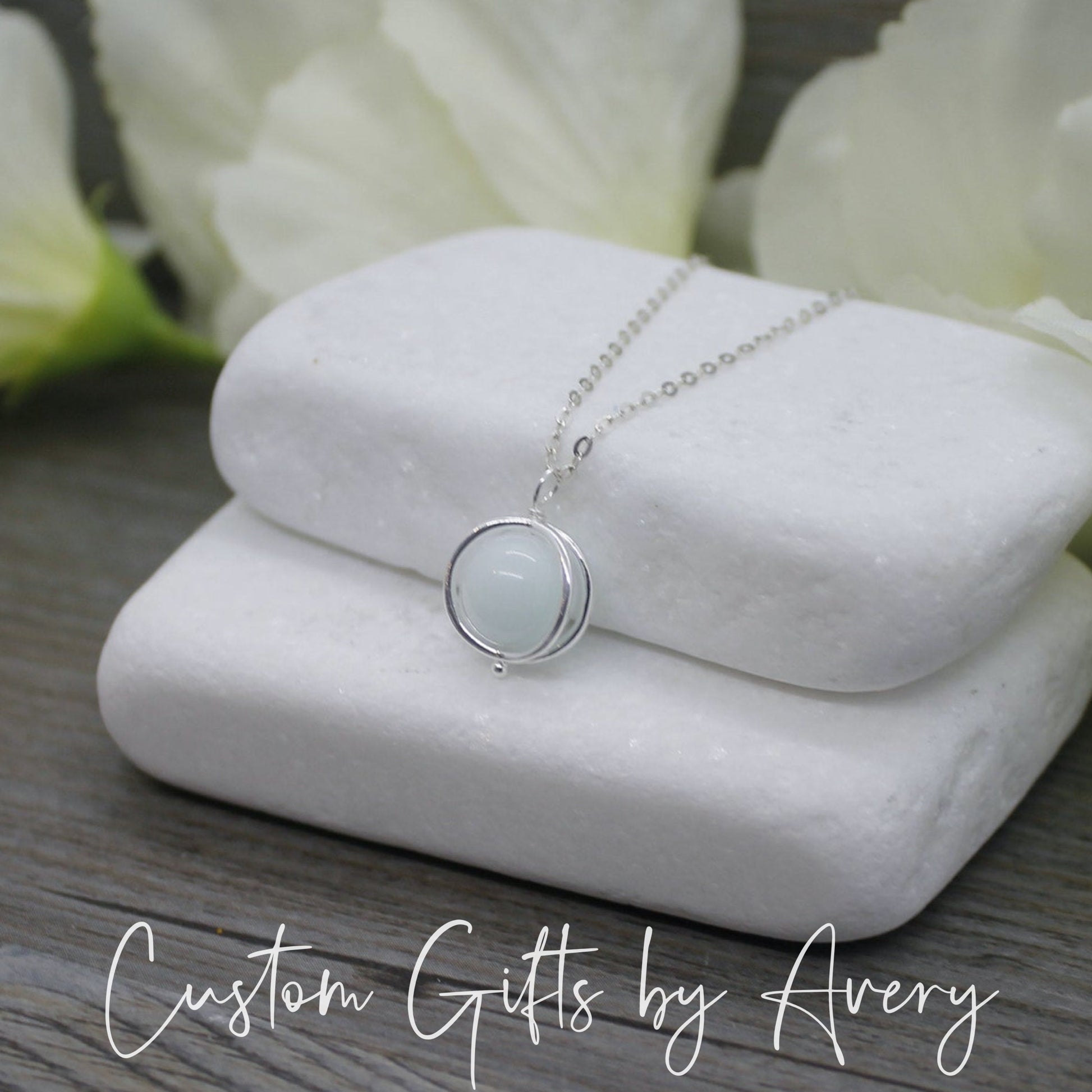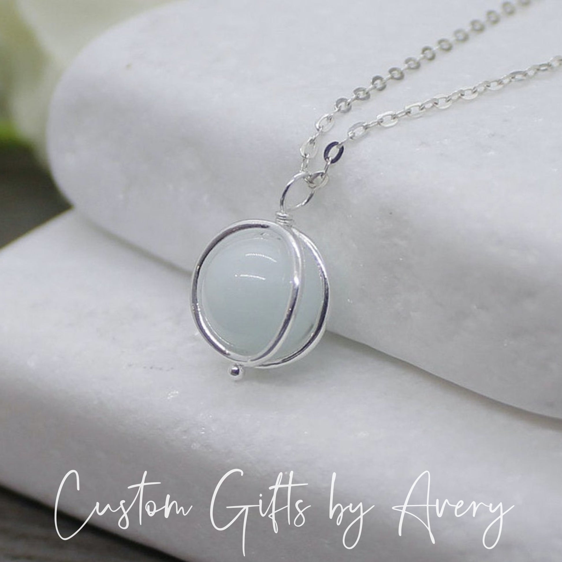 Simple & perfect for everyday wear - a solid sterling silver double ring cage carefully surrounds your genuine celestite gemstone allowing it to turn in place. This pendant floats freely along the chain.