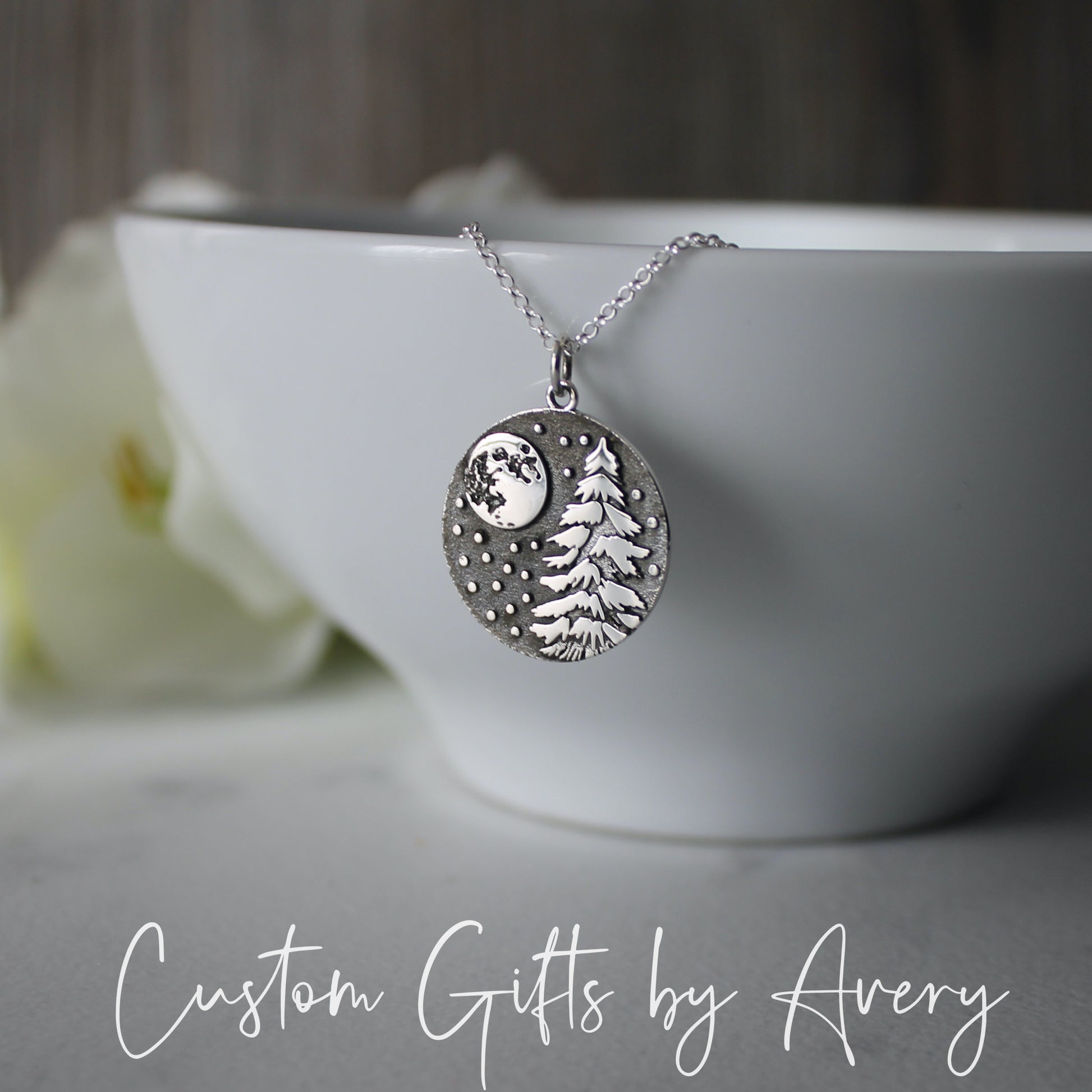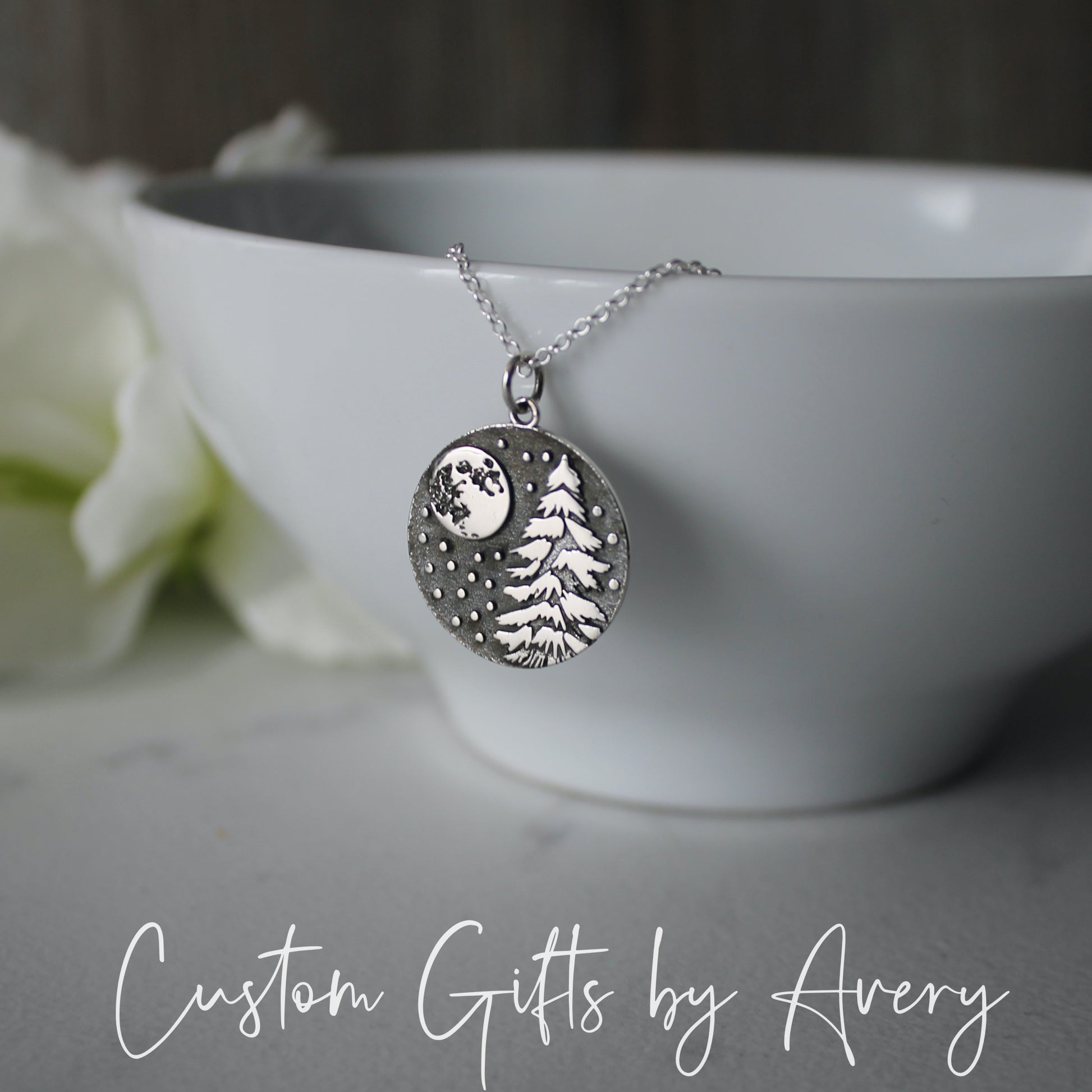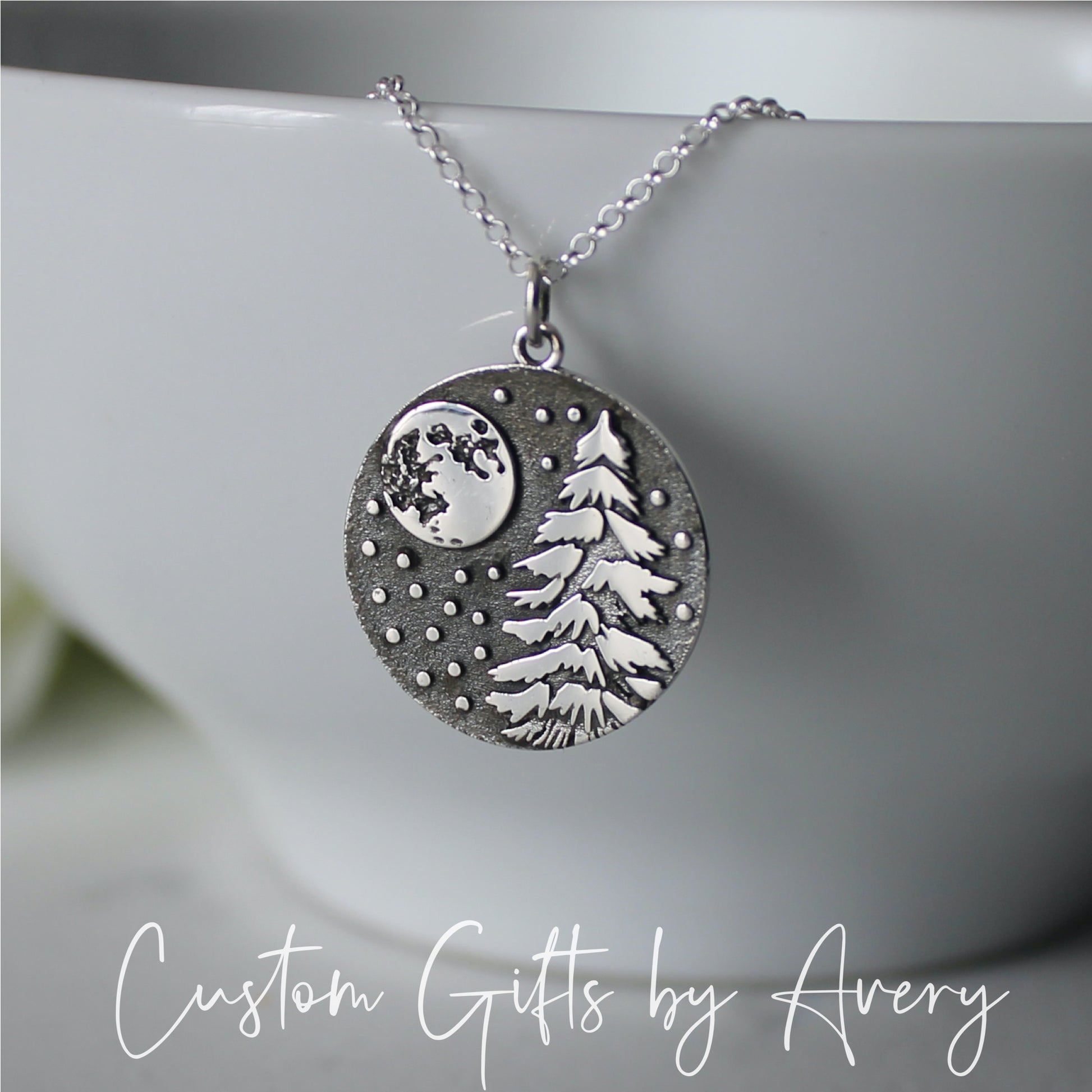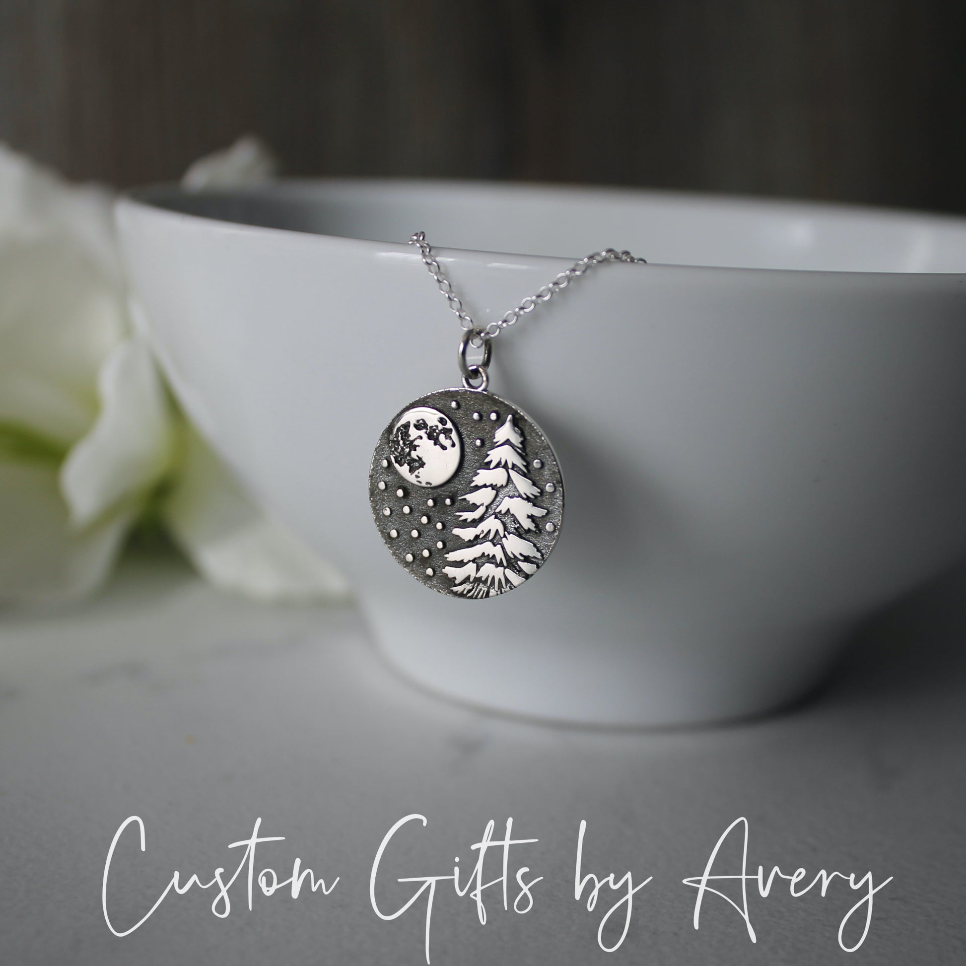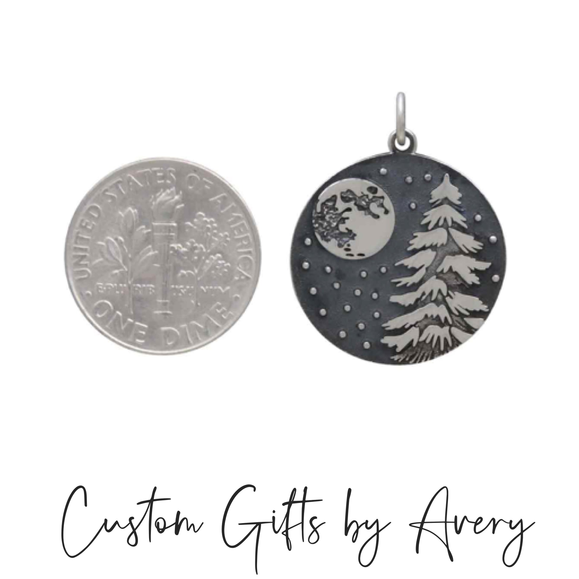 Crafted in recycled .925 sterling silver this pendant features a beautiful winter nighttime scene complete with full moon and snow covered tree. The raised and brightly polished detailing on the tree and full moon contrasts beautifully against the darkly oxidized background.