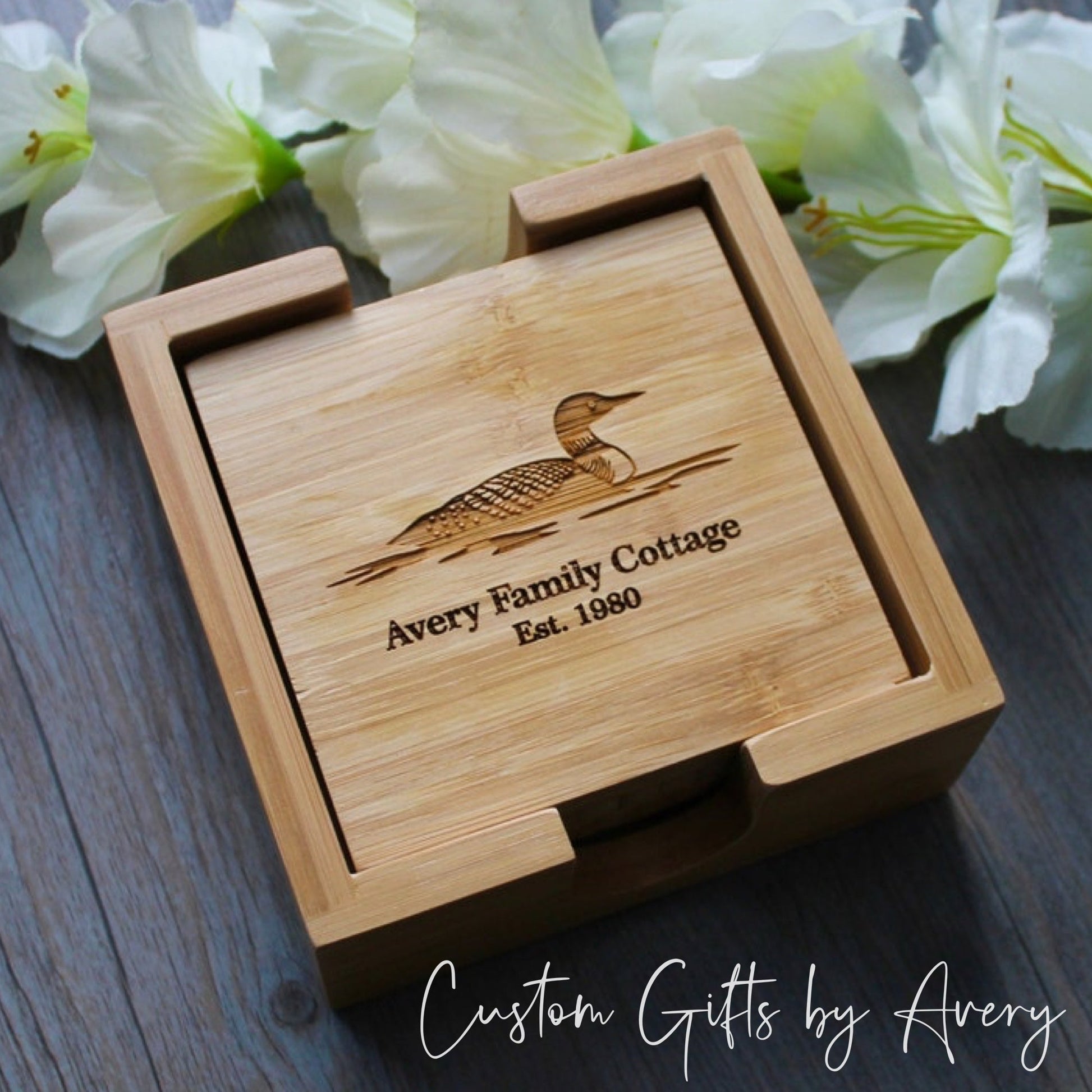 These personalized laser engraved bamboo coasters come as a set of 4 with the holder shown.