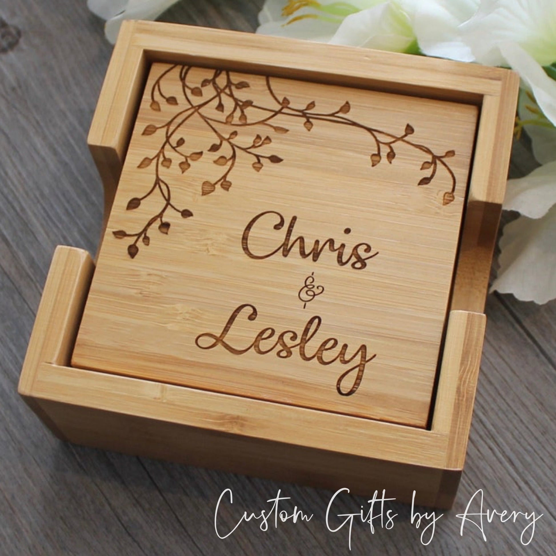 These personalized laser engraved bamboo coasters come as a set of 4 with the holder shown. These make a great housewarming, engagement, wedding, or anniversary gift.