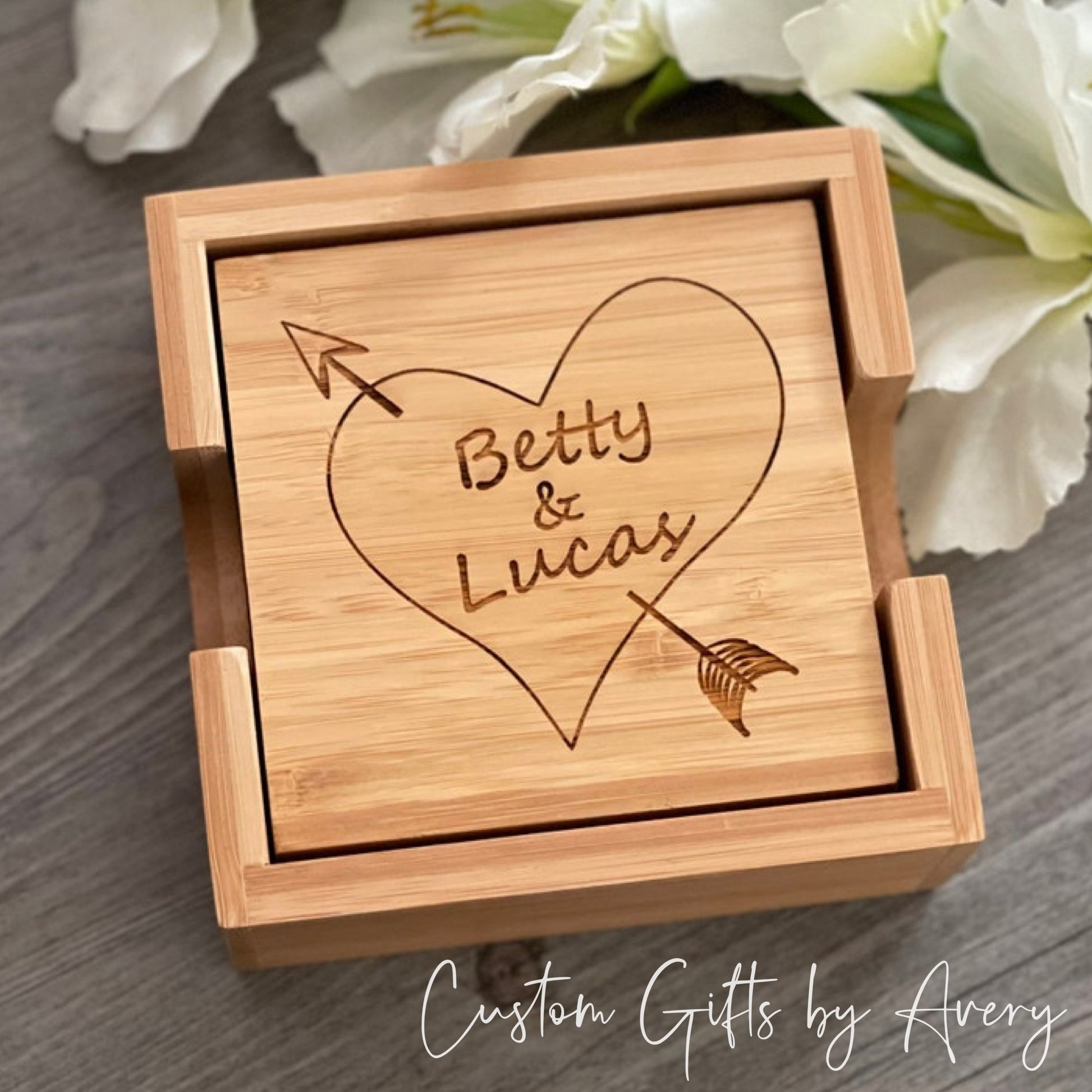 These personalized laser engraved bamboo coasters come as a set of 4 with the holder shown. These make a great housewarming, engagement, wedding, or anniversary gift.