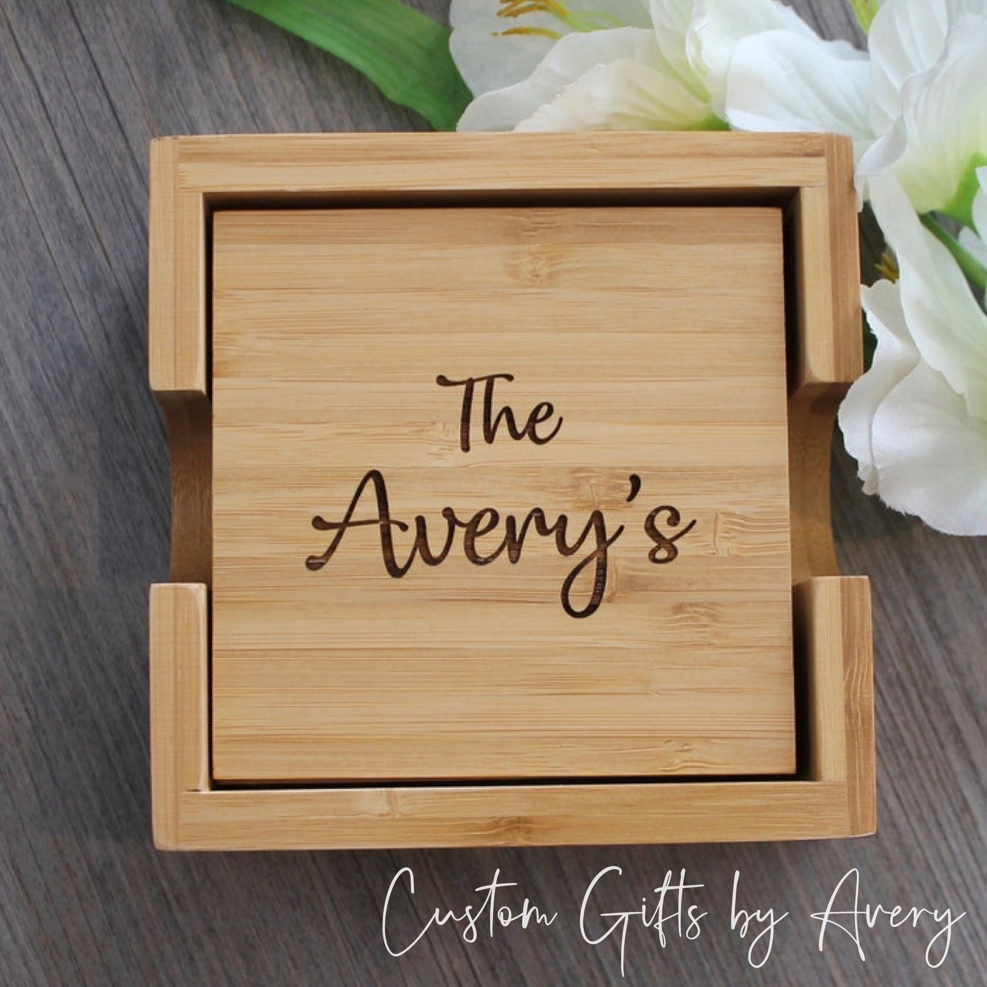 These personalized laser engraved bamboo coasters come as a set of 4 with the holder shown. These make a great housewarming, engagement, wedding, or anniversary gift.