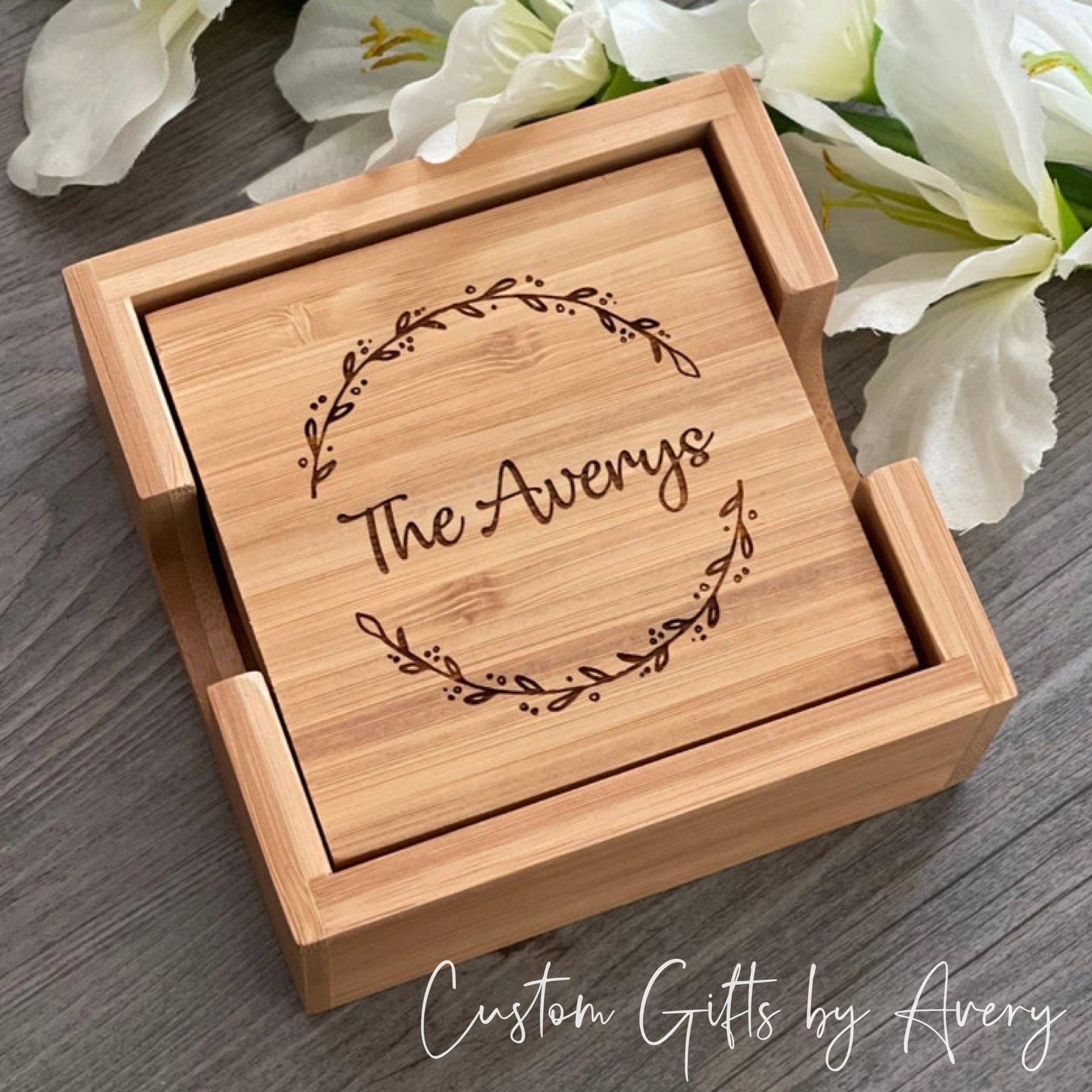 These personalized laser engraved bamboo coasters come as a set of 4 with the holder shown. These make a great housewarming, engagement, wedding, or anniversary gift.