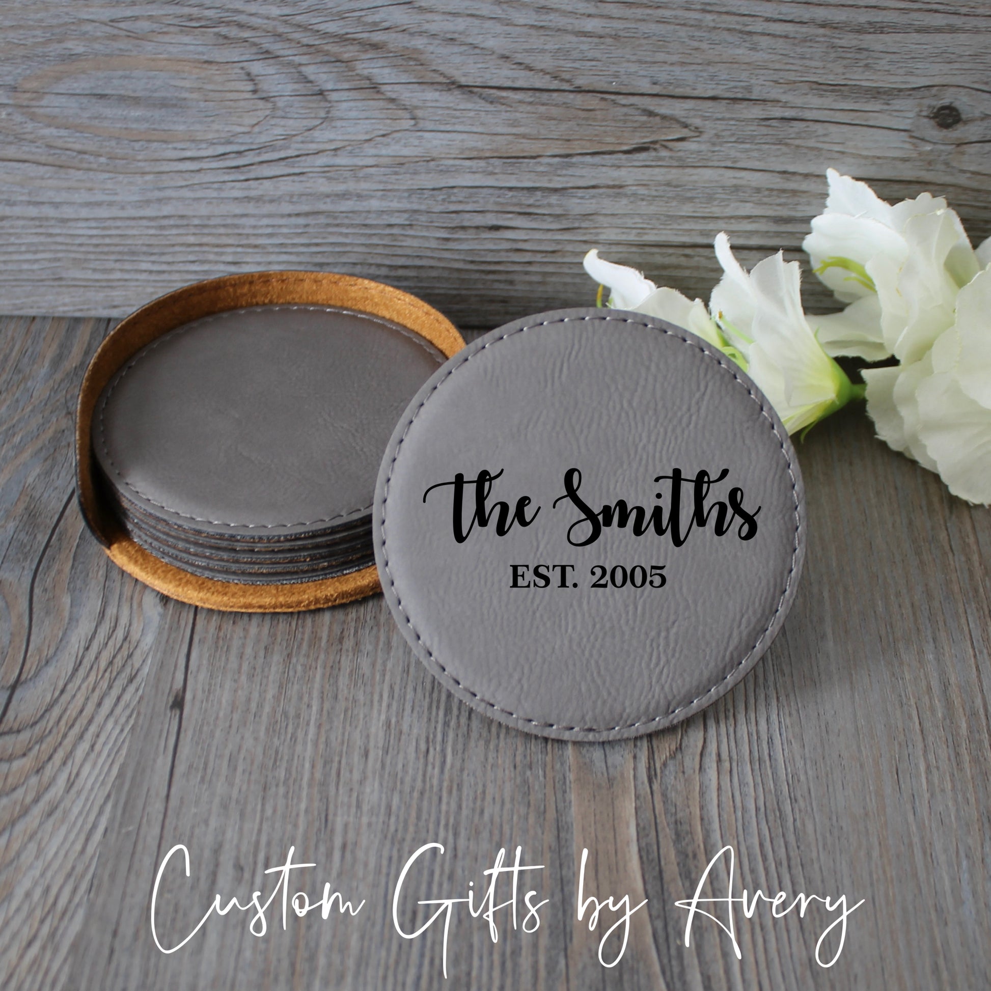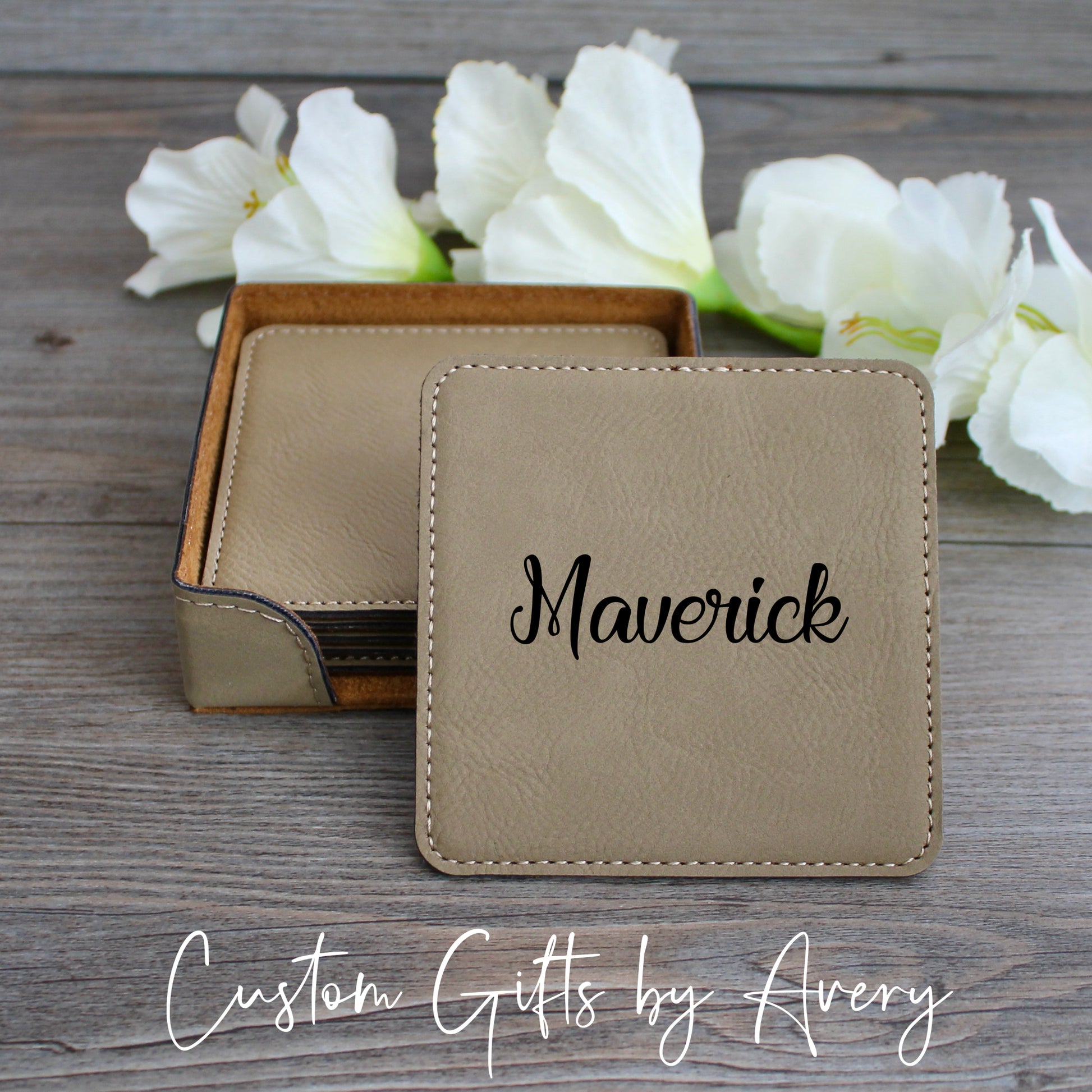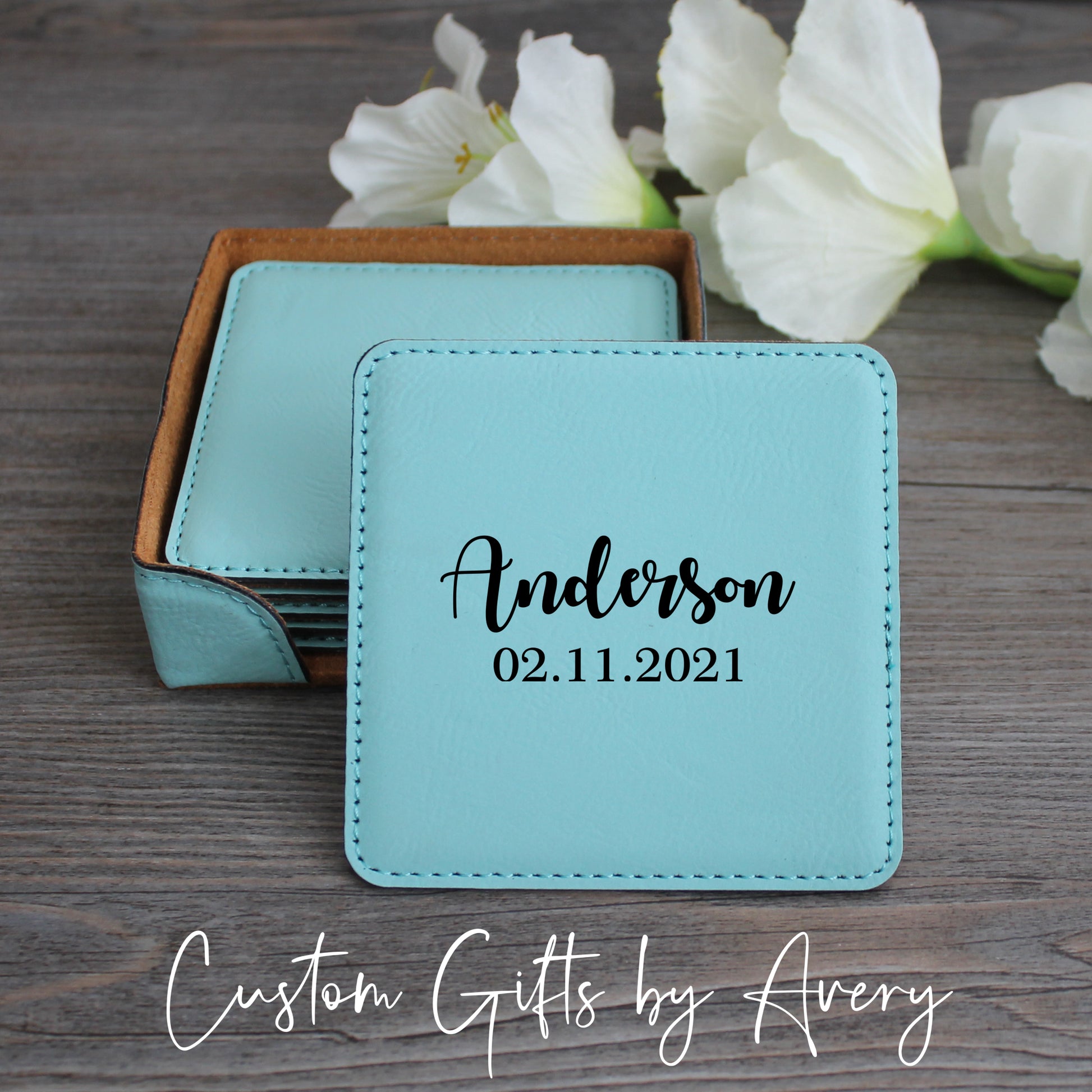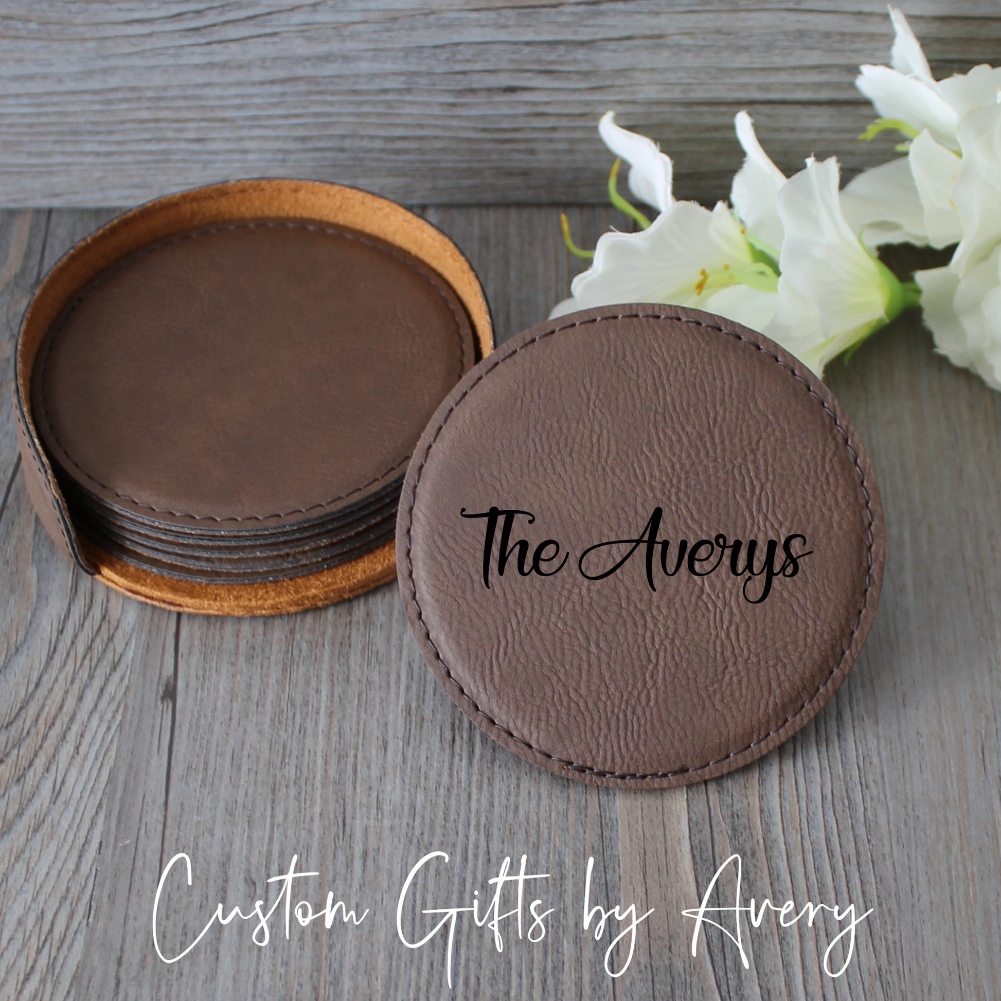 Personalized Leatherette Coasters ~ Set of 6 with Holder