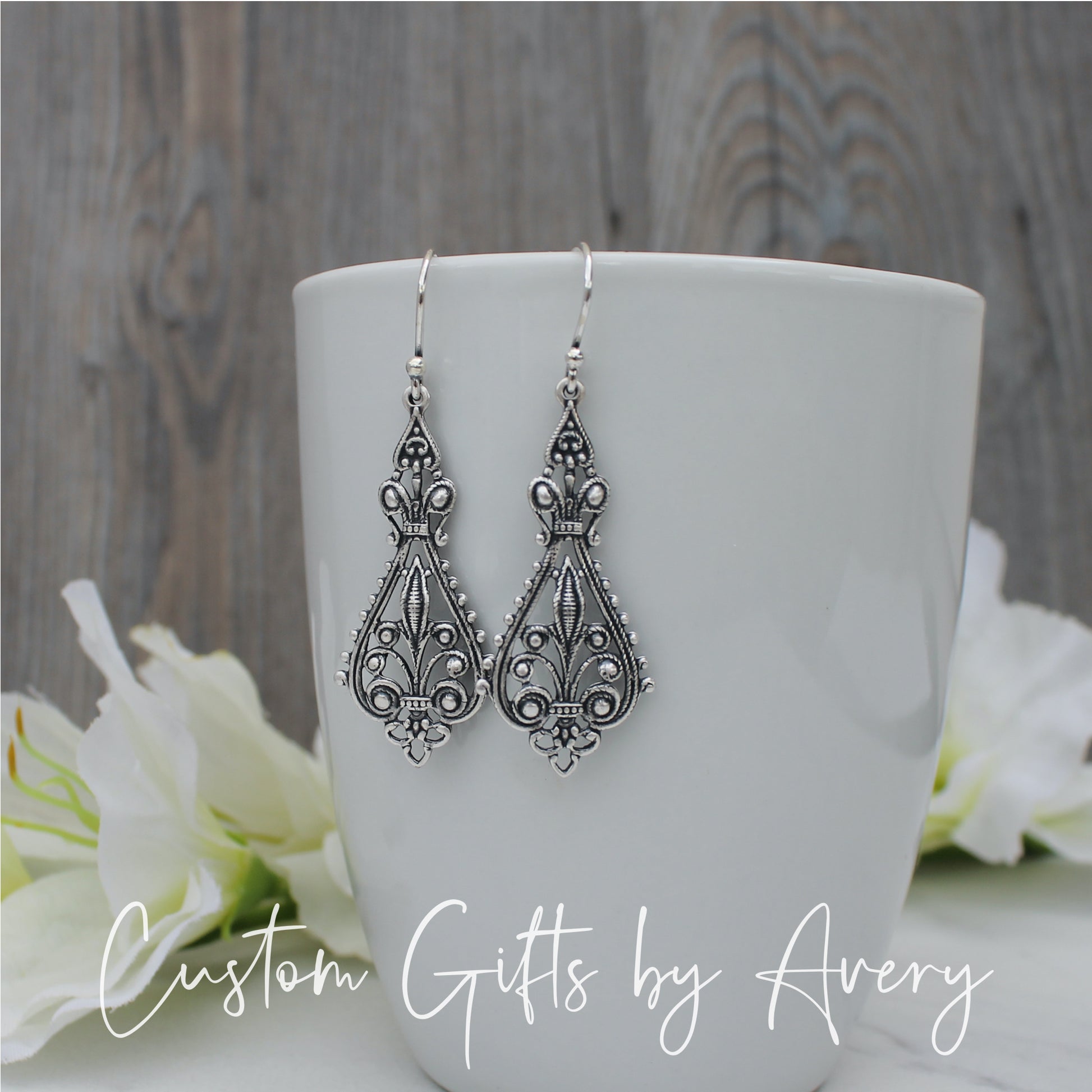 These ornately detailed victorian filigree chandelier drops are oxidized to bring out the detail. They are very lightweight & comfortable to wear. They hang from solid .925 sterling silver ear wires (oxidized to match the detailing in the drops). Ear wires come with small rubber backings to secure earrings. A sterling silver polishing cloth is included.