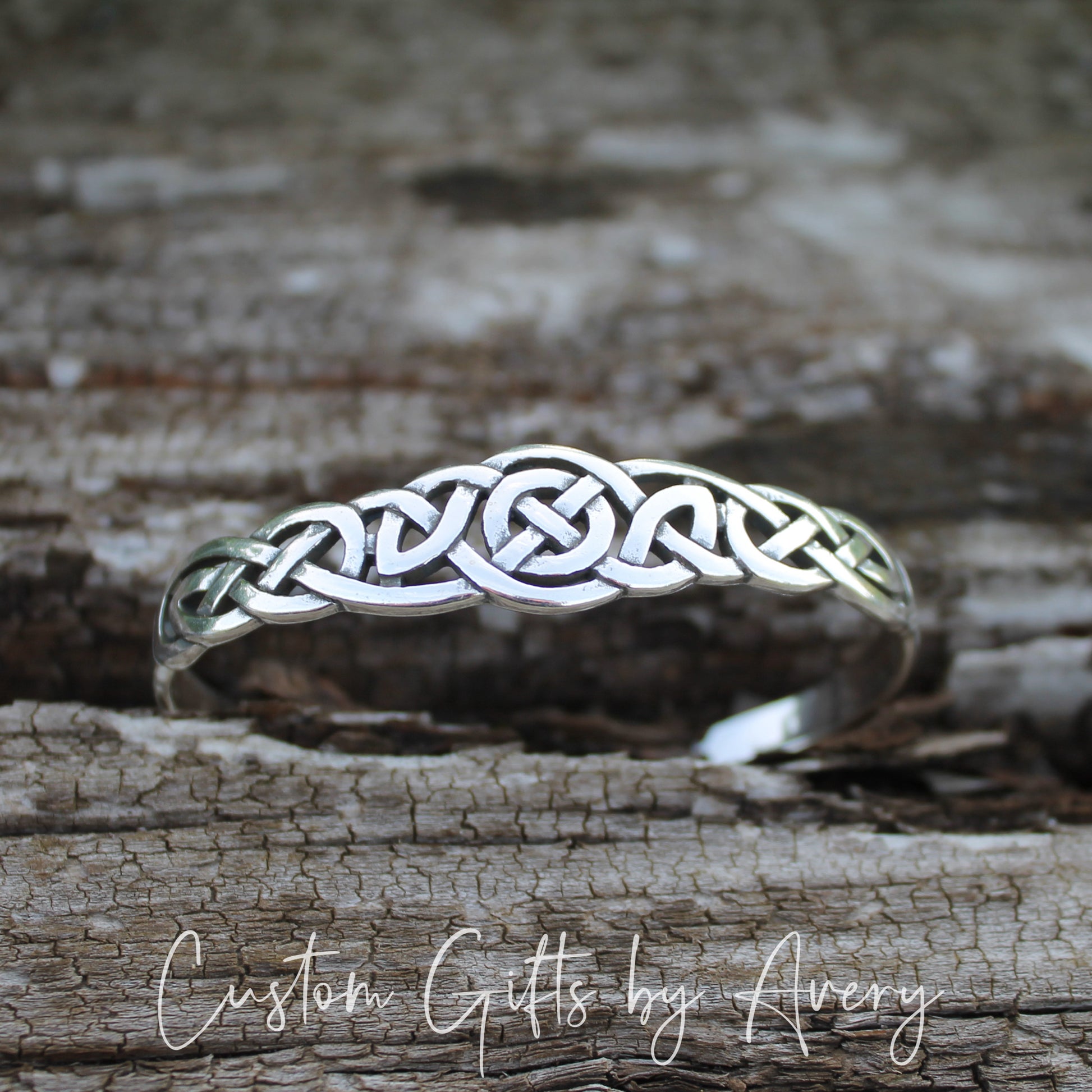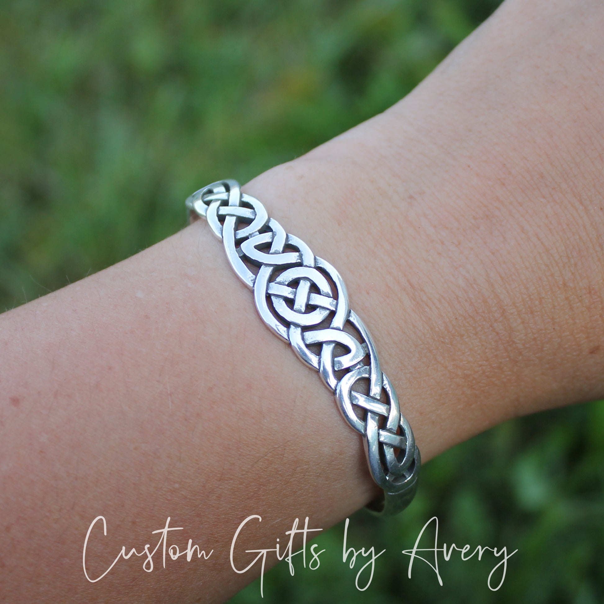This cuff bracelet is crafted in solid .925 sterling silver. Celtic knots are have no start or finish. They are said to represent eternity, be it in loyalty, faith, friendship or love. Only one thread is used in each design which symbolizes how life and eternity are interconnected.