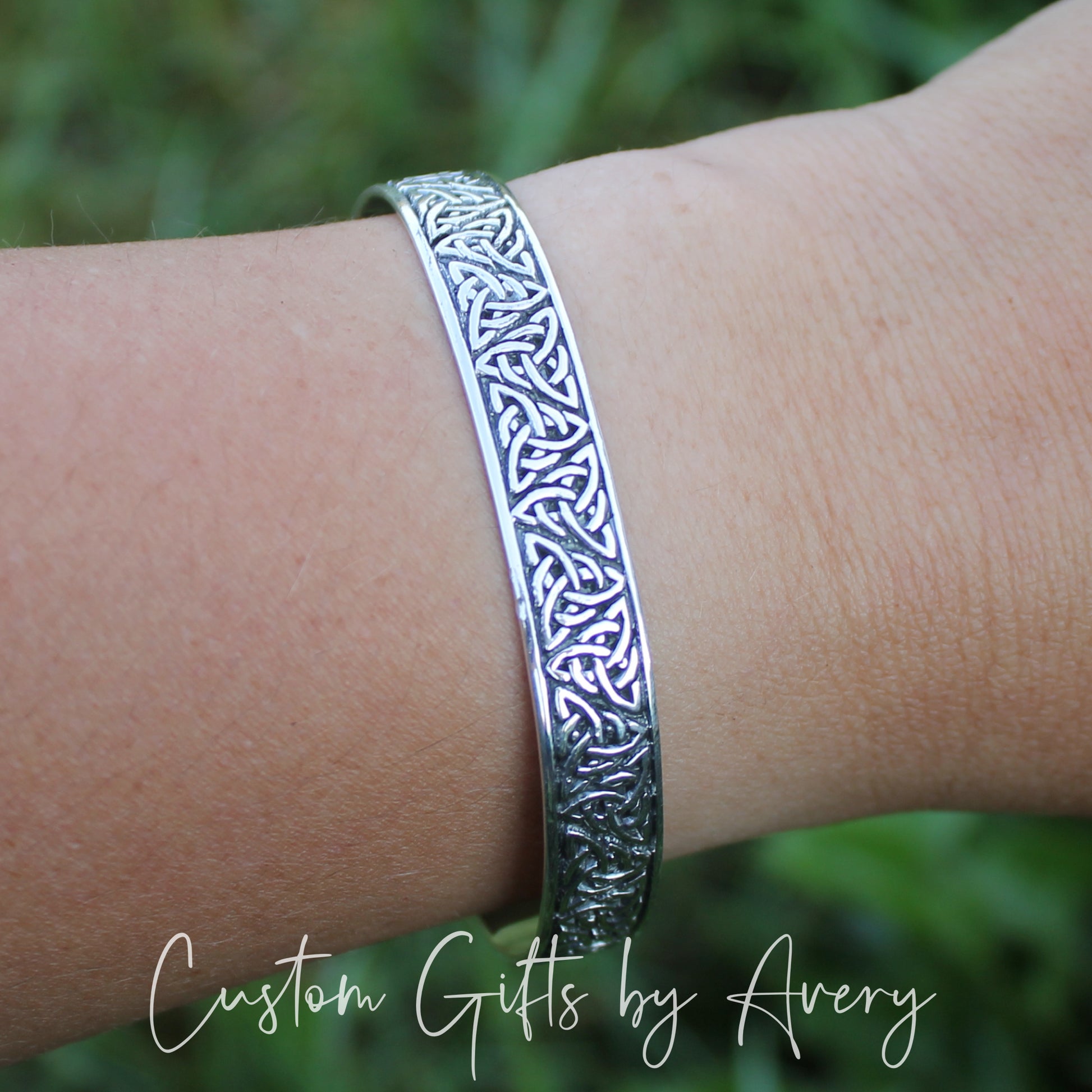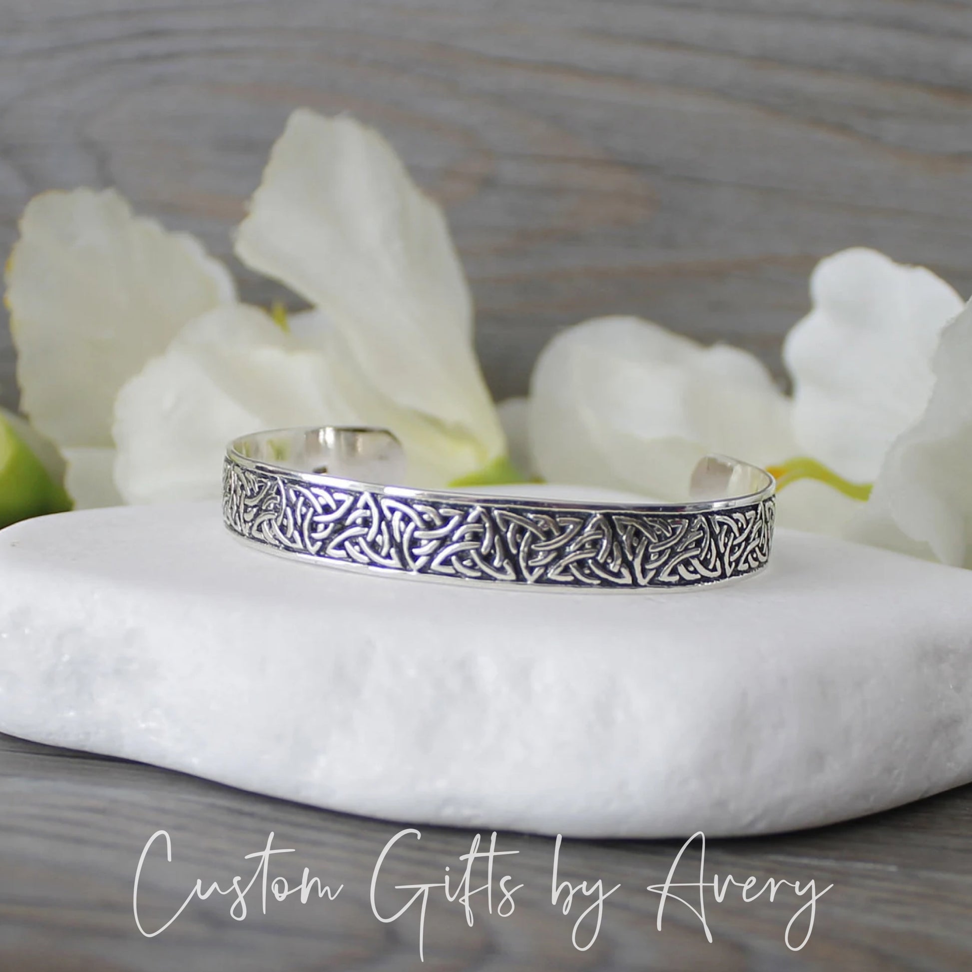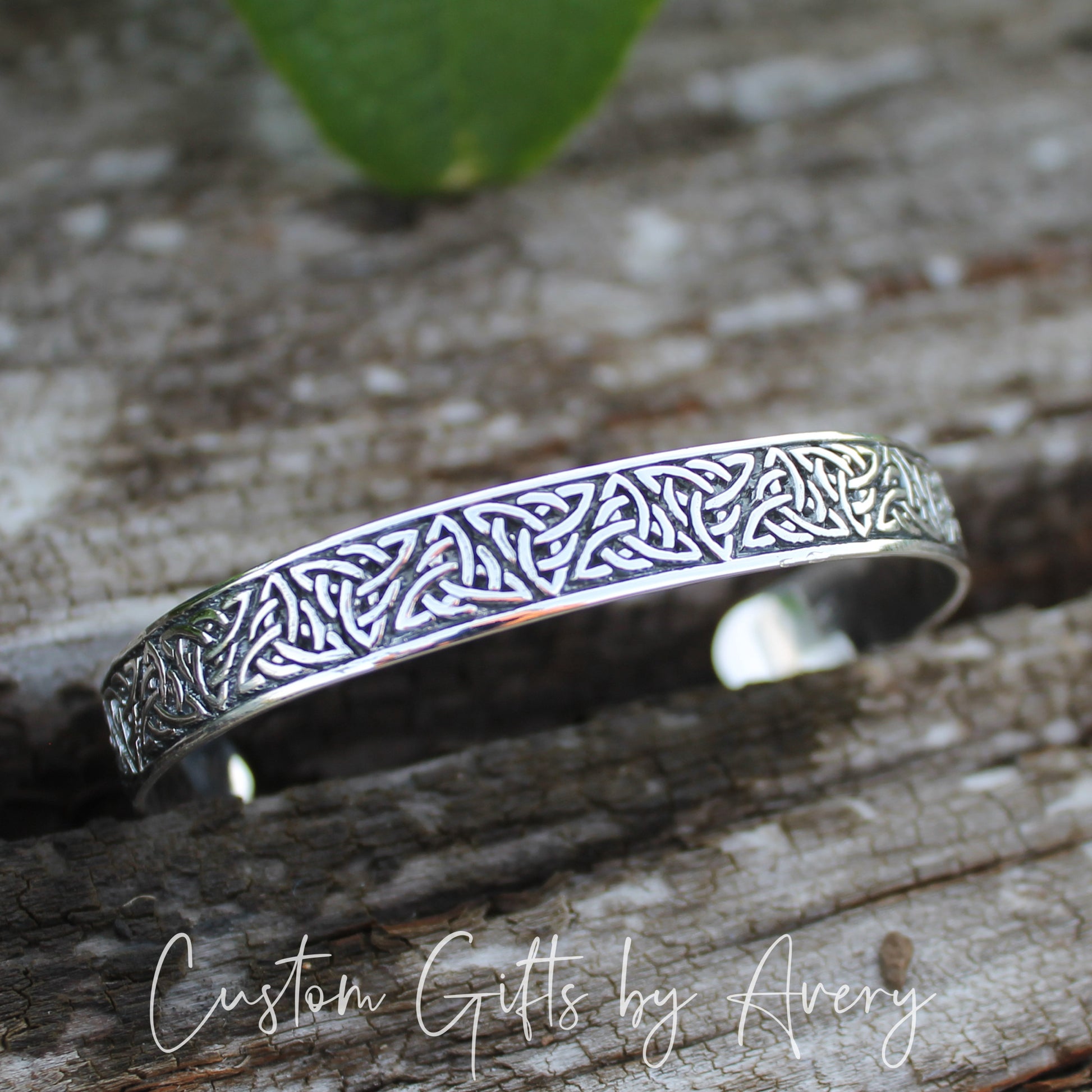 This cuff bracelet is crafted in solid .925 sterling silver. Celtic knots are have no start or finish. They are said to represent eternity, be it in loyalty, faith, friendship or love. Only one thread is used in each design which symbolizes how life and eternity are interconnected.