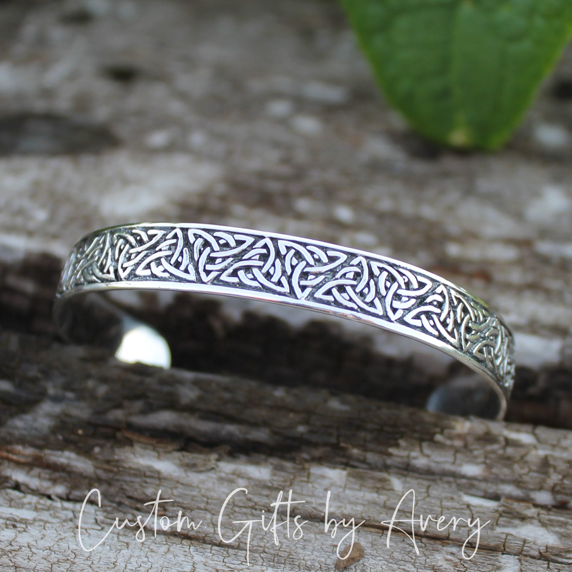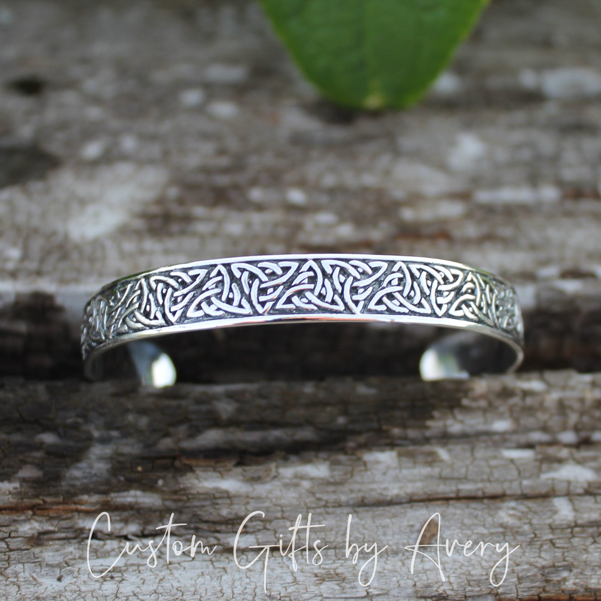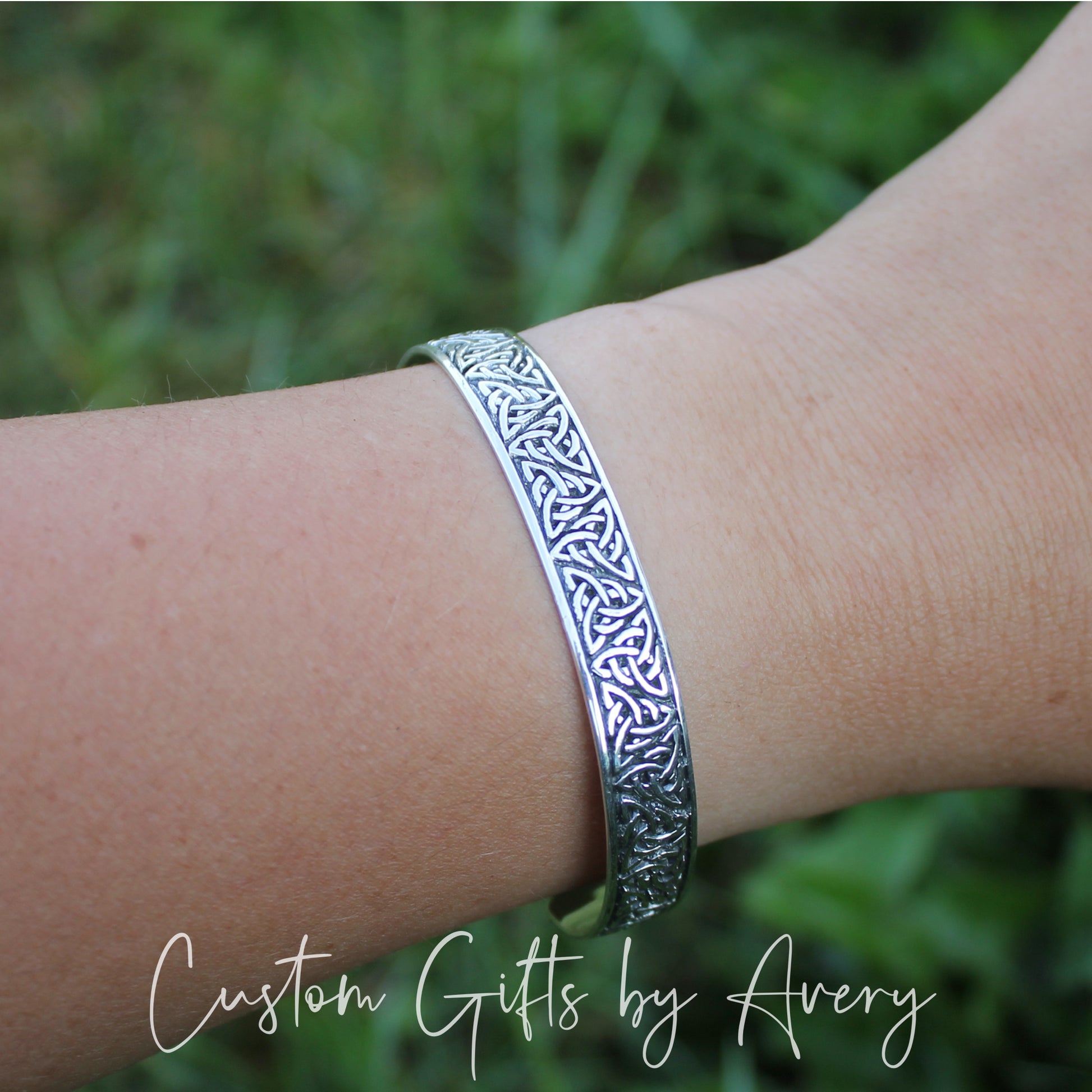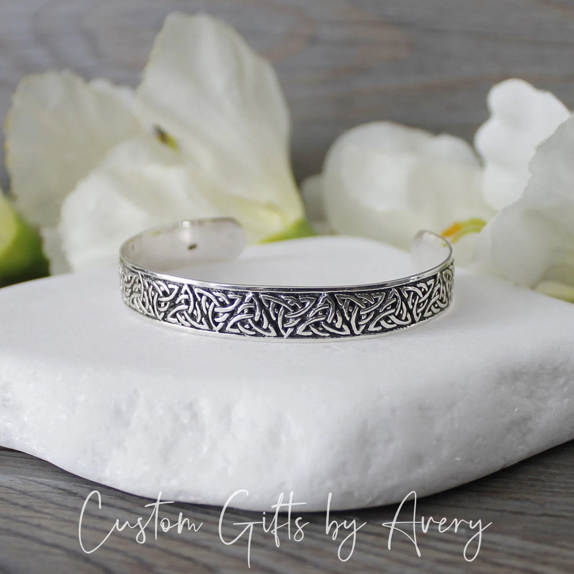 This cuff bracelet is crafted in solid .925 sterling silver. Celtic knots are have no start or finish. They are said to represent eternity, be it in loyalty, faith, friendship or love. Only one thread is used in each design which symbolizes how life and eternity are interconnected.