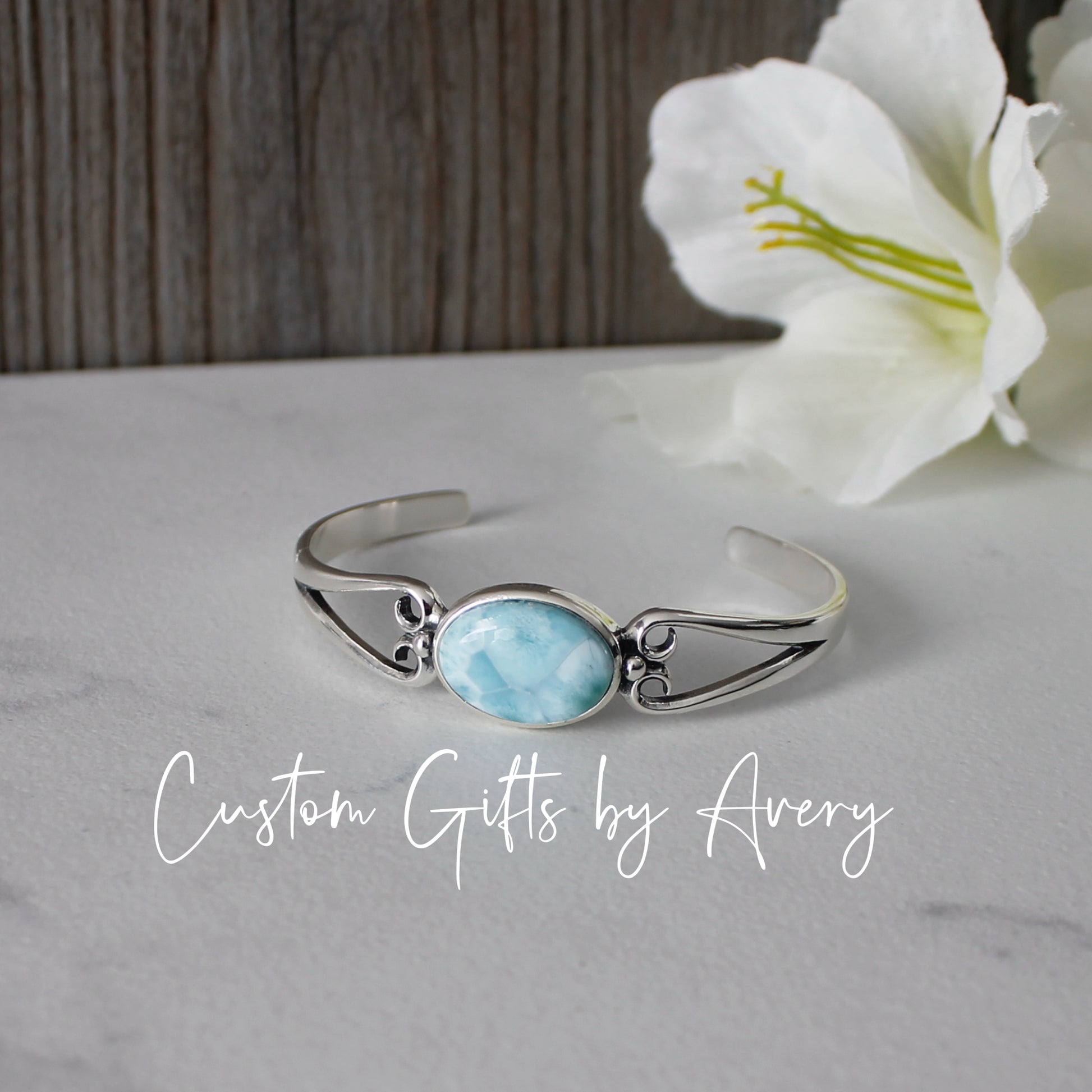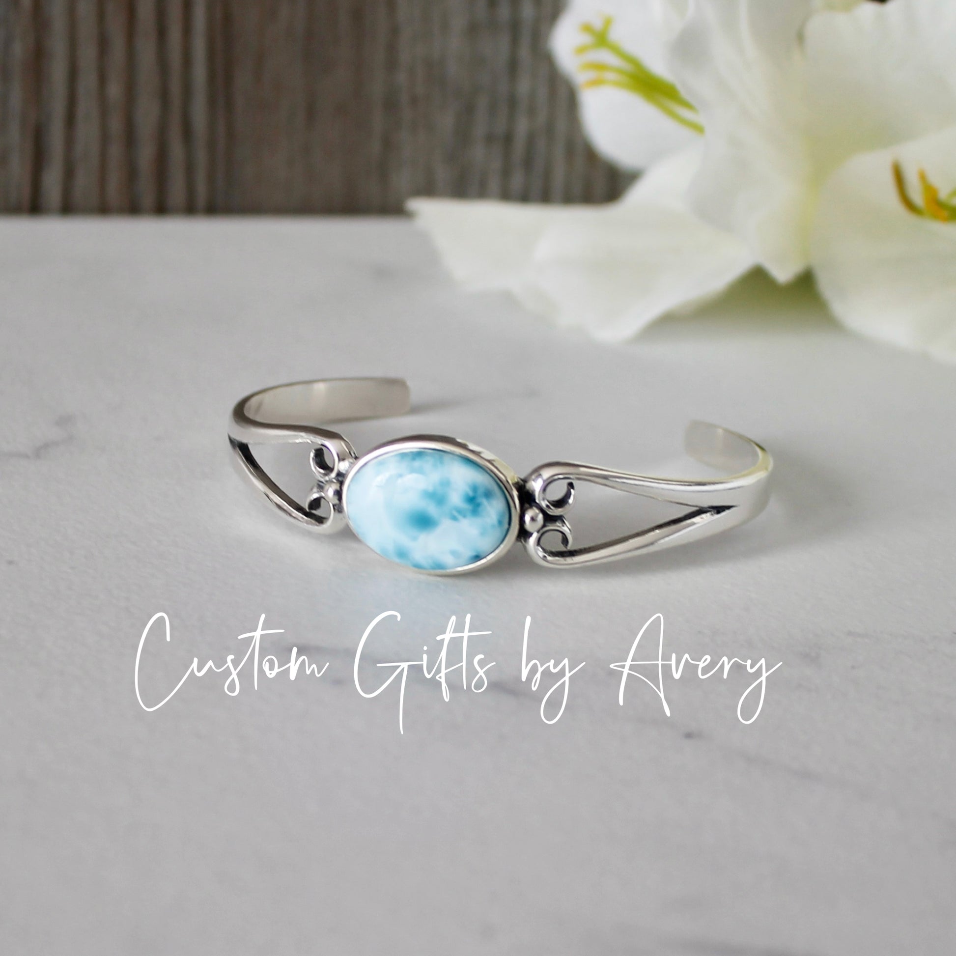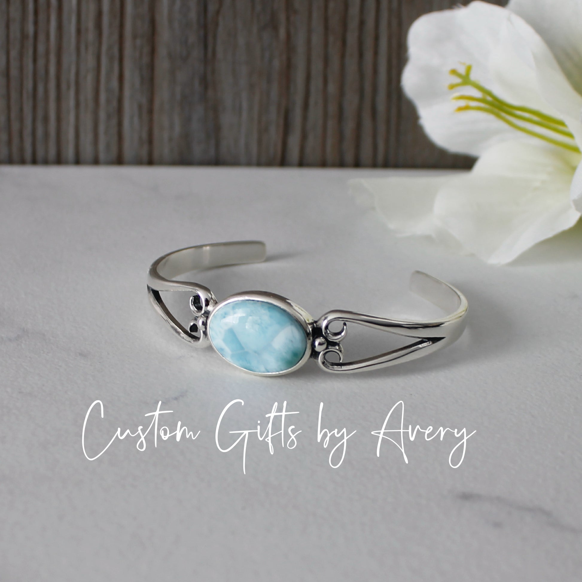 All larimar gemstones are high grade (AA), natural gemstones. Like all natural gemstones, markings and colourings will vary from stone to stone. All the larimar gemstones in these cuffs are carefully selected for a beautiful colouring and marking.