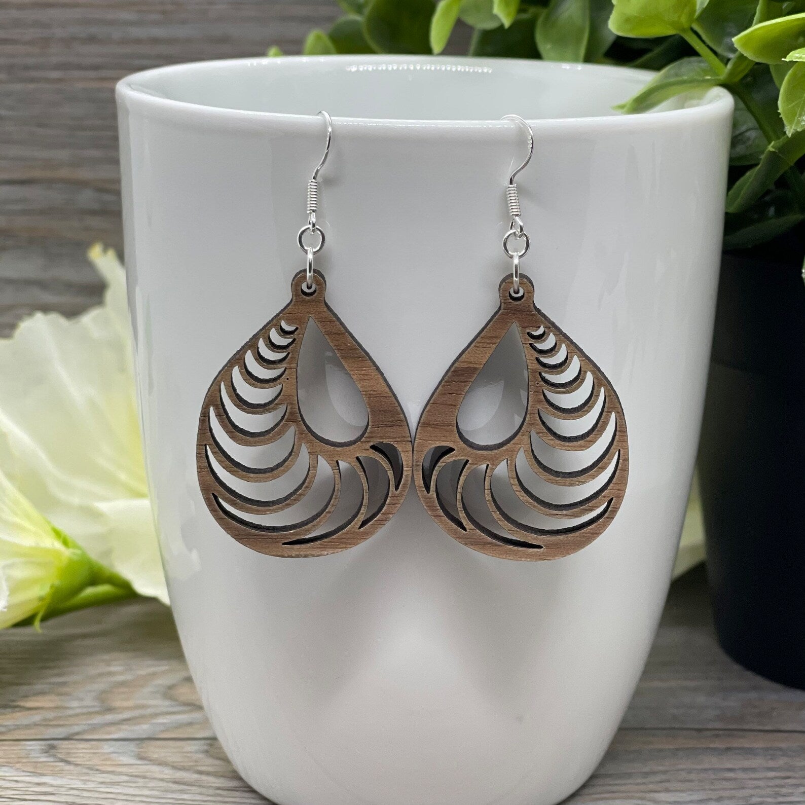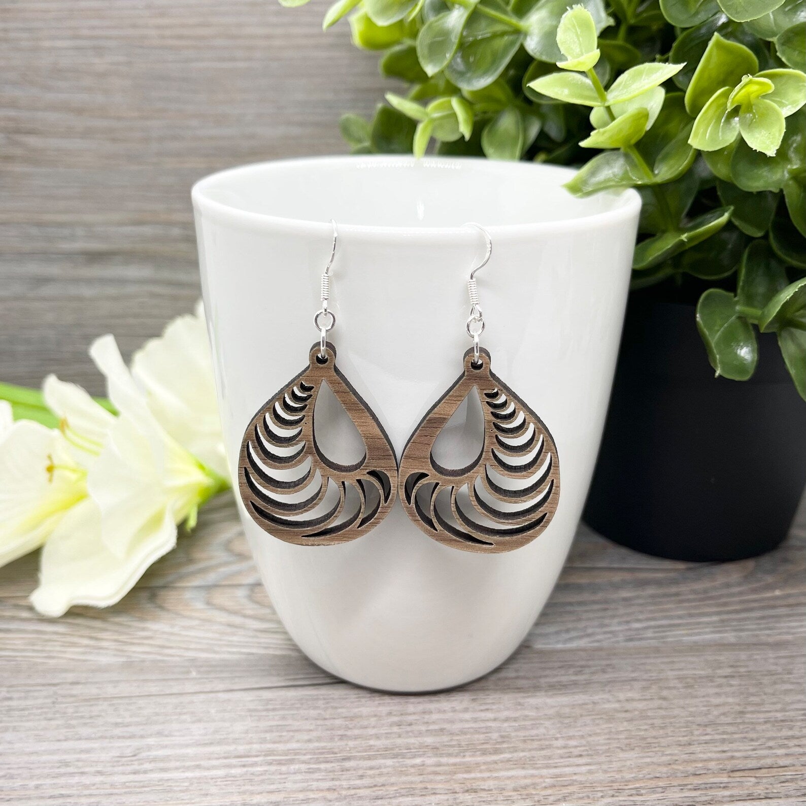 These delicate and intricate earrings have been laser cut from walnut wood. Despite their size, they are incredibly lightweight and very comfortable to wear. They hang from 316L grade stainless steel earring hooks. Stainless steel hooks are the same grade used in industrial and food-processing applications- they are moisture resistant moisture and will not oxidize.