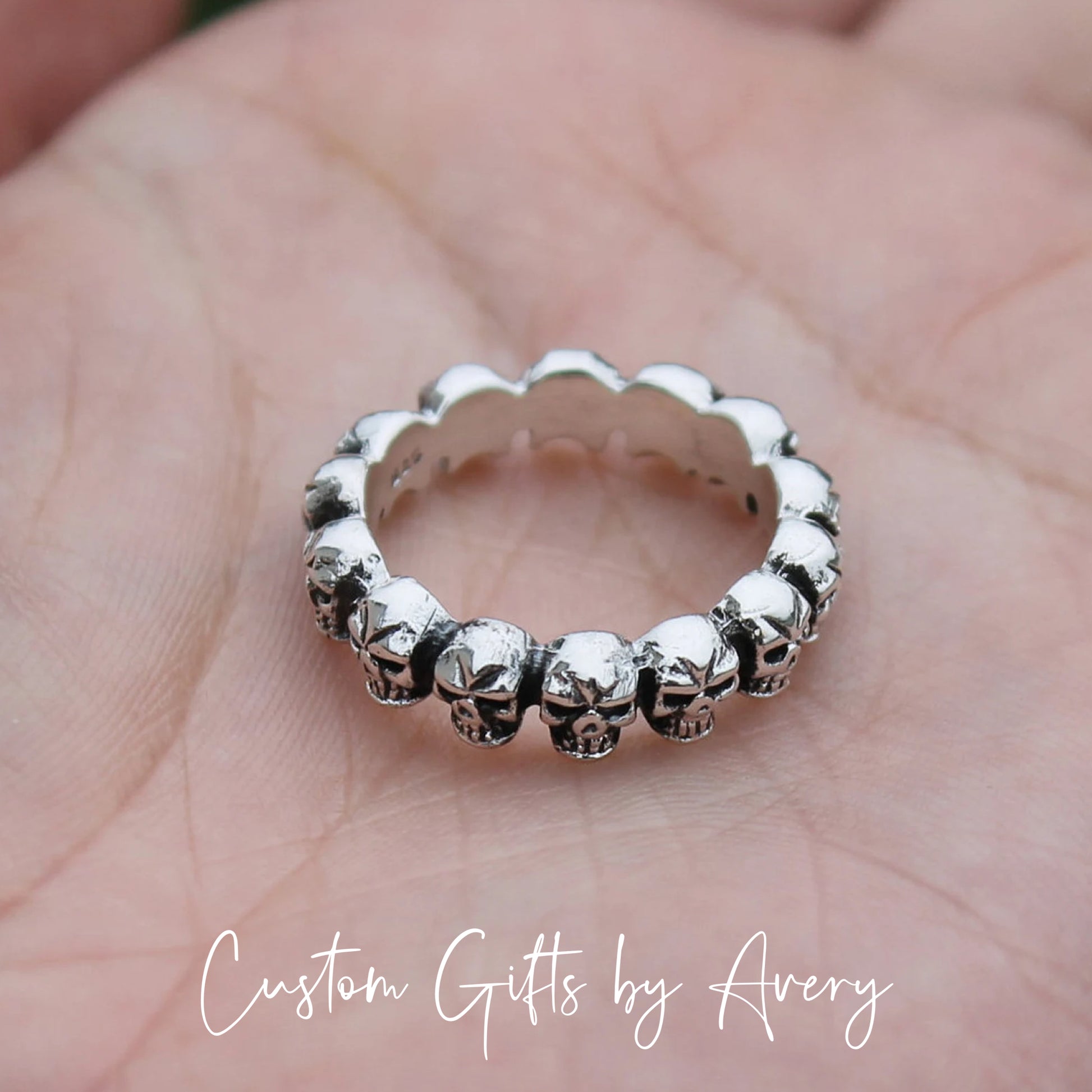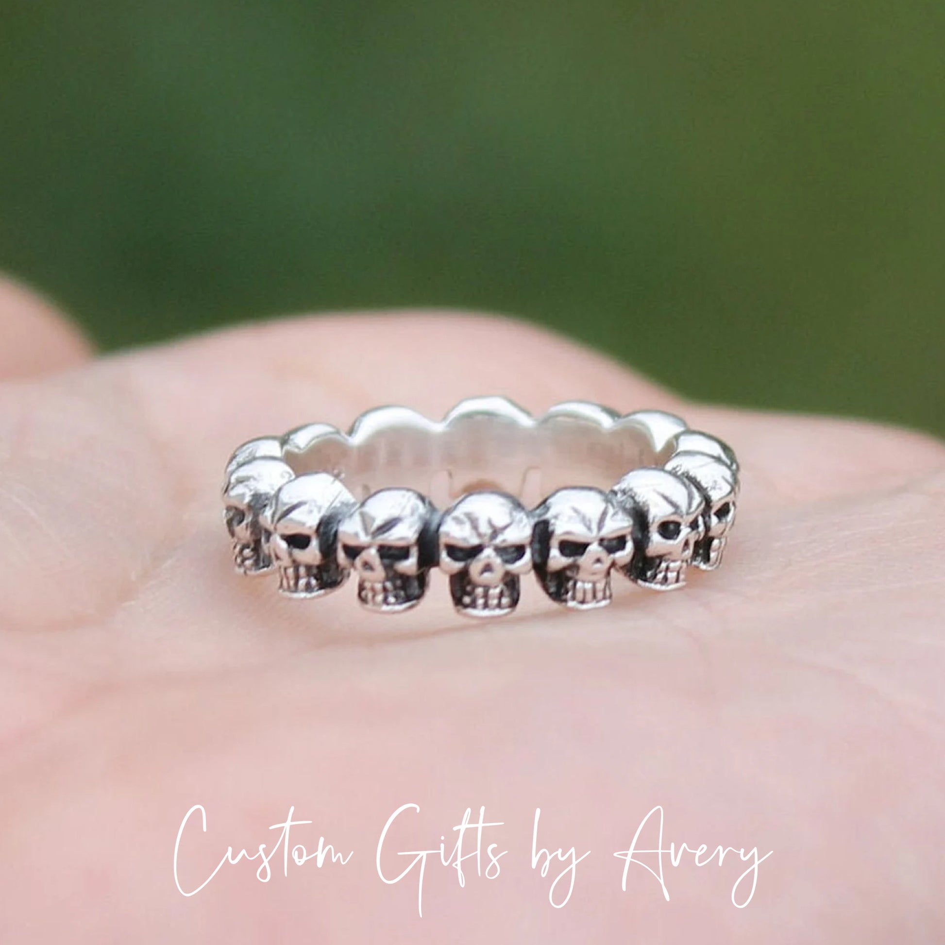 Crafted in sterling silver, this 3 dimension skulls ring is oxidized to highlight the details. The skulls on this band go all the way around the band.