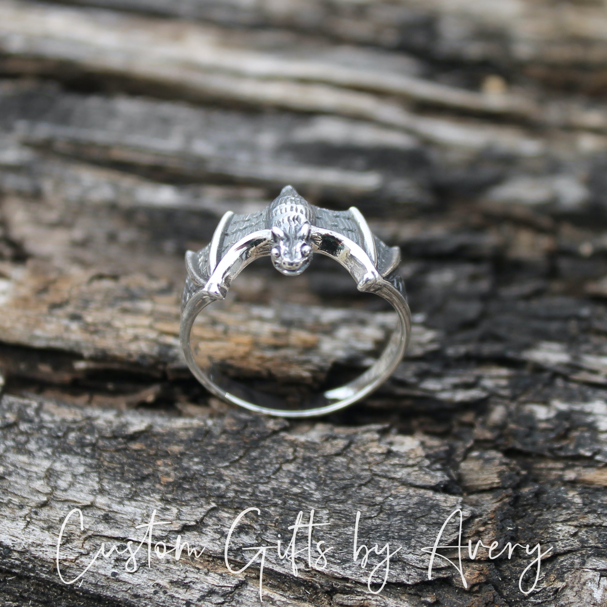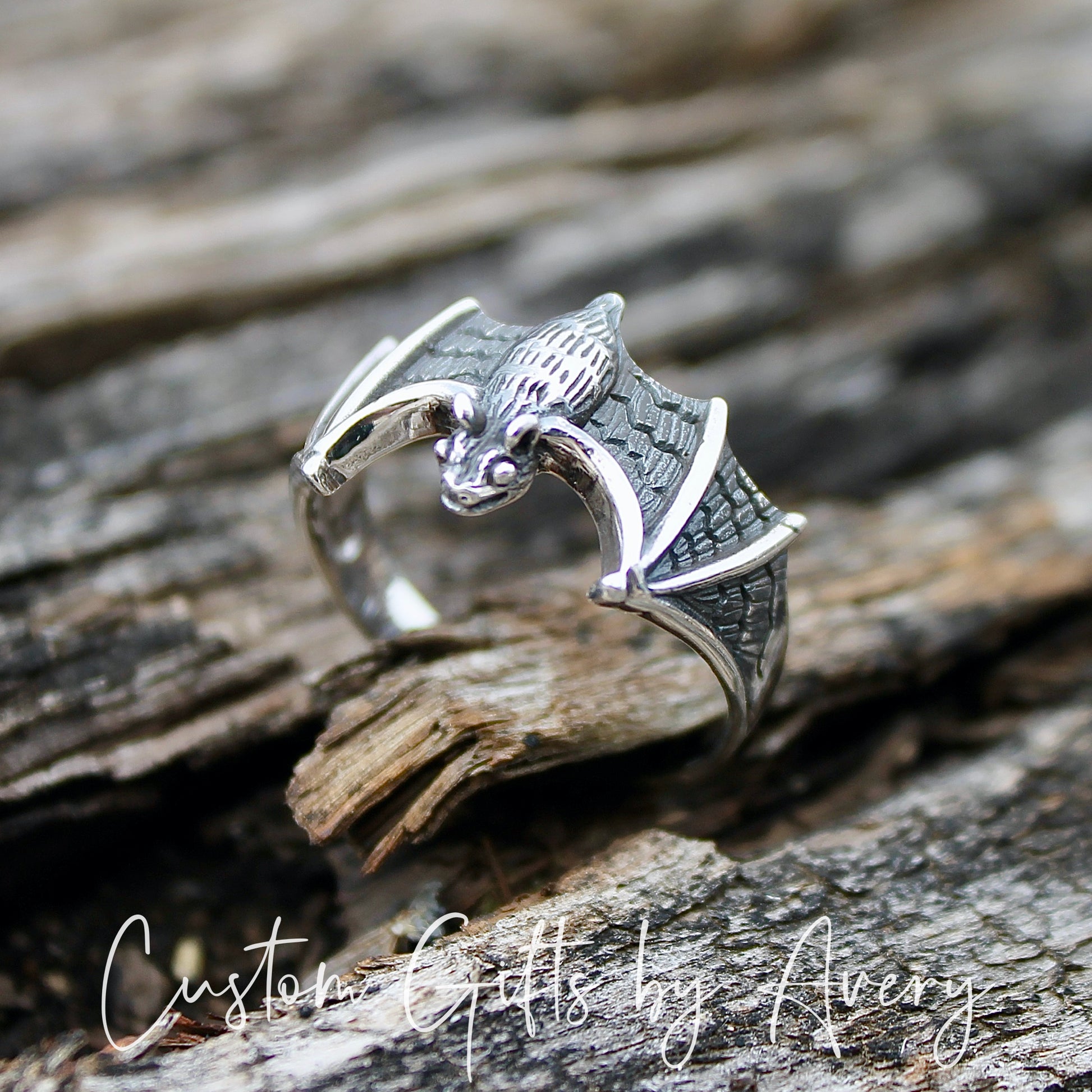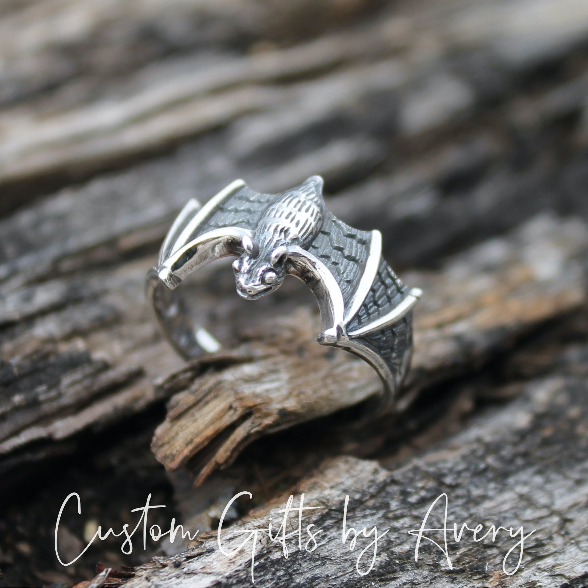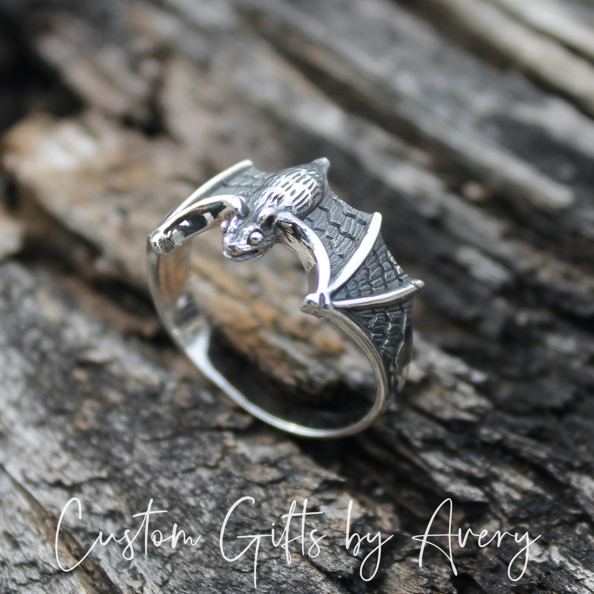 Crafted from nickel-free sterling silver, this bat ring features wrap around wings and a three-dimensional design. This silver bas been oxidized to highlight the detailing on this ring.