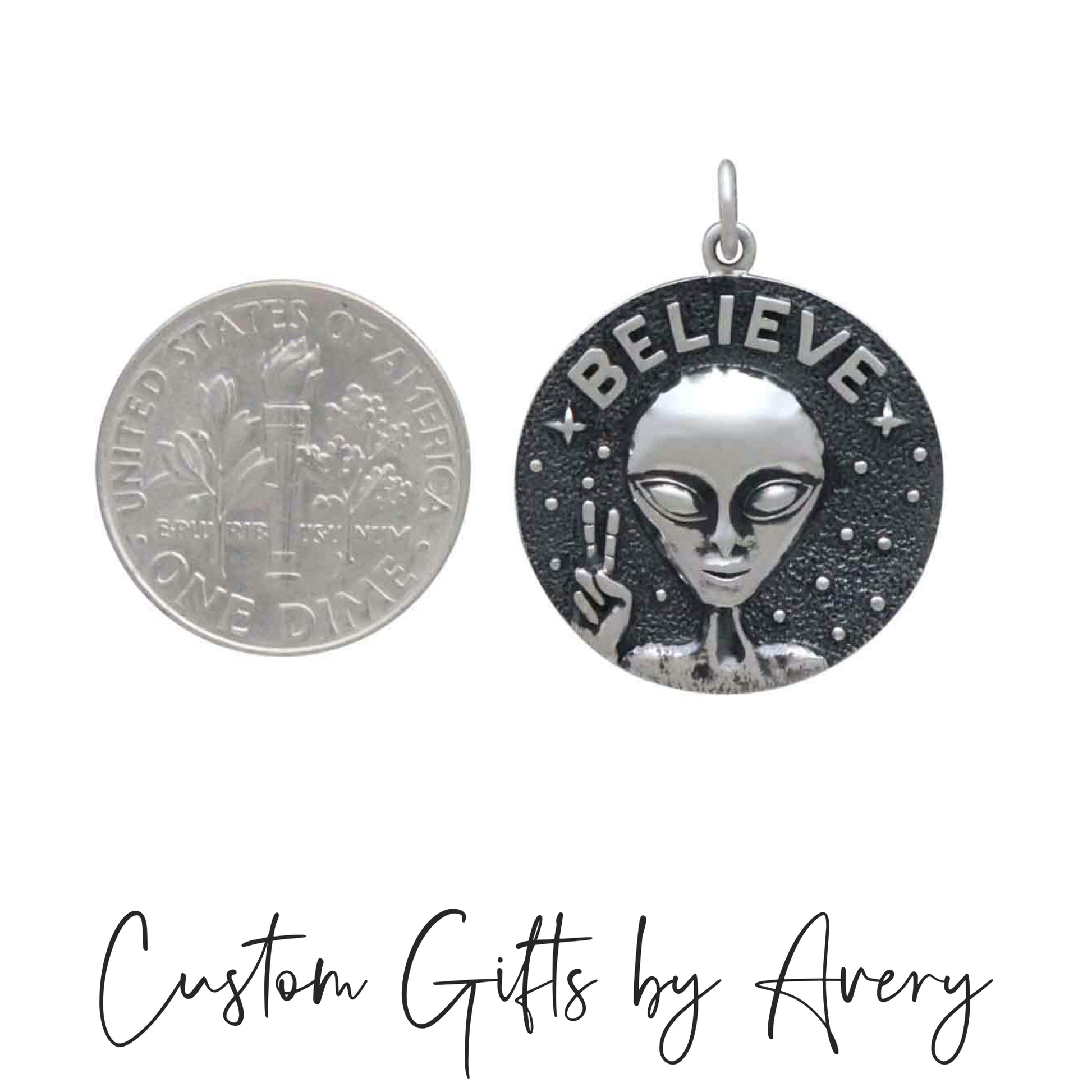 Crafted in .925 sterling silver, this "Believe" pendant is perfect for those who believe we are not alone. With a mix of oxidized and brightly polished silver, the raised image and text pop on this circular piece.