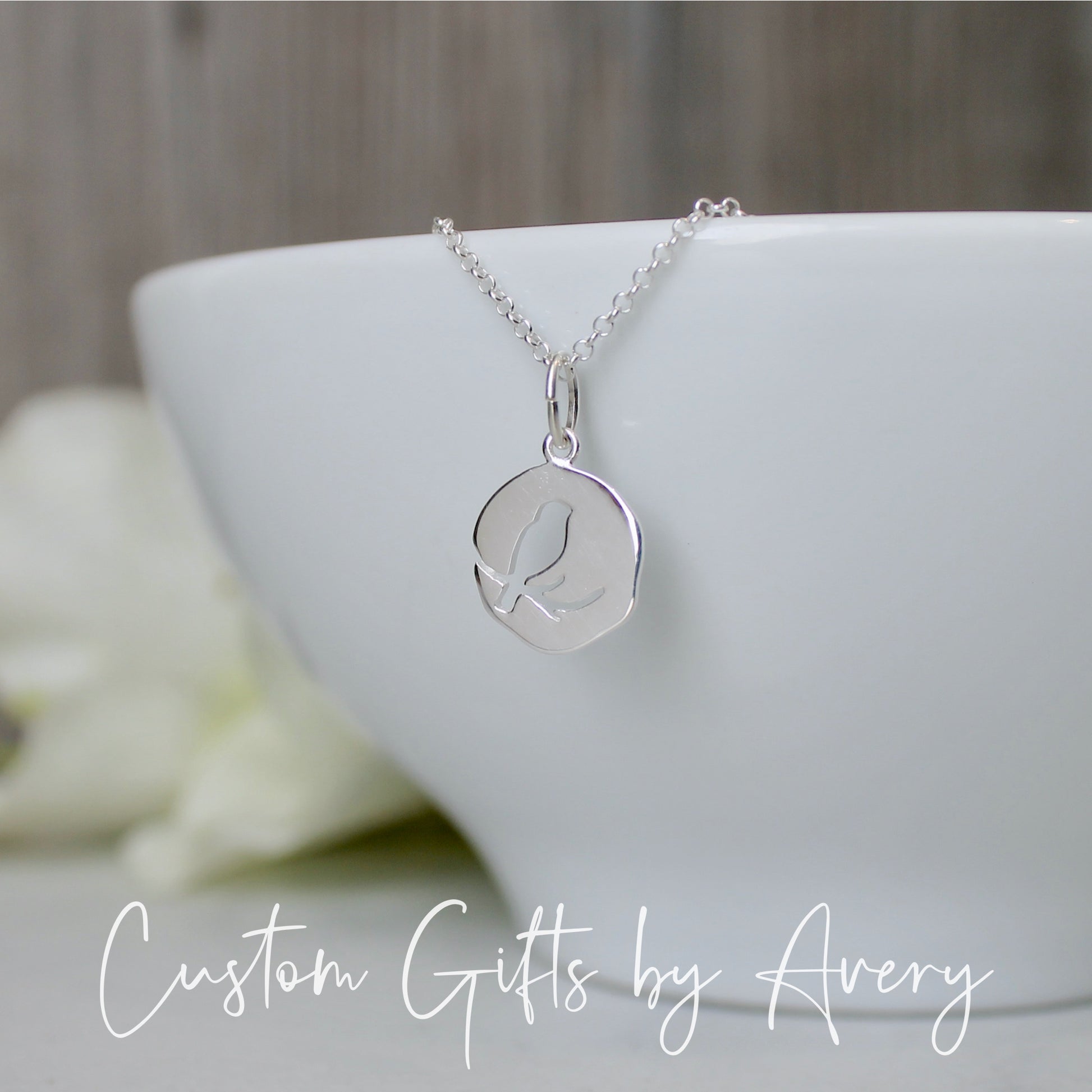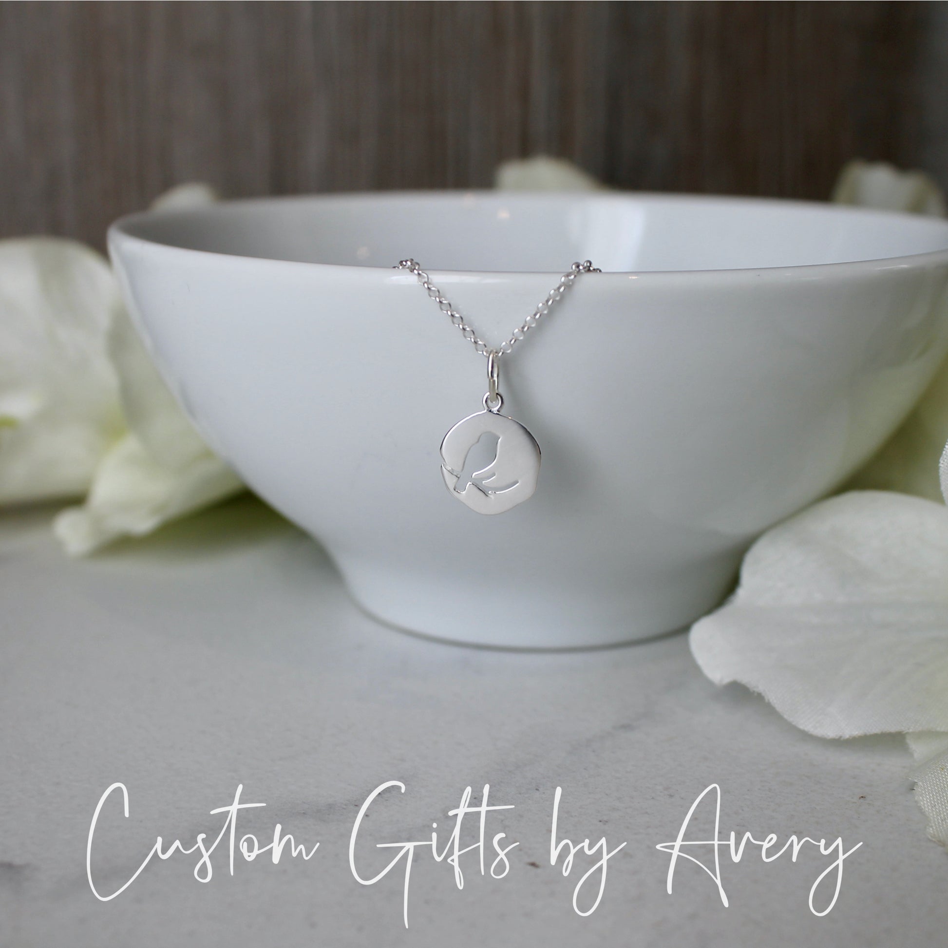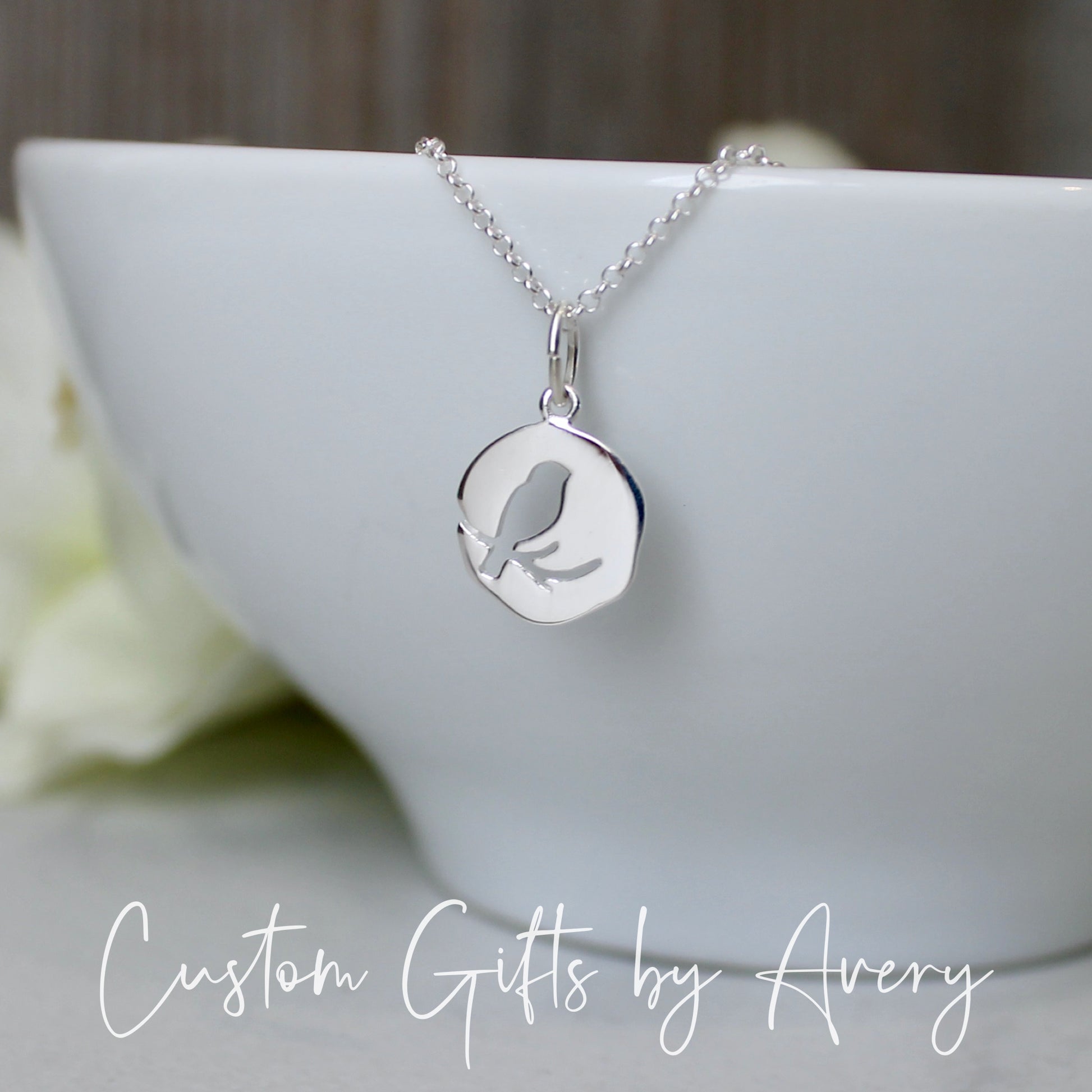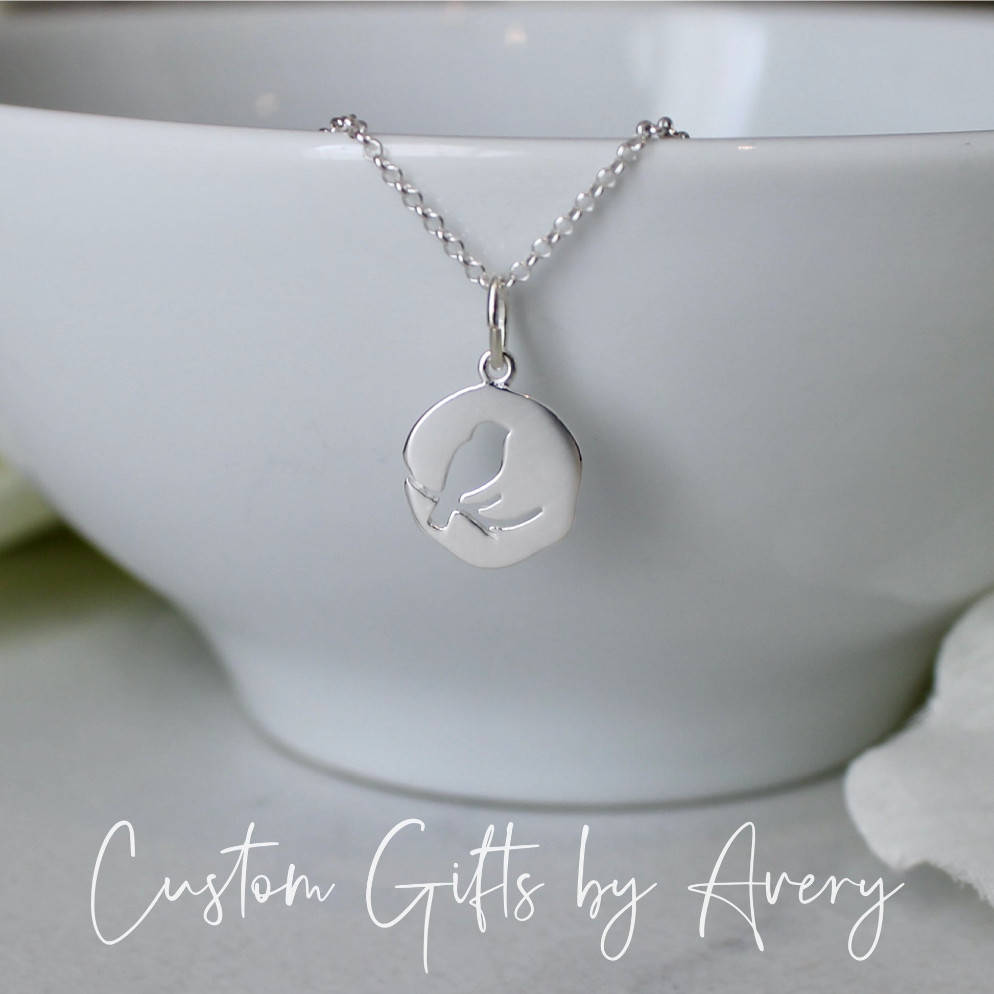 Crafted in solid .925 sterling silver, this dainty pendant is an organic circular shape. This bird on a branch necklace is beautiful for layering and perfect for everyday wear.