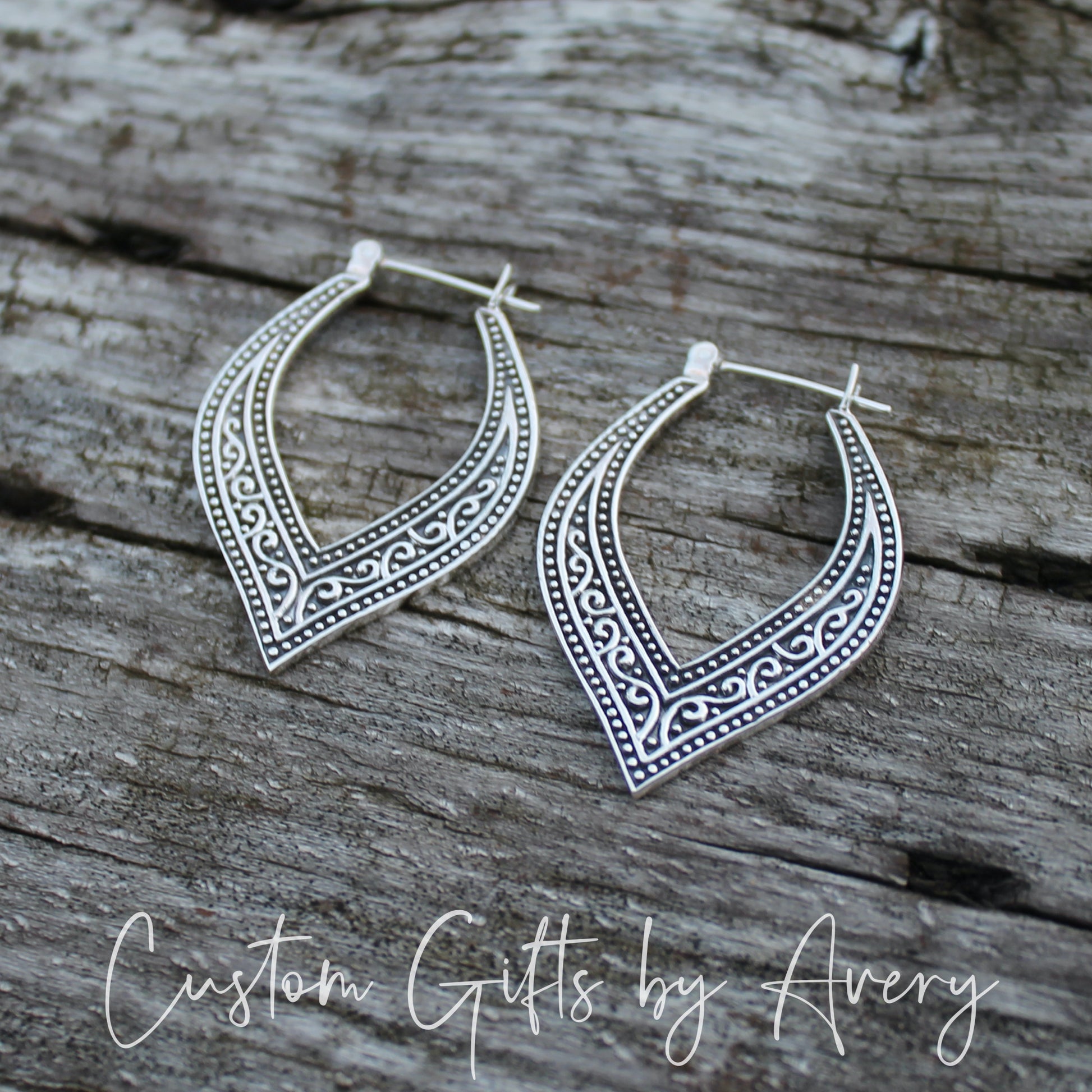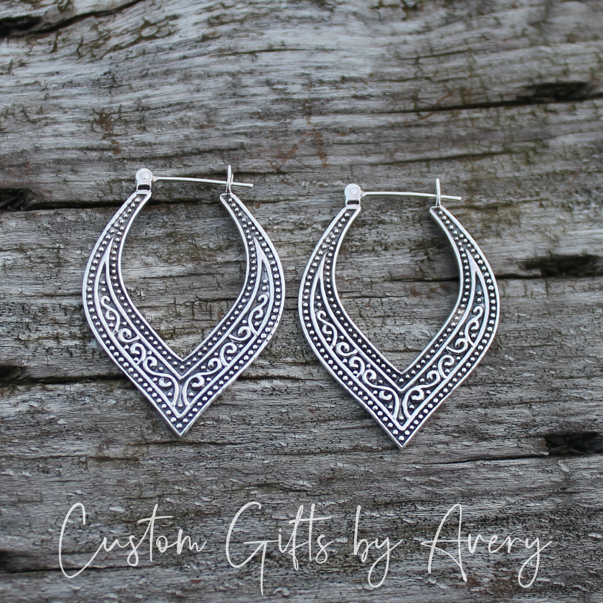 Gorgeous bohemian style hoops crafted in solid .925 sterling silver. These hoops are oxidized to bring out the beautiful swirled detailing.