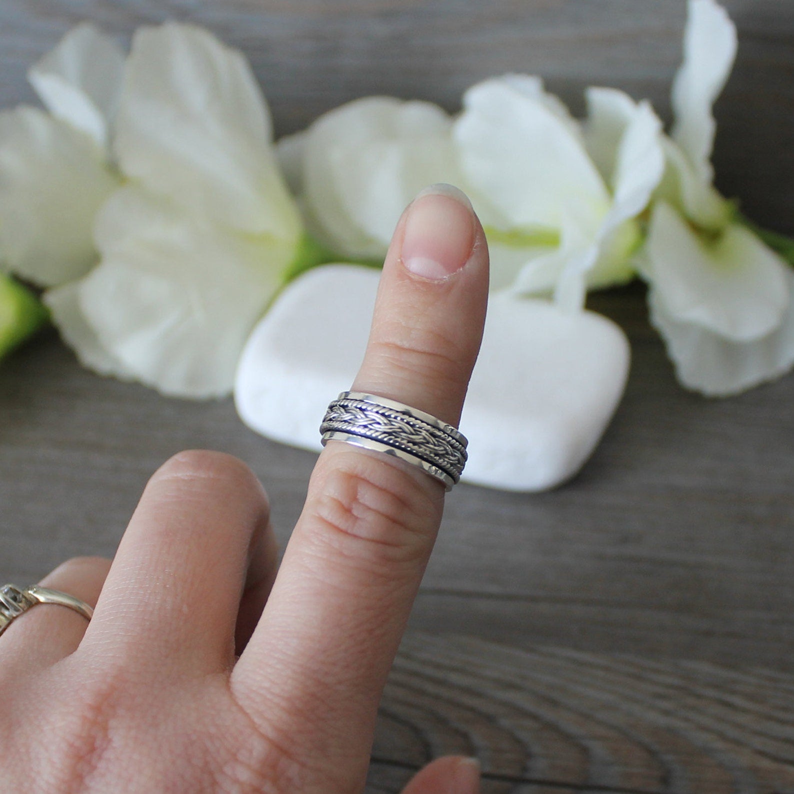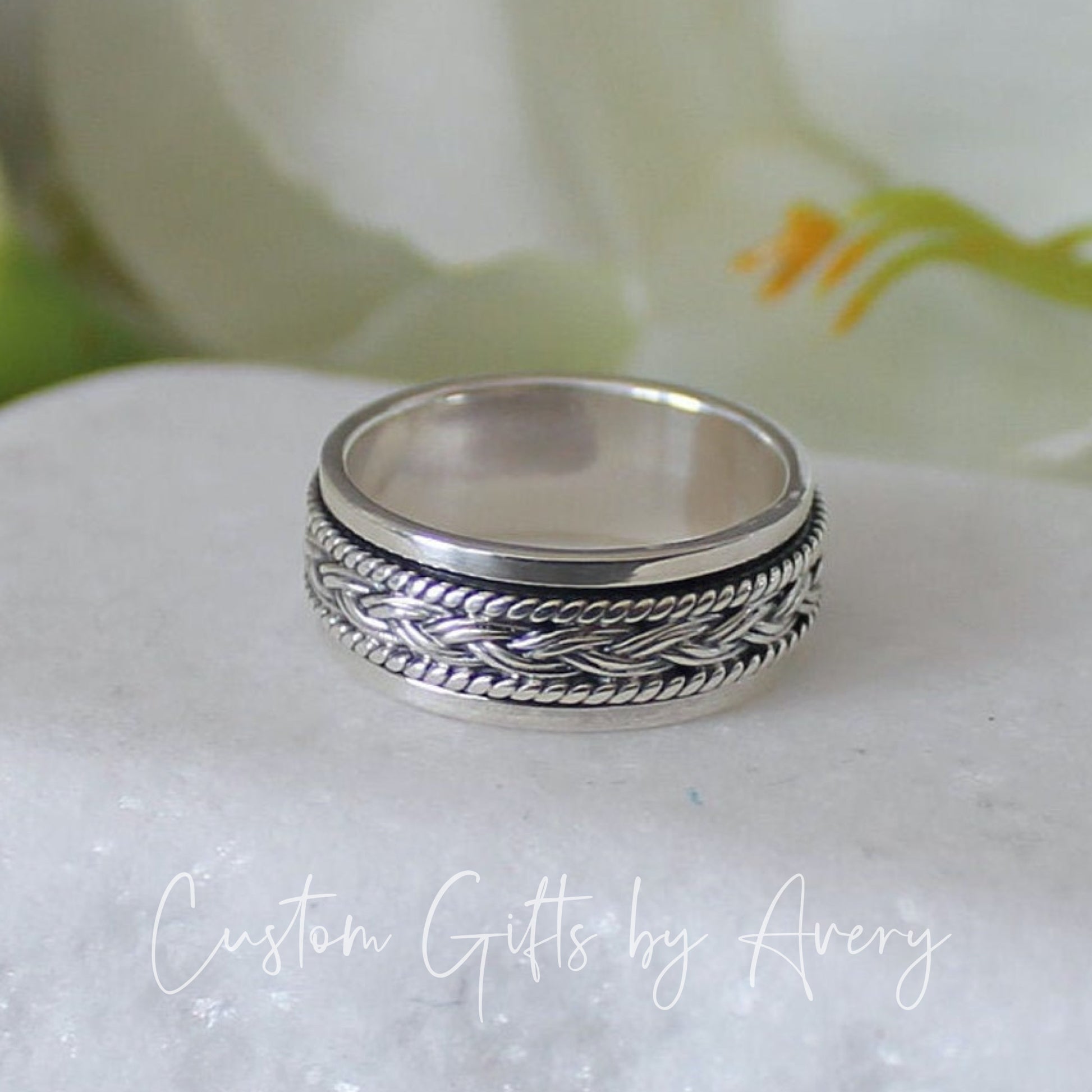 Celtic knots are have no start or finish. They are said to represent eternity, be it in loyalty, faith, friendship or love. This Celtic weave spins around the the band. The spinner ring is believed to come from ancient Tibetan meditation traditions, and is called a "worry ring" because spinning the right is believed to have a calming effect on the mind and body. Spinner rings are designed to be fiddled with. They're a healthy, less obvious way to move your hands when you feel that you need to be fidgeting. You simply spin the center ring with your fingers and take deep breaths to experience a calm, more meditative state.