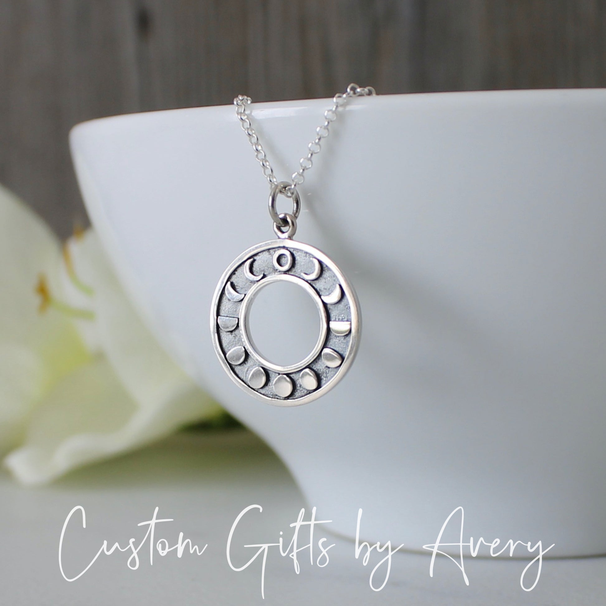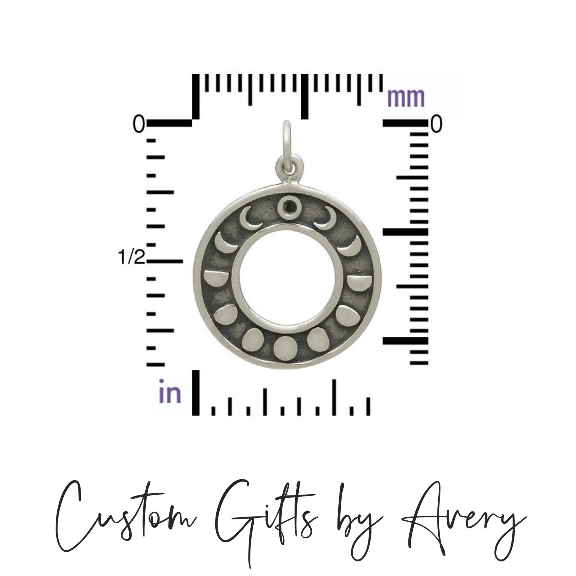 Crafted in sterling silver, this circular moon phases pendant shows the never ending cycle of the moon. Each phase of the moon has its own special meaning - from new beginnings, to setting intentions, taking action, and letting go. The brightly polished moon phases stand raised above the darker oxidized silver background.