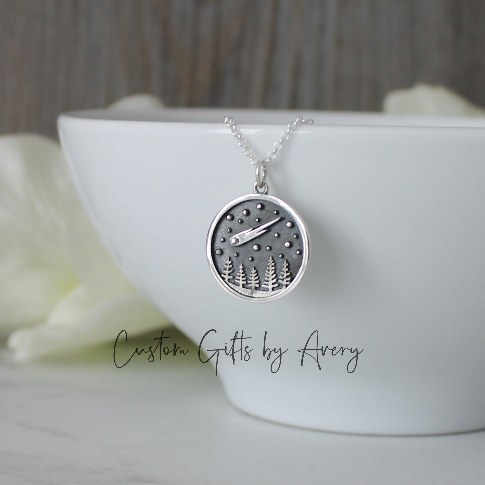 Crafted in solid .925 sterling silver this pendant features a shooting star streaking through the night sky above a forest of trees. It has been oxidized in areas to highlight the detailing.