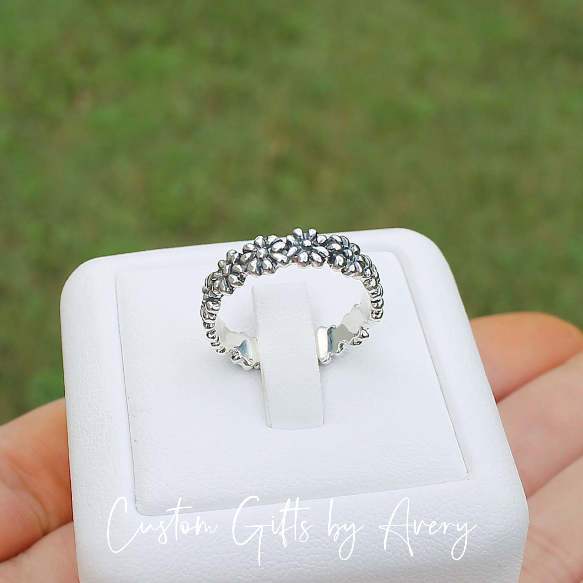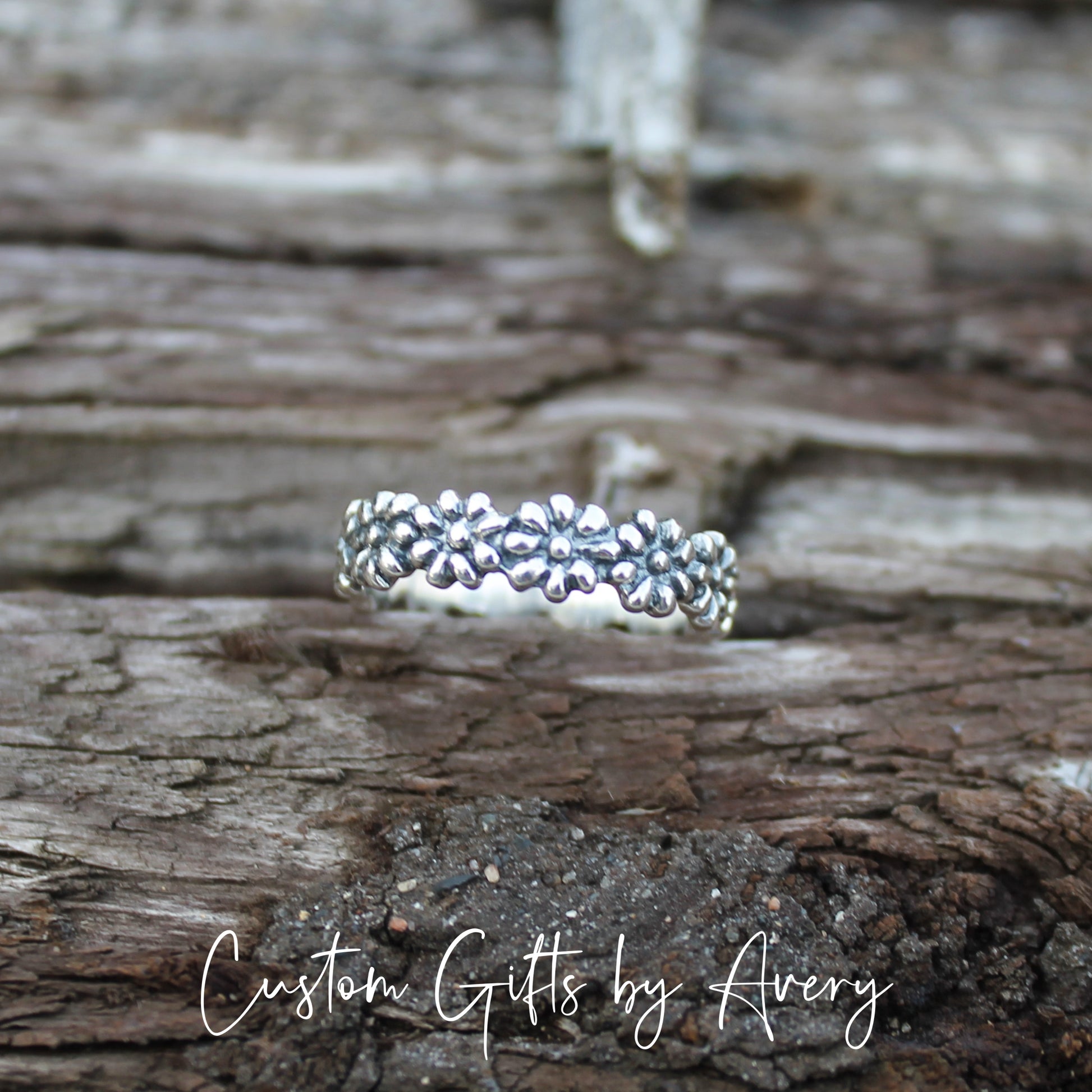 Crafted in solid .925 sterling silver, this ring features a chain of daisies that circle around your finger. This ring is approximately 5mm in width.