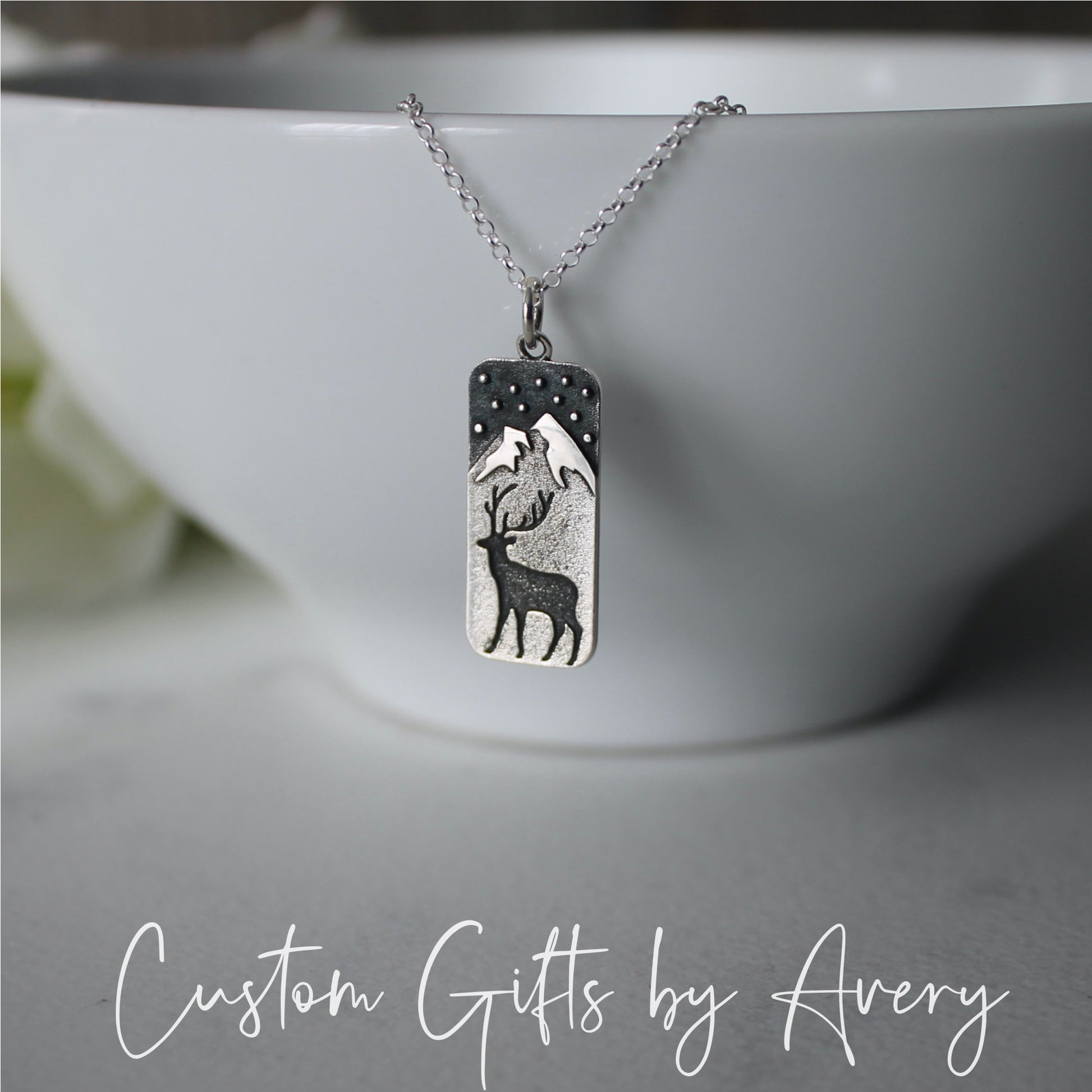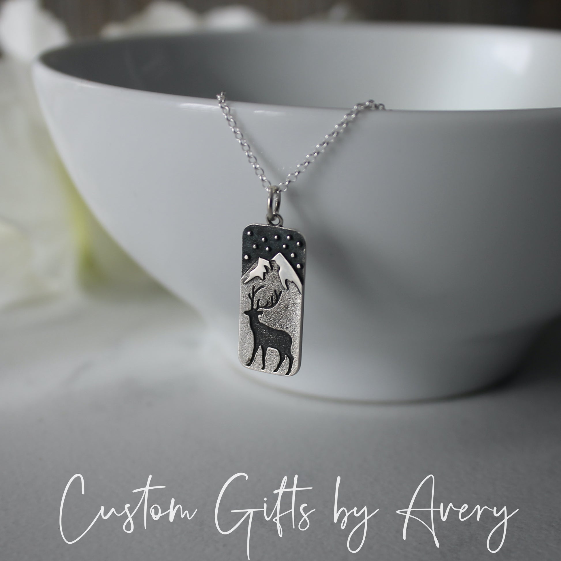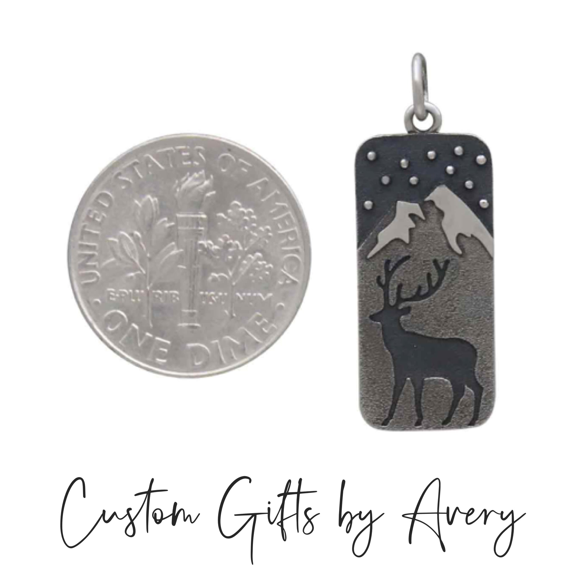 Crafted in recycled .925 sterling silver this pendant features the silhouette of a deer in the foreground of a beautiful snow capped mountain scene. This pendant has multiple layers with varying degrees of oxidization. The darkest layer is the creates the black night sky with a light grey mountain layer imposed on top. At the front is the darkened silhouette of the deer. The topmost raised surfaces are the brightly polished snow caps on the mountain and twinkling stars.
