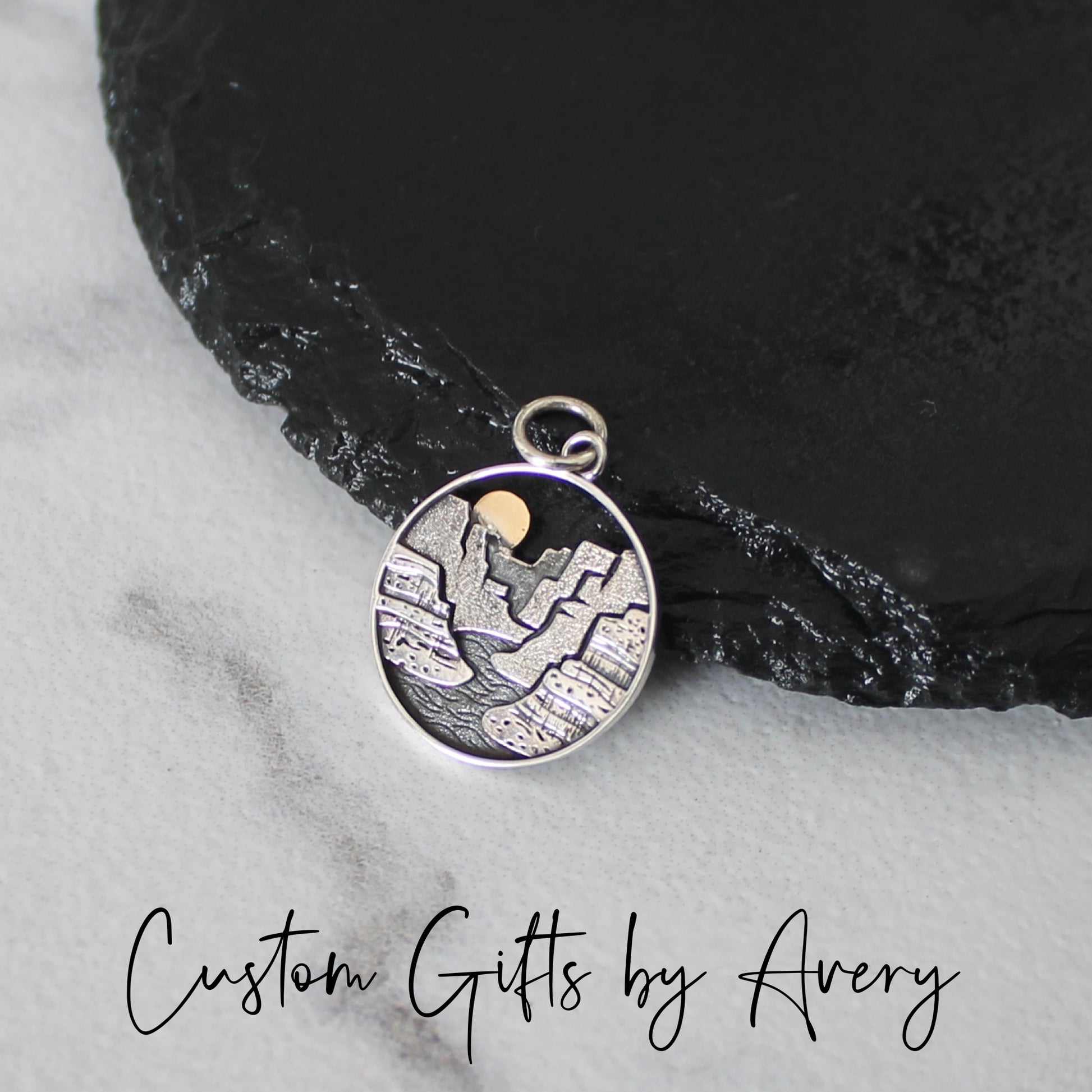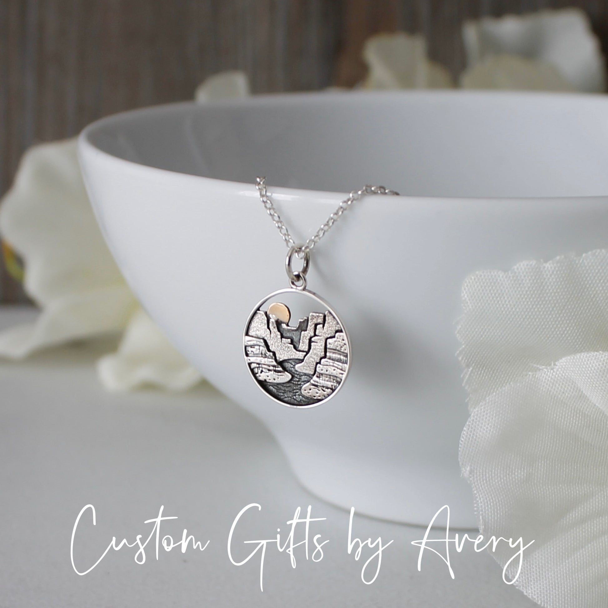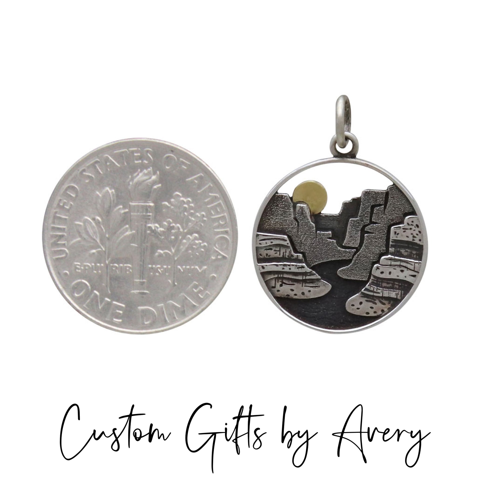 Crafted in sterling silver, this modern mixed metal necklace features a gorgeous mountain canyon scene. The oxidized and textured mountain stand out against the brightly polished bronze sun. Is it a sun rise or sun set? You will have to decide for yourself.