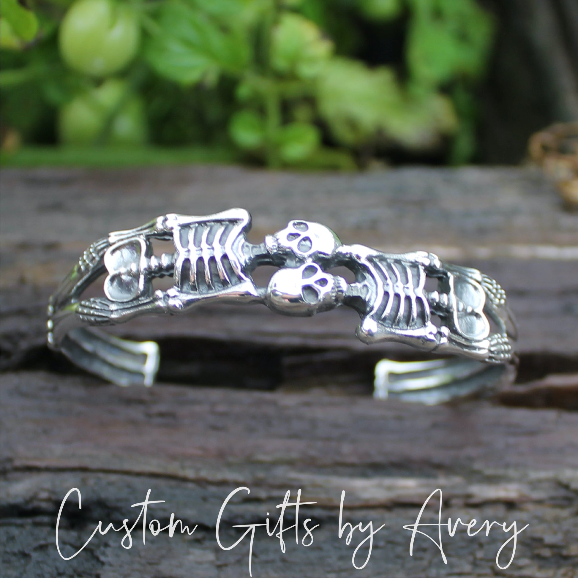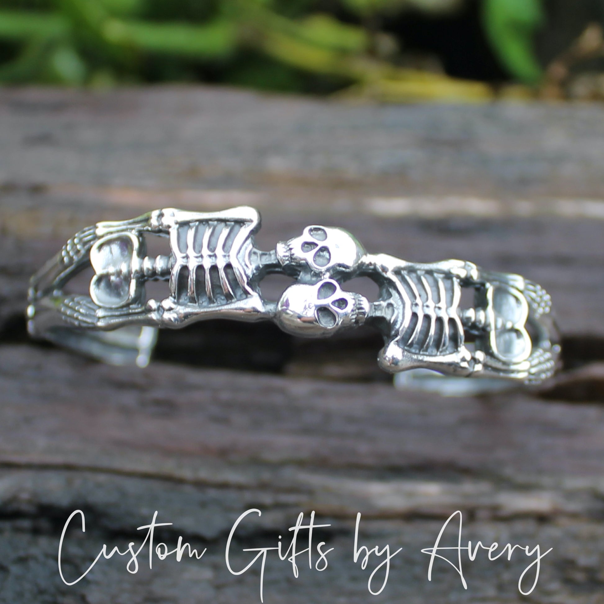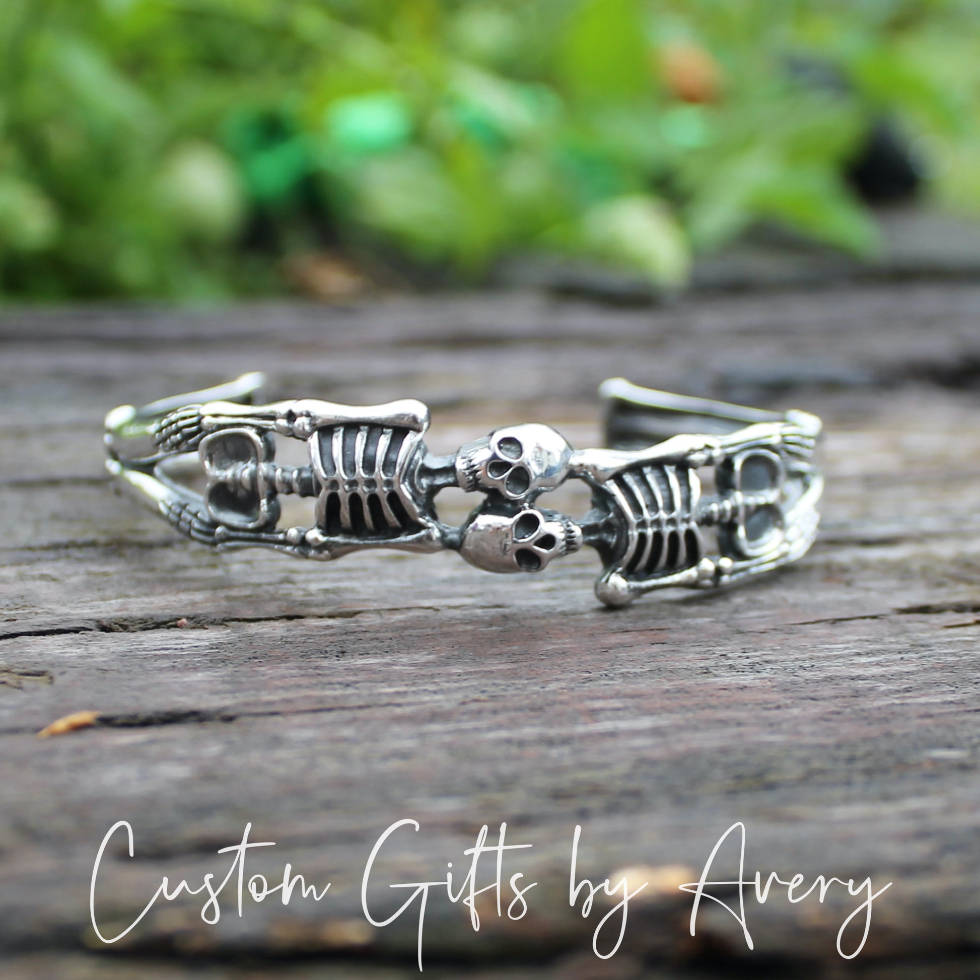 This incredibly detailed double skeleton cuff bracelet is crafted in solid .925 sterling silver. With 22 grams of silver, this bracelet has a beautiful weight and feel to it. This cuff is oxidized to highlight the intricate details of the bones. It is hallmarked on the inside of the cuff.