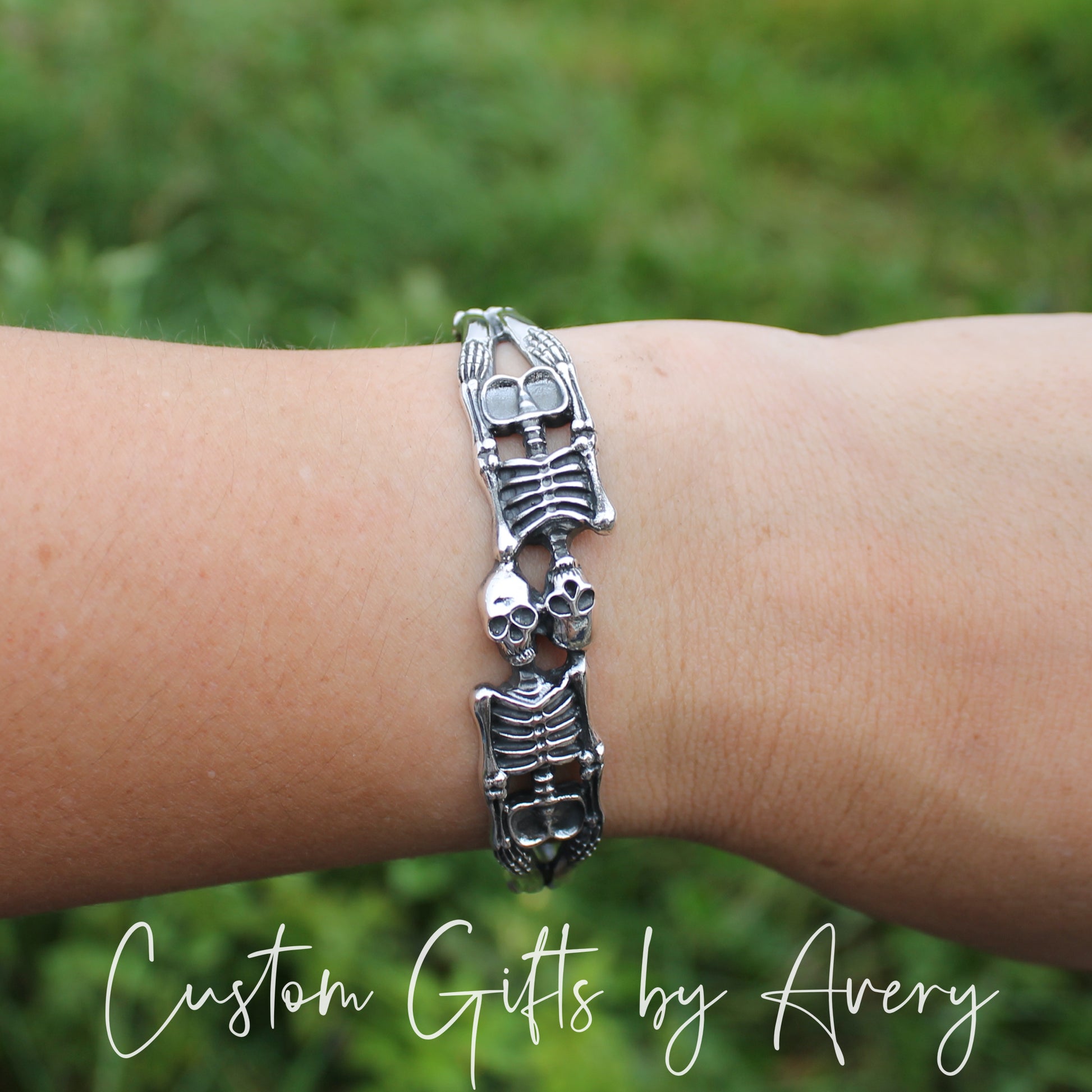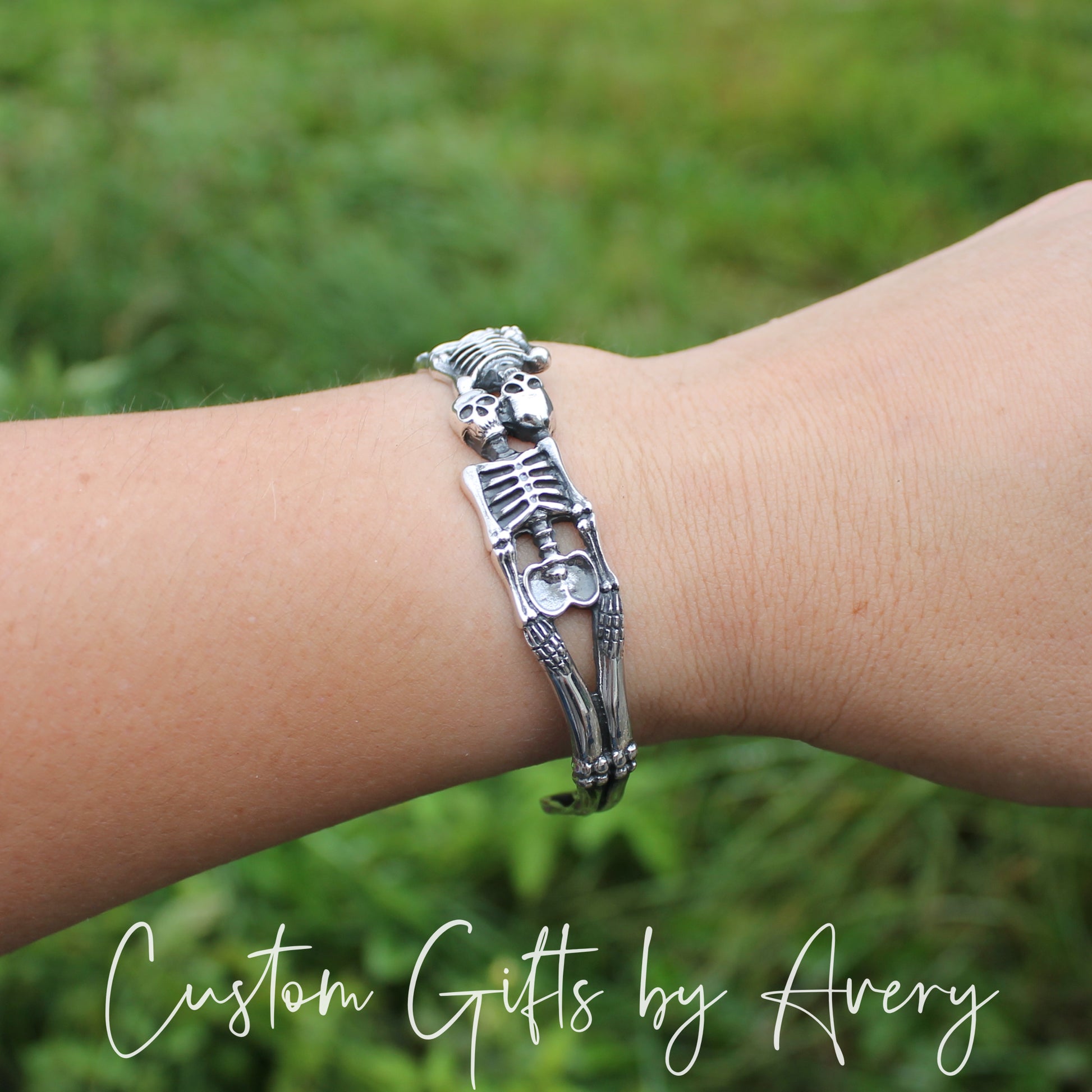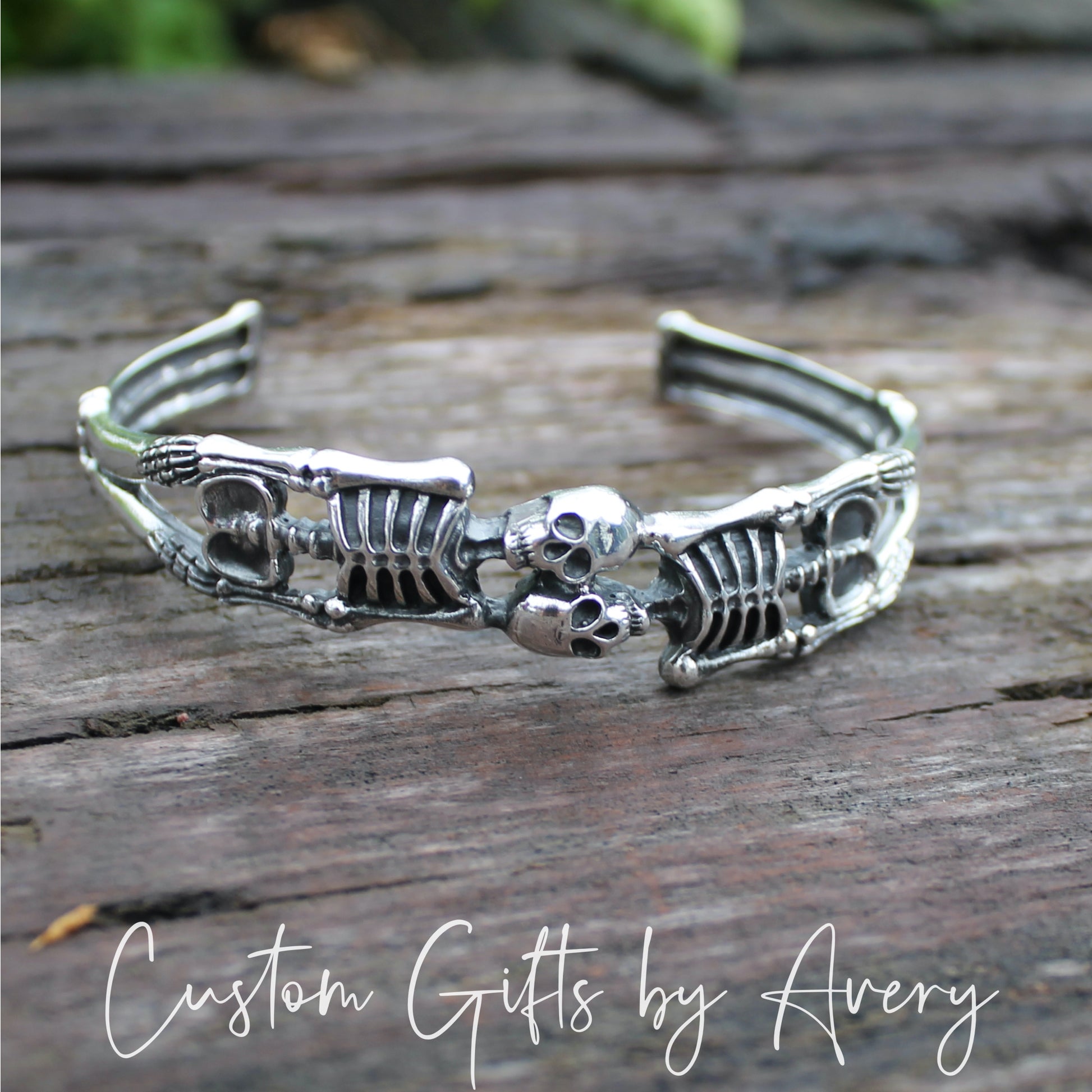 This incredibly detailed double skeleton cuff bracelet is crafted in solid .925 sterling silver. With 22 grams of silver, this bracelet has a beautiful weight and feel to it. This cuff is oxidized to highlight the intricate details of the bones. It is hallmarked on the inside of the cuff.