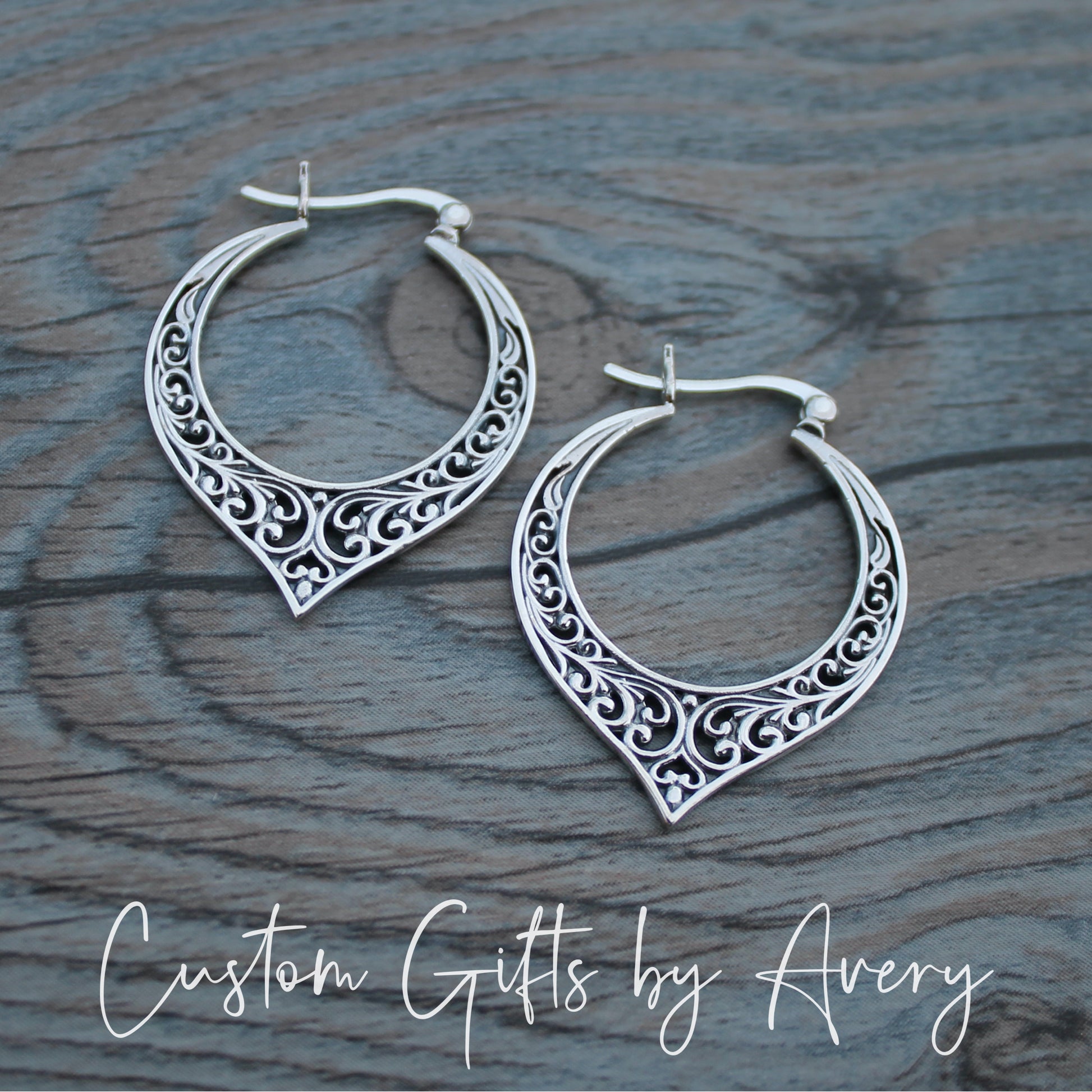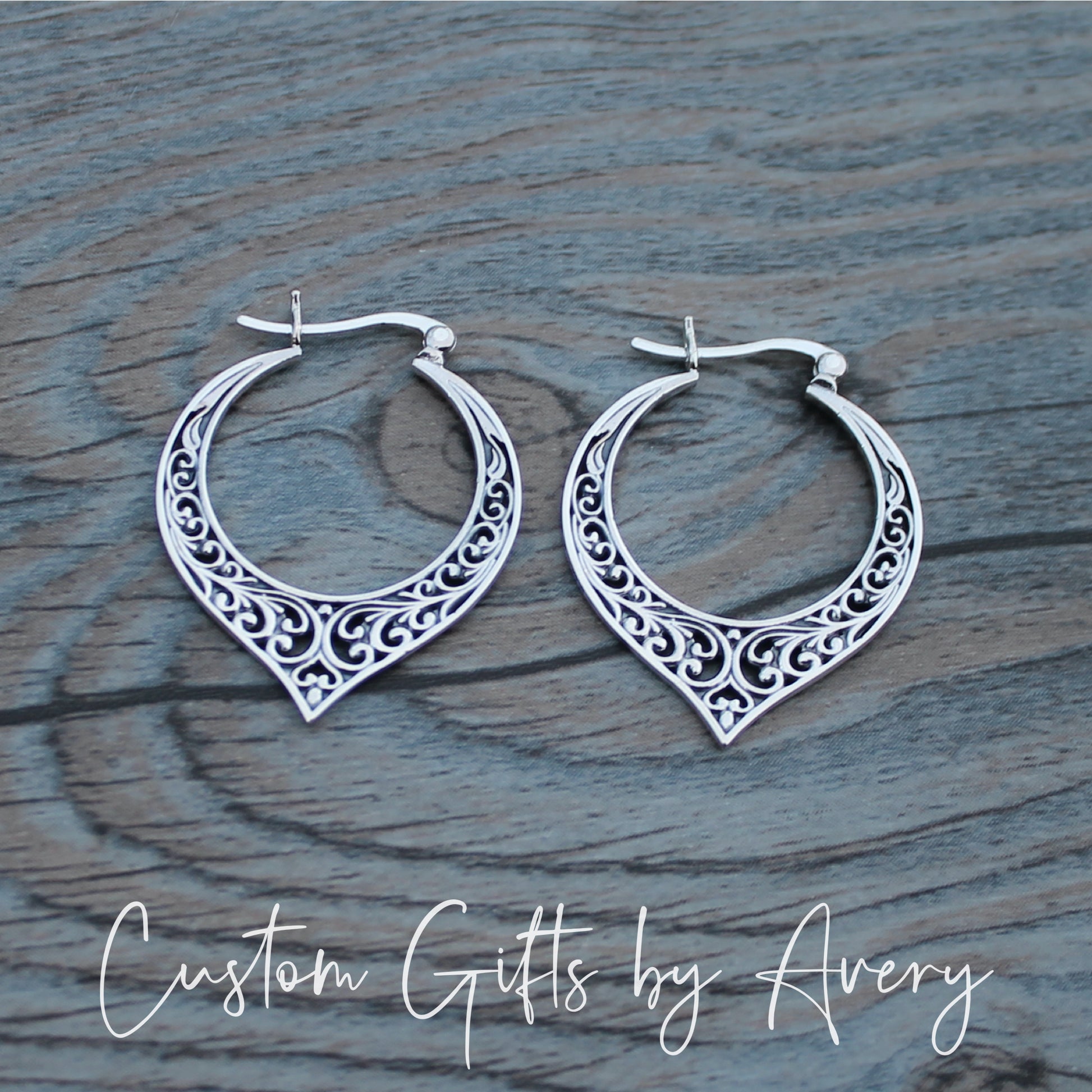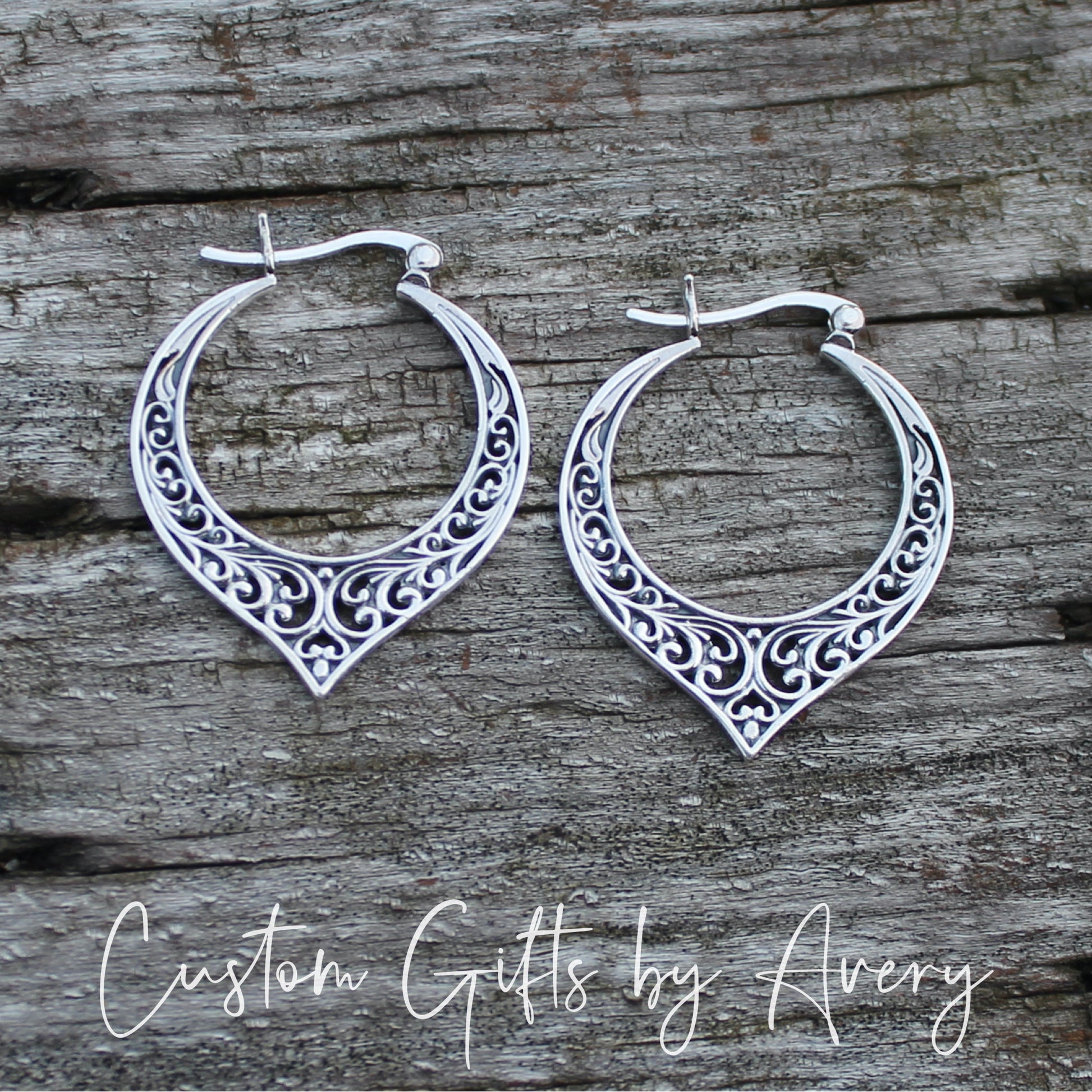 Gorgeous filigree style hoops crafted in solid .925 sterling silver. These hoops are oxidized to bring out the beautiful swirled detailing.