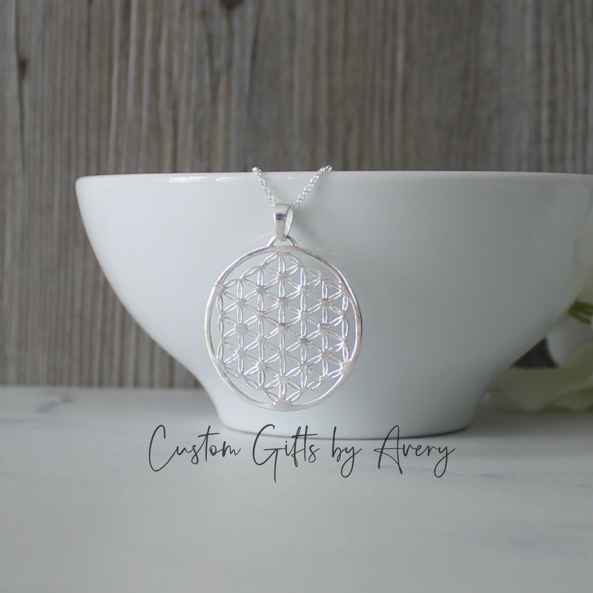 An intricate flower of life pendant crafted in solid .925 sterling silver. The flower of life is a series of overlapping circles that for a flower like grid. All geometric forms can be found within it, thus its use as a blueprint for more complex sacred geometry shapes. It symbolizes creation and is a reminder of the unity of everything ~ we are all built from the same blueprint.
